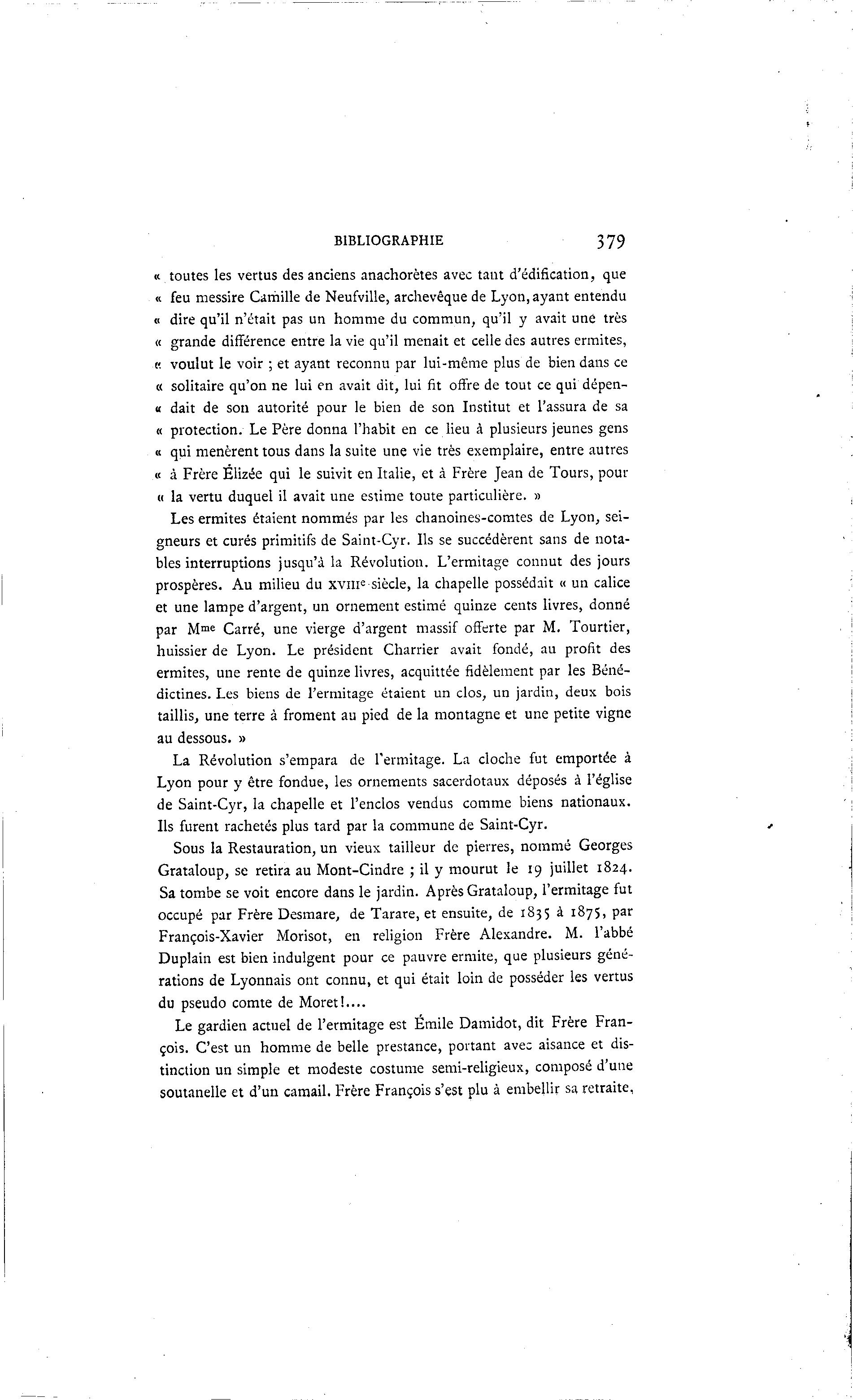 BIBLIOGRAPHIE 379 «toutes les vertus des anciens anachorètes avec tant d'édification, que « feu messire Camille de Neufville, archevêque de Lyon, ayant entendu « dire qu'il n'était pas un homme du commun, qu'il y avait une très « grande différence entre la vie qu'il menait et celle des autres ermites, K voulut le voir ; et ayant reconnu par lui-même plus de bien dans ce « solitaire qu'on ne lui en avait dit, lui fit offre de tout ce qui dépen- « dait de son autorité pour le bien de son Institut et l'assura de sa « protection. Le Père donna l'habit en ce lieu à plusieurs jeunes gens « qui menèrent tous dans la suite une vie très exemplaire, entre autres « à Frère Elizée qui le suivit en Italie, et à Frère Jean de Tours, pour « la vertu duquel il avait une estime toute particulière. » Les ermites étaient nommés par les chanoines-comtes de Lyon, sei- gneurs et curés primitifs de Saint-Cyr. Ils se succédèrent sans de nota- bles interruptions jusqu'à la Révolution. L'ermitage connut des jours prospères. Au milieu du xvm e siècle, la chapelle possédait « un calice et une lampe d'argent, un ornement estimé quinze cents livres, donné par Mme Carré, une vierge d'argent massif offerte par M. Tourtier, huissier de Lyon. Le président Charrier avait fondé, au profit des ermites, une rente de quinze livres, acquittée fidèlement par les Béné- dictines. Les biens de l'ermitage étaient un clos, un jardin, deux bois taillis, une terre à froment au pied de la montagne et une petite vigne au dessous. » La Révolution s'empara de l'ermitage. La cloche fut emportée à Lyon pour y être fondue, les ornements sacerdotaux déposés à l'église de Saint-Cyr, la chapelle et l'enclos vendus comme biens nationaux. Ils furent rachetés plus tard par la commune de Saint-Cyr. Sous la Restauration, un vieux tailleur de pierres, nommé Georges Grataloup, se retira au Mont-Cindre ; il y mourut le 19 juillet 1824. Sa tombe se voit encore dans le jardin. Après Grataloup, l'ermitage fut occupé par Frère Desmare, de Tarare, et ensuite, de 1835 à 1875, par François-Xavier Morisot, en religion Frère Alexandre. M. l'abbé Duplain est bien indulgent pour ce pauvre ermite, que plusieurs géné- rations de Lyonnais ont connu, et qui était loin de posséder les vertus du pseudo comte de Moret!.... Le gardien actuel de l'ermitage est Emile Damidot, dit Frère Fran- çois. C'est un homme de belle prestance, portant avec aisance et dis- tinction un simple et modeste costume semi-religieux, composé d'une soutanelle et d'un camail. Frère François s'est plu à embellir sa retraite,