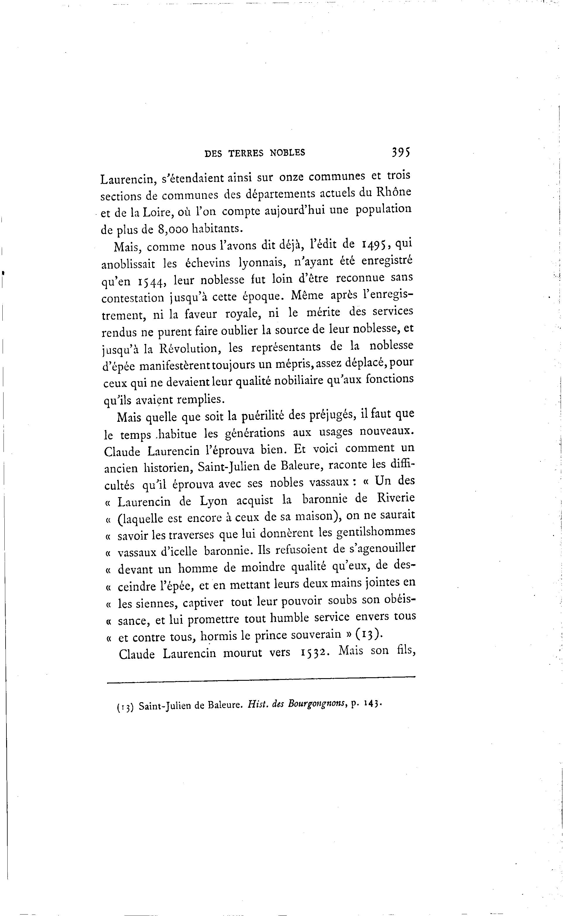 DES TERRES NOBLES 395 Laurencin, s'étendaient ainsi sur onze communes et trois sections de communes des départements actuels du Rhône et de la Loire, où l'on compte aujourd'hui une population de plus de 8,000 habitants. Mais, comme nous l'avons dit déjà , l'édit de 1495, qui anoblissait les échevins lyonnais, n'ayant été enregistré qu'en 1544, leur noblesse fut loin d'être reconnue sans contestation jusqu'à cette époque. Même après l'enregis- trement, ni la faveur royale, ni le mérite des services rendus ne purent faire oublier la source de leur noblesse, et jusqu'à la Révolution, les représentants de la noblesse d'épée manifestèrent toujours un mépris, assez déplacé, pour ceux qui ne devaient leur qualité nobiliaire qu'aux fonctions qu'ils avaient remplies. Mais quelle que soit la puérilité des préjugés, il faut que le temps .habitue les générations aux usages nouveaux. Claude Laurencin l'éprouva bien. Et voici comment un ancien historien, Saint-Julien de Baleure, raconte les diffi- cultés qu'il éprouva avec ses nobles vassaux : « Un des « Laurencin de Lyon acquist la baronnie de Riverie « (laquelle est encore à ceux de sa maison), on ne saurait « savoir les traverses que lui donnèrent les gentilshommes « vassaux d'icelle baronnie. Ils refusoient de s'agenouiller « devant un homme de moindre qualité qu'eux, de des- « ceindre l'épée, et en mettant leurs deux mains jointes en « les siennes, captiver tout leur pouvoir soubs son obéis- « sance, et lui promettre tout humble service envers tous « et contre tous, hormis le prince souverain » (13). Claude Laurencin mourut vers 1532. Mais son fils, (13) Saint-Julien de Baleure. Hist. des Bourgongnons, p. 143.