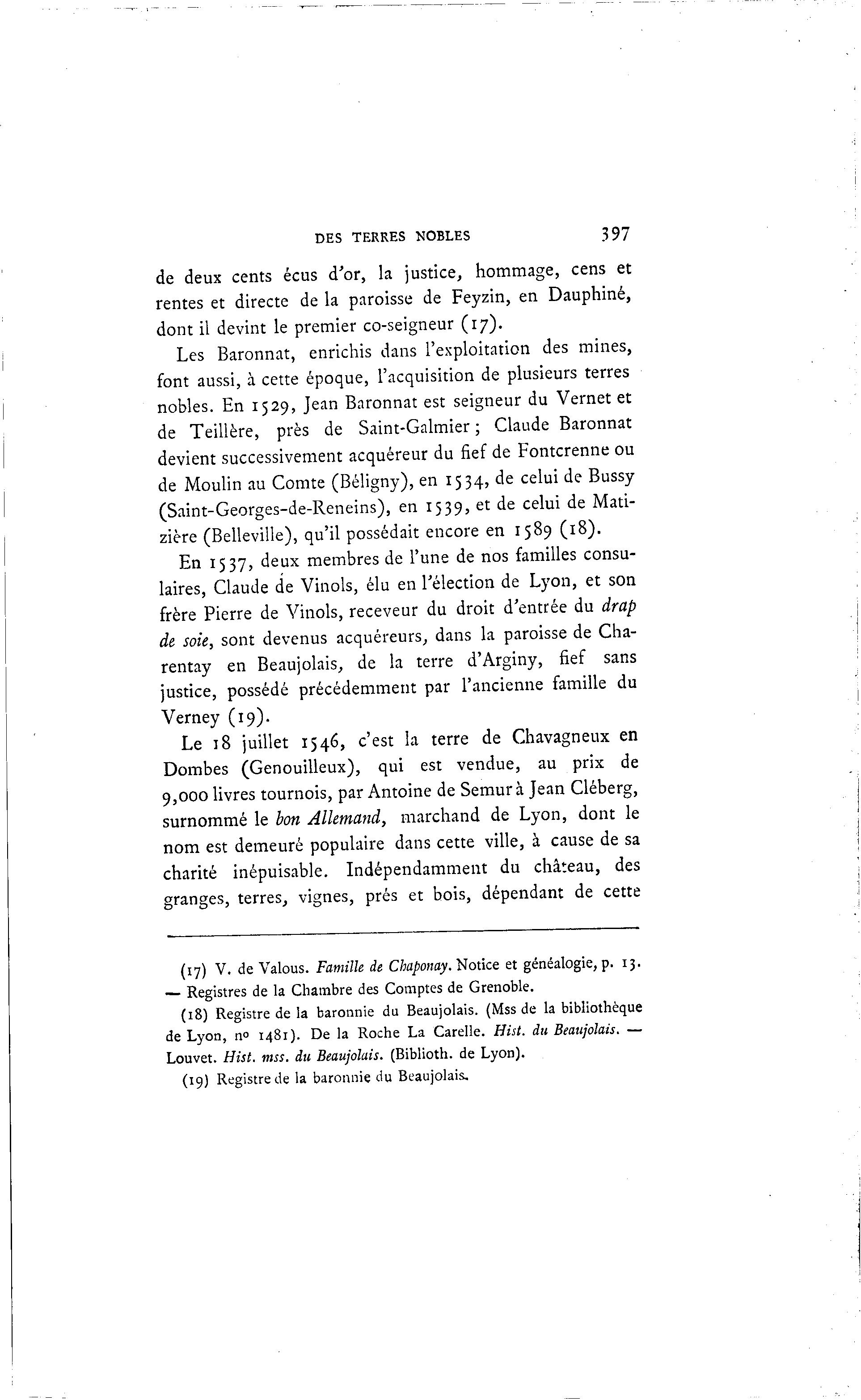 DES TERRES NOBLES 397 de deux cents écus d'or, la justice, hommage, cens et rentes et directe de la paroisse de Feyzin, en Dauphiné, dont il devint le premier co-seigneur (17). Les Baronnat, enrichis dans l'exploitation des mines, font aussi, à cette époque, l'acquisition de plusieurs terres nobles. En 1529, Jean Baronnat est seigneur du Vernet et de Teillère, près de Saint-Galmier ; Claude Baronnat devient successivement acquéreur du fief de Fontcrenne ou de Moulin au Comte (Béligny), en 1534, de celui de Bussy (Saint-Georges-de-Reneins), en 1539, et de celui de Mati- zière (Belleville), qu'il possédait encore en 1589 (18). En 1537, deux membres de l'une de nos familles consu- laires, Claude de Vinols, élu en l'élection de Lyon, et son frère Pierre de Yinols, receveur du droit d'entrée du drap de soie, sont devenus acquéreurs, dans la paroisse de Cha- rentay en Beaujolais, de la terre d'Arginy, fief sans justice, possédé précédemment par l'ancienne famille du Verney (19). Le 18 juillet 1546, c'est la terre de Chavagneux en Dombes (Genouilleux), qui est vendue, au prix de 9,000 livres tournois, par Antoine de Semurà Jean Cléberg, surnommé le bon Allemand, marchand de Lyon, dont le nom est demeuré populaire dans cette ville, à cause de sa charité inépuisable. Indépendamment du château, des granges, terres, vignes, prés et bois, dépendant de cette (17) V. de Valous. Famille de Chaponay. Notice et généalogie, p. 13. — Registres de la Chambre des Comptes de Grenoble. (18) Registre de la baronnie du Beaujolais. (Mss de la bibliothèque de Lyon, n° 1481). De la Roche La Carelle. Hist. du Beaujolais. — Louvet. Hist, mss. du Beaujolais. (Biblioth. de Lyon). (19) Registre de la baronnie du Beaujolais.