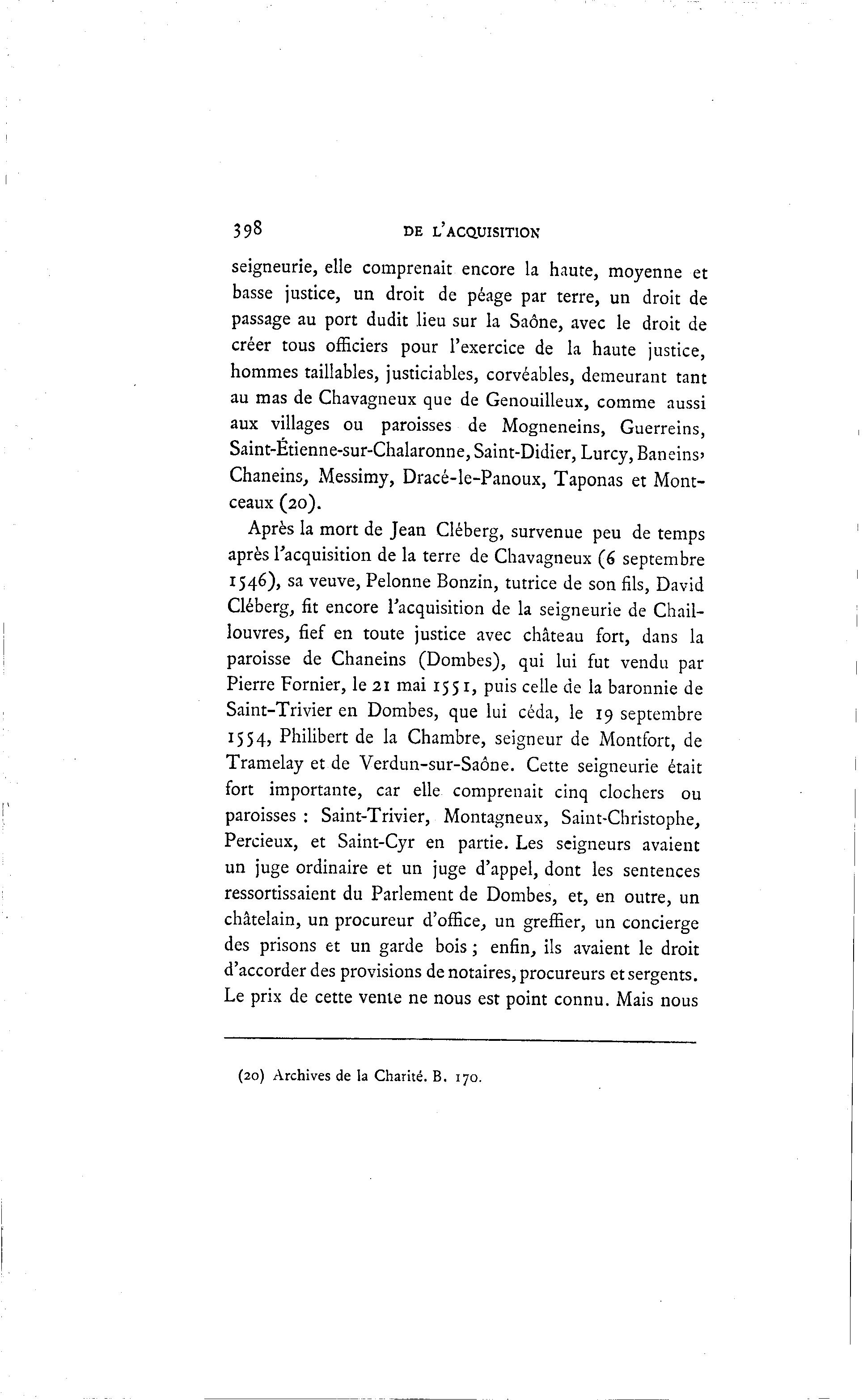 398 DE L'ACQUISITION seigneurie, elle comprenait encore la haute, moyenne et basse justice, un droit de péage par terre, un droit de passage au port dudit lieu sur la Saône, avec le droit de créer tous officiers pour l'exercice de la haute justice, hommes taillables, justiciables, corvéables, demeurant tant au mas de Chavagneux que de Genouilleux, comme aussi aux villages ou paroisses de Mogneneins, Guerreins, Saint-Etienne-sur-Chalaronne, Saint-Didier, Lurcy, Baneins' Chaneins, Messimy, Dracé-le-Panoux, Taponas et Mont- ceaux (20). Après la mort de Jean Cléberg, survenue peu de temps après l'acquisition de la terre de Chavagneux (6 septembre 1546), sa veuve, Pelonne Bonzin, tutrice de son fils, David Cléberg, fit encore l'acquisition de la seigneurie de Chail- louvres, fief en toute justice avec château fort, dans la paroisse de Chaneins (Dombes), qui lui fut vendu par Pierre Former, le 21 mai 1551, puis celle de la baronnie de Saint-Trivier en Dombes, que lui céda, le 19 septembre 1554, Philibert de la Chambre, seigneur de Montfort, de Tramelay et de Verdun-sur-Saône. Cette seigneurie était fort importante, car elle comprenait cinq clochers ou paroisses : Saint-Trivier, Montagneux, Saint-Christophe, Percieux, et Saint-Cyr en partie. Les seigneurs avaient un juge ordinaire et un juge d'appel, dont les sentences ressortissaient du Parlement de Dombes, et, en outre, un châtelain, un procureur d'office, un greffier, un concierge des prisons et un garde bois ; enfin, ils avaient le droit d'accorder des provisions de notaires, procureurs et sergents. Le prix de cette vente ne nous est point connu. Mais nous (20) Archives de la Charité. B. 170.