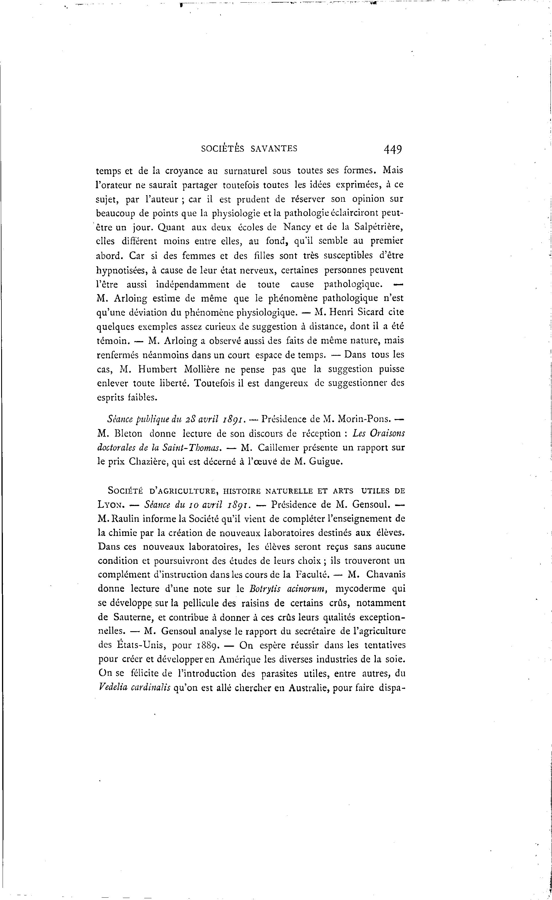 SOCIÉTÉS SAVANTES 449 temps et de la croyance au surnaturel sous toutes ses formes. Mais l'orateur ne saurait partager toutefois toutes les idées exprimées, à ce sujet, par l'auteur ; car il est prudent de réserver son opinion sur beaucoup de points que la physiologie et la pathologie éclairciront peut- être un jour. Quant aux deux écoles de Nancy et de la Salpétrière, elles différent moins entre elles, au fond, qu'il semble au premier abord. Car si des femmes et des filles sont très susceptibles d'être hypnotisées, à cause de leur état nerveux, certaines personnes peuvent l'être aussi indépendamment de toute cause pathologique. — M. Arloing estime de même que le phénomène pathologique n'est qu'une déviation du phénomène physiologique. — M. Henri Sicard cite quelques exemples assez curieux de suggestion à distance, dont il a été témoin. — M. Arloing a observé aussi des faits de même nature, mais renfermés néanmoins dans un court espace de temps. — Dans tous les cas, M. Humbert Mollière ne pense pas que la suggestion puisse enlever toute liberté. Toutefois il est dangereux de suggestionner des esprits faibles. Séance publique du 2S avril 1891. — Présidence de M. Morin-Pons. — M. Bleton donne lecture de son discours de réception : Les Oraisons doctorales de la Saint-Thomas. — M. Caillemer présente un rapport sur le prix Chazière, qui est décerné à l'œuvé de M. Guigue. SOCIÉTÉ D'AGRICULTURE, HISTOIRE NATURELLE ET ARTS UTILES DE LYON. — Séance du 10 avril 1891. — Présidence de M. Gensoul. — M. Raulin informe la Société qu'il vient de compléter l'enseignement de la chimie par la création de nouveaux laboratoires destinés aux élèves. Dans ces nouveaux laboratoires, les élèves seront reçus sans aucune condition et poursuivront des études de leurs choix ; ils trouveront un complément d'instruction dans les cours de la Faculté.— M. Chavanis donne lecture d'une note sur le Botrylis acinorum, mycoderme qui se développe sur la pellicule des raisins de certains crûs, notamment de Sauterne, et contribue à donner à ces crûs leurs qualités exception- nelles. — M. Gensoul analyse le rapport du secrétaire de l'agriculture des Etats-Unis, pour 1889. — On espère réussir dans les tentatives pour créer et développer en Amérique les diverses industries de la soie. On se félicite de l'introduction des parasites utiles, entre autres, du Vedelia cardinalis qu'on est allé chercher en Australie, pour faire dispa-