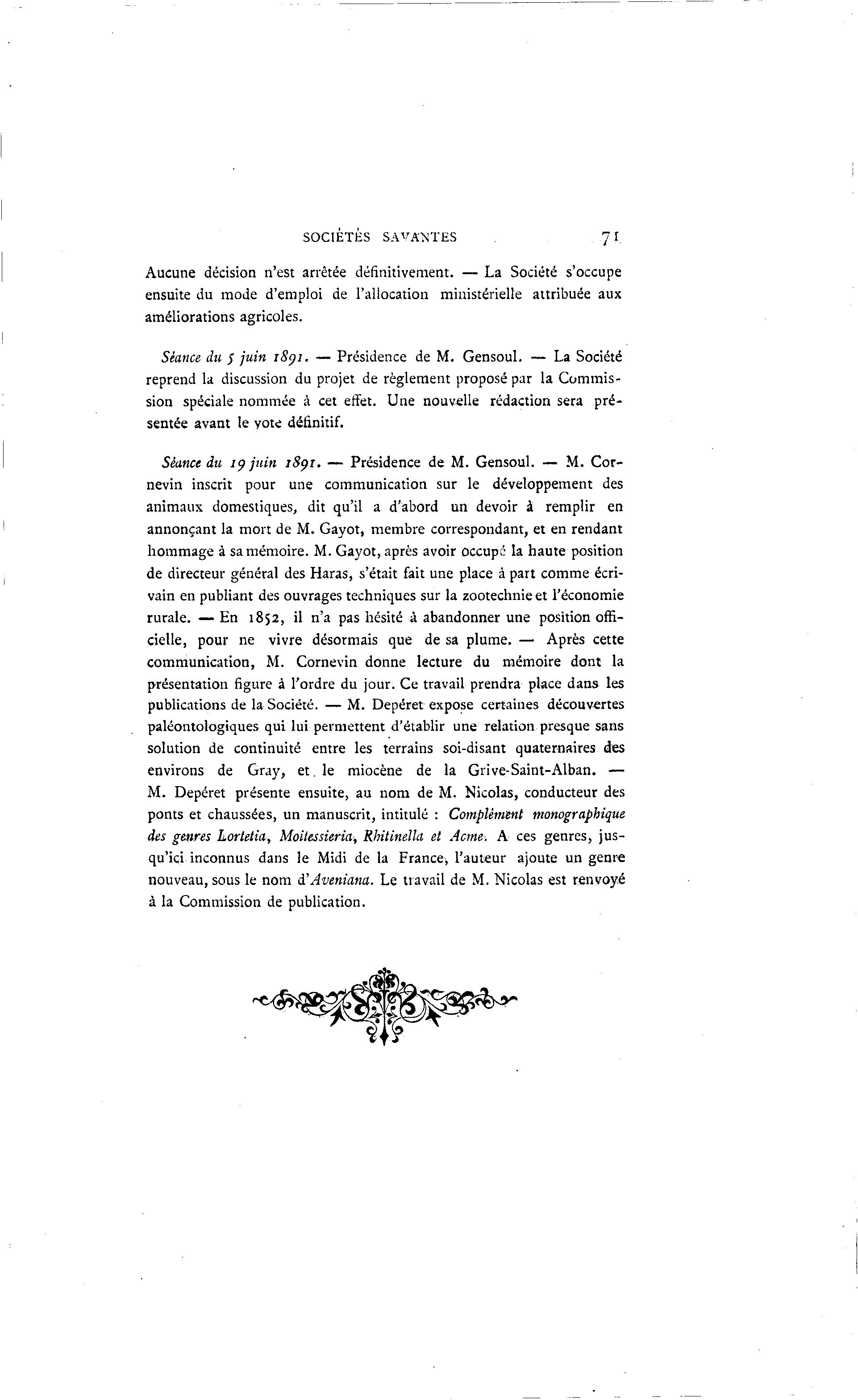 SOCIETES SAVANTES 71. Aucune décision n'est arrêtée définitivement. — La Société s'occupe ensuite du mode d'emploi de l'allocation ministérielle attribuée aux améliorations agricoles. Séance du S juin i8gi. — Présidence de M. Gensoul. — La Société reprend la discussion du projet de règlement proposé par la Commis- sion spéciale nommée à cet effet. Une nouvelle rédaction sera pré- sentée avant le yote définitif. Séance du 19 juin 1891. — Présidence de M. Gensoul. — M. Cor- nevin inscrit pour une communication sur le développement des animaux domestiques, dit qu'il a d'abord un devoir à remplir en annonçant la mort de M. Gayot, membre correspondant, et en rendant hommage à sa mémoire. M. Gayot, après avoir occupé la haute position de directeur général des Haras, s'était fait une place à part comme écri- vain en publiant des ouvrages techniques sur la zootechnie et l'économie rurale. — En 1852, il n'a pas hésité à abandonner une position offi- cielle, pour ne vivre désormais que de sa plume. — Après cette communication, M. Cornevin donne lecture du mémoire dont la présentation figure à l'ordre du jour. Ce travail prendra place dans les publications de la Société. — M. Depéret expose certaines découvertes paléontologiques qui lui permettent d'établir une relation presque sans solution de continuité entre les terrains soi-disant quaternaires des environs de Gray, et. le miocène de la Grive-Saint-Alban. — M. Depéret présente ensuite, au nom de M. Nicolas, conducteur des ponts et chaussées, un manuscrit, intitulé : Complément monographique des genres Lortetia, Moitessieria, Rhitinella et Acrne. A ces genres, jus- qu'ici inconnus dans le Midi de la France^ l'auteur ajoute un genre nouveau, sous le nom d'Aveniana. Le travail de M. Nicolas est renvoyé à la Commission de publication.