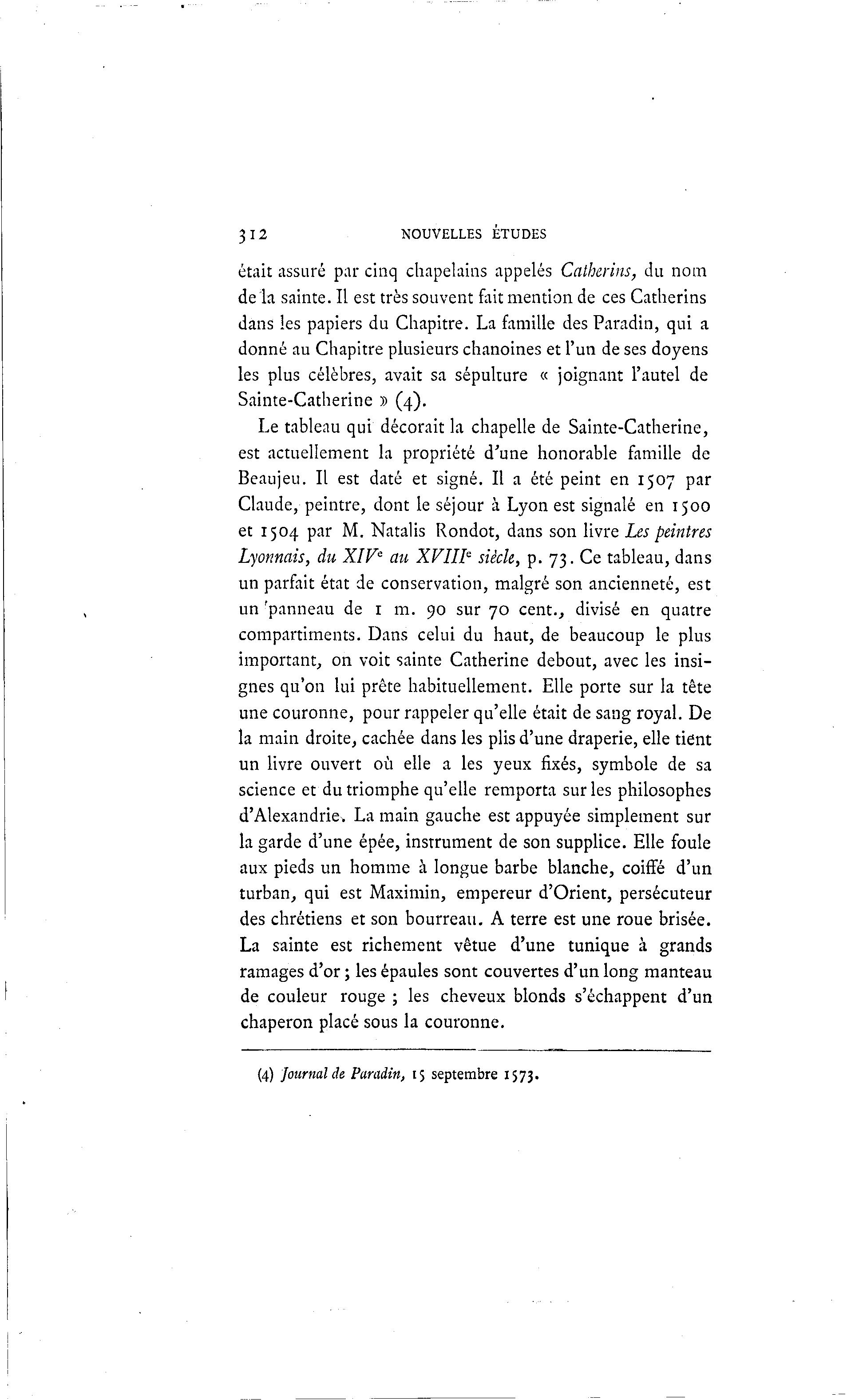 312 NOUVELLES ETUDES était assuré par cinq chapelains appelés Catherins, du nom de la sainte. Il est très souvent fait mention de ces Catherins dans les papiers du Chapitre. La famille des Paradin, qui a donné au Chapitre plusieurs chanoines et l'un de ses doyens les plus célèbres, avait sa sépulture « joignant l'autel de Sainte-Catherine » (4). Le tableau qui décorait la chapelle de Sainte-Catherine, est actuellement la propriété d'une honorable famille de Beaujeu. Il est daté et signé. Il a été peint en 1507 par Claude, peintre, dont le séjour à Lyon est signalé en 1500 et 1504 par M. Natalis Rondot, dans son livre Les peintres Lyonnais, du XIVe au XVIIIe siècle, p. 73. Ce tableau, dans un parfait état de conservation, malgré son ancienneté, est un 'panneau de r m. 90 sur 70 cent., divisé en quatre compartiments. Dans celui du haut, de beaucoup le plus important, on voit sainte Catherine debout, avec les insi- gnes qu'on lui prête habituellement. Elle porte sur la tête une couronne, pour rappeler qu'elle était de sang royal. De la main droite, cachée dans les plis d'une draperie, elle tient un livre ouvert où elle a les yeux fixés, symbole de sa science et du triomphe qu'elle remporta sur les philosophes d'Alexandrie* La main gauche est appuyée simplement sur la garde d'une épée, instrument de son supplice. Elle foule aux pieds un homme à longue barbe blanche, coiffé d'un turban, qui est Maximin, empereur d'Orient, persécuteur des chrétiens et son bourreau. A terre est une roue brisée. La sainte est richement vêtue d'une tunique à grands ramages d'or ; les épaules sont couvertes d'un long manteau de couleur rouge ; les cheveux blonds s'échappent d'un chaperon placé sous la couronne. (4) Journal de Paradin, 15 septembre 1573.