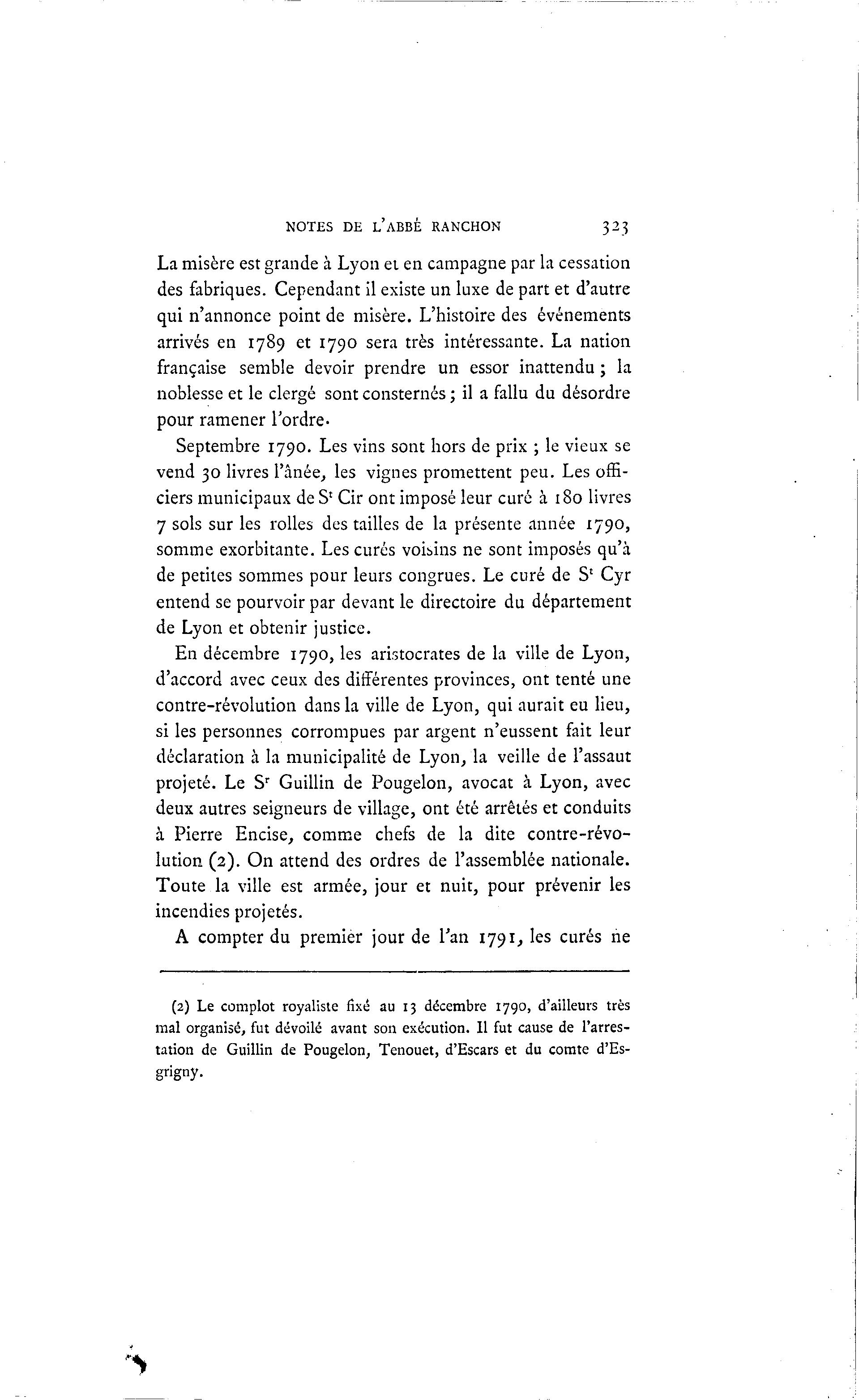 NOTES DE L'ABBÉ RANCHON 323 La misère est grande à Lyon et en campagne par la cessation des fabriques. Cependant il existe un luxe de part et d'autre qui n'annonce point de misère. L'histoire des événements arrivés en 1789 et 1790 sera très intéressante. La nation française semble devoir prendre un essor inattendu ; la noblesse et le clergé sont consternés ; il a fallu du désordre pour ramener l'ordre- Septembre 1790. Les vins sont hors de prix ; le vieux se vend 30 livres l'ânée, les vignes promettent peu. Les offi- ciers municipaux de S1 Cir ont imposé leur curé à 180 livres 7 sols sur les rolles des tailles de la présente année 1790, somme exorbitante. Les curés voisins ne sont imposés qu'à de petites sommes pour leurs congrues. Le curé de S' Cyr entend se pourvoir par devant le directoire du département de Lyon et obtenir justice. En décembre 1790, les aristocrates de la ville de Lyon, d'accord avec ceux des différentes provinces, ont tenté une contre-révolution dans la ville de Lyon, qui aurait eu lieu, si les personnes corrompues par argent n'eussent fait leur déclaration à la municipalité de Lyon, la veille de l'assaut projeté. Le S r Guillin de Pougelon, avocat à Lyon, avec deux autres seigneurs de village, ont été arrêtés et conduits à Pierre Encise, comme chefs de la dite contre-révo- lution (2). On attend des ordres de l'assemblée nationale. Toute la ville est armée, jour et nuit, pour prévenir les incendies projetés. A compter du premier jour de Tan 179 \, les curés ne (2) Le complot royaliste fixé au 13 décembre 1790, d'ailleurs très mal organisé, fut dévoilé avant son exécution. Il fut cause de l'arres- tation de Guillin de Pougelon, Tenouet, d'Escars et du comte d'Es- grigny. *>