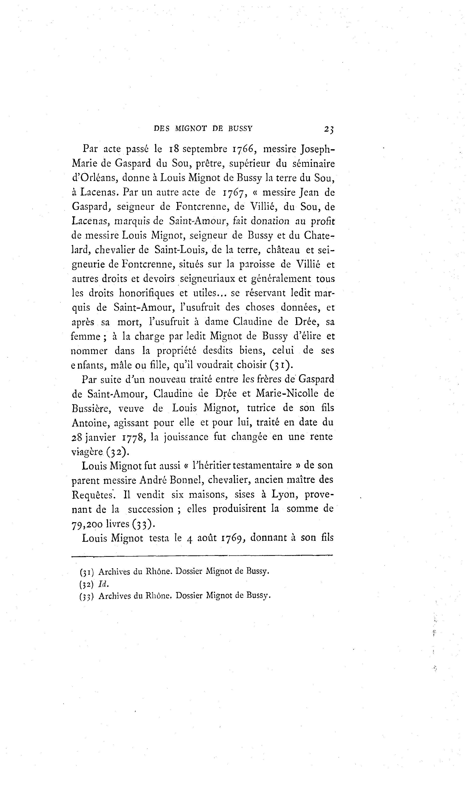 DES MIGNOT DE BUSSY 2j Par acte passé le 18 septembre 1766, messire Joseph- Marie de Gaspard du Sou, prêtre, supérieur du séminaire d'Orléans, donne à Louis Mignot de Bussy la terre du Sou, à Lacenas. Par un autre acte de 1767, « messire Jean de Gaspard, seigneur de Fontcrenne, de Villié, du Sou, de Lacenas, marquis de Saint-Amour, fait donation au profit de messire Louis Mignot, seigneur de Bussy et du Chate- lard, chevalier de Saint-Louis, de la terre, château et sei- gneurie de Fontcrenne, situés sur la paroisse de Villié et autres droits et devoirs seigneuriaux et généralement tous les droits honorifiques et utiles... se réservant ledit mar- quis de Saint-Amour, l'usufruit des choses données, et après sa mort, l'usufruit à dame Claudine de Drée, sa femme ; à la charge par ledit Mignot de Bussy d'élire et nommer dans la propriété desdits biens, celui de ses enfants, mâle ou fille, qu'il voudrait choisir (31). Par suite d'un nouveau traité entre les frères de Gaspard de Saint-Amour, Claudine de Drée et Marie-Nicolle de Bussière, veuve de Louis Mignot, tutrice de son fils Antoine, agissant pour elle et pour lui, traité en date du 28 janvier 1778, la jouissance fut changée en une rente viagère (32). Louis Mignot fut aussi « l'héritier testamentaire » de son parent messire André Bonnel, chevalier, ancien maître des Requêtes. Il vendit six maisons, sises à Lyon, prove- nant de la succession ; elles produisirent la somme de 79,200 livres (33). Louis Mignot testa le 4 août 1769, donnant à son fils (31) Archives du Rhône. Dossier Mignot de Bussy. (32) là . (33) Archives du Rhône. Dossier Mignot de Bussy.