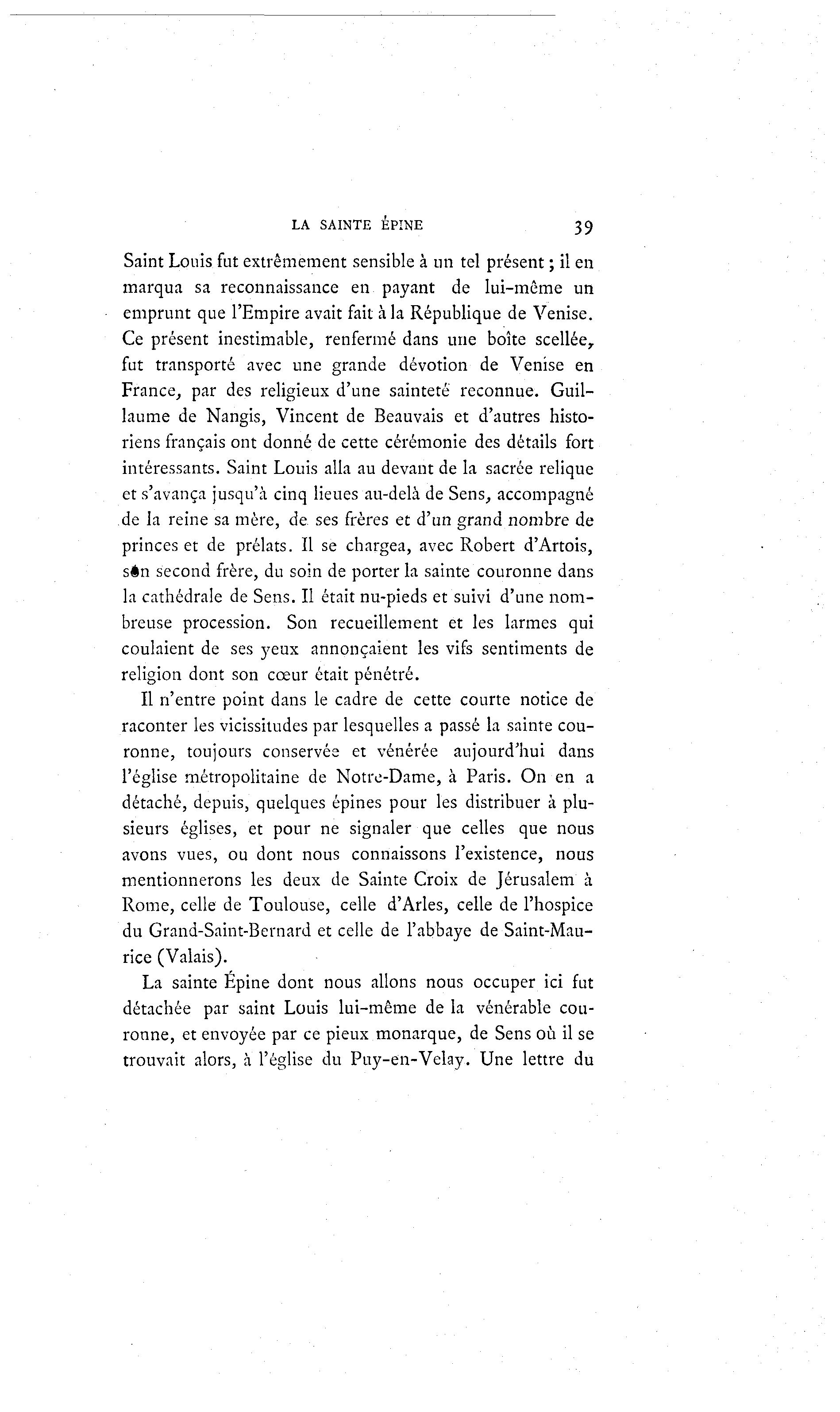 LA SAINTE ÉPINE 39 Saint Louis fut extrêmement sensible à un tel présent ; il en marqua sa reconnaissance en payant de lui-même un emprunt que l'Empire avait fait à la République de Venise. Ce présent inestimable, renfermé dans une boîte scellée, fut transporté avec une grande dévotion de Venise en France, par des religieux d'une sainteté reconnue. Guil- laume de Nangis, Vincent de Beauvais et d'autres histo- riens français ont donné de cette cérémonie des détails fort intéressants. Saint Louis alla au devant de la sacrée relique et s'avança jusqu'à cinq lieues au-delà de Sens, accompagné de la reine sa mère, de ses frères et d'un grand nombre de princes et de prélats. Il se chargea, avec Robert d'Artois, sên second frère, du soin de porter la sainte couronne dans la cathédrale de Sens. Il était nu-pieds et suivi d'une nom- breuse procession. Son recueillement et les larmes qui coulaient de ses yeux annonçaient les vifs sentiments de religion dont son cœur était pénétré. Il n'entre point dans le cadre de cette courte notice de raconter les vicissitudes par lesquelles a passé la sainte cou- ronne, toujours conservée et vénérée aujourd'hui dans l'église métropolitaine de Notre-Dame, à Paris. On en a détaché, depuis, quelques épines pour les distribuer à plu- sieurs églises, et pour ne signaler que celles que nous avons vues, ou dont nous connaissons l'existence, nous mentionnerons les deux de Sainte Croix de Jérusalem à Rome, celle de Toulouse, celle d'Arles, celle de l'hospice du Grand-Saint-Bernard et celle de l'abbaye de Saint-Mau- rice (Valais). La sainte Épine dont nous allons nous occuper ici fut détachée par saint Louis lui-même de la vénérable cou- ronne, et envoyée par ce pieux monarque, de Sens où il se trouvait alors, à l'église du Puy-en-Velay. Une lettre du