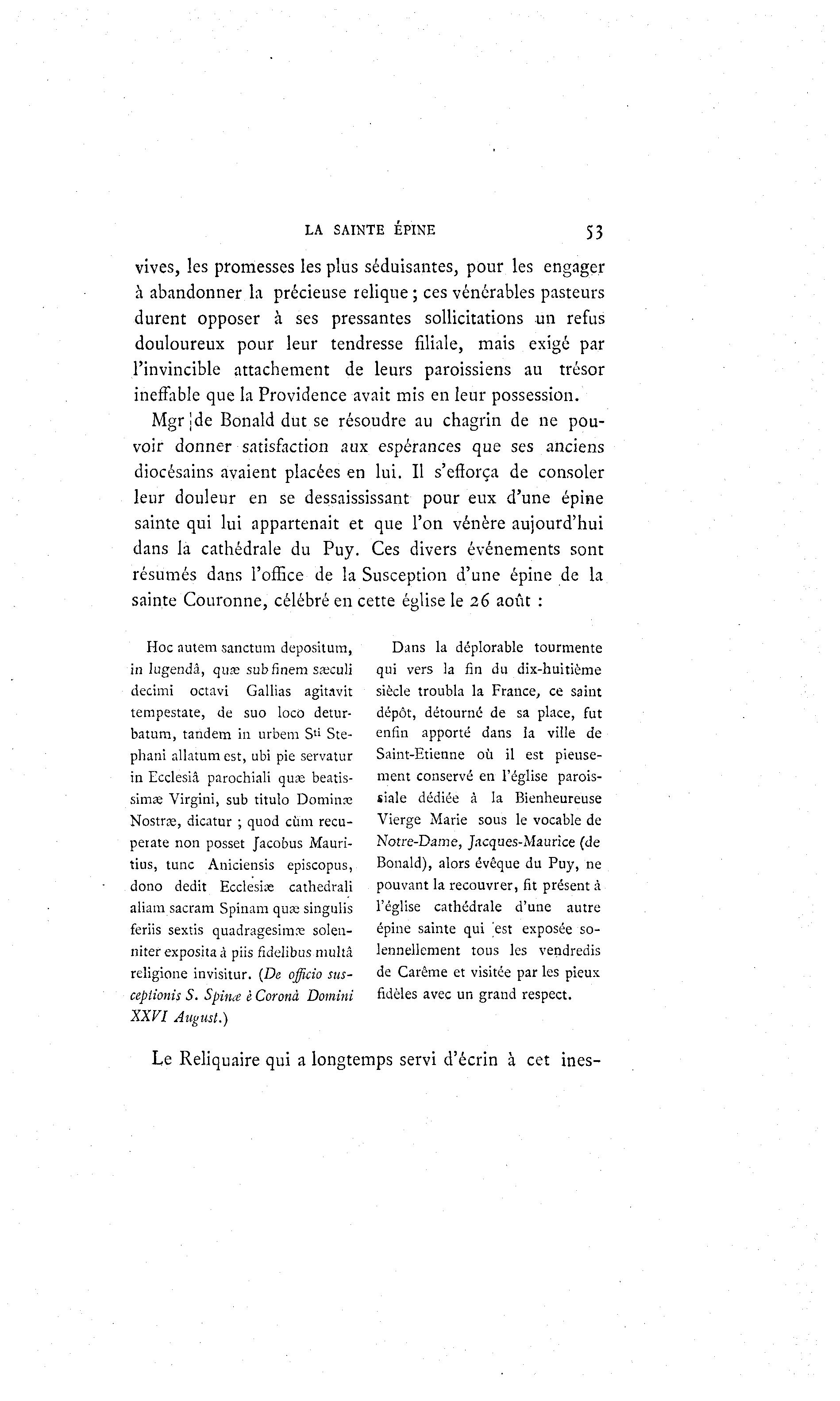 LA SAINTE ÉPINE 53 vives, les promesses les plus séduisantes, pour les engager à abandonner la précieuse relique ; ces vénérables pasteurs durent opposer à ses pressantes sollicitations un refus douloureux pour leur tendresse filiale, mais exigé par l'invincible attachement de leurs paroissiens au trésor inefFable que la Providence avait mis en leur possession. Mgr]de Bonald dut se résoudre au chagrin de ne pou- voir donner satisfaction aux espérances que ses anciens diocésains avaient placées en lui. Il s'efforça de consoler leur douleur en se dessaississant pour eux d'une épine sainte qui lui appartenait et que l'on vénère aujourd'hui dans la cathédrale du Puy. Ces divers événements sont résumés dans l'office de la Susception d'une épine de la sainte Couronne, célébré en cette église le 26 août : Hoc autem sanctum depositura, Dans la déplorable tourmente in lugendâ, quse subfinem sa:culi qui vers la fin du dix-huitième decimi octavi Gallias agitavit siècle troubla la France, ce saint terapestate, de suo loco detur- dépôt, détourné de sa place, fut batura, tandem in urbera S1» Ste- enfin apporté dans la ville de phani allatum est, ubi pie servatur Saint-Etienne où il est pieuse- in Ecclesiâ parochiali quaî beatis- ment conservé en l'église parois- sima; Virgini, sub titulo Domina: siale dédiée à la Bienheureuse Nostr», dicatur ; quod cùm recu- Vierge Marie sous le vocable de perate non posset Jacobus Mauri- Notre-Dame, Jacques-Maurice (de tius, tune Aniciensis episcopus, Bonald), alors évêque du Puy, ne dono dédit Ecclesix cathedrali pouvant la recouvrer, fit présent à aliam sacram Spinam qux singulis l'église cathédrale d'une autre feriis sextis quadragesimx solen- épine sainte qui 'est exposée so- niter exposita a piis fidelibus multâ lennellement tous les vendredis religione invisitur. (De officia sus- de Carême et visitée par les pieux ceplionis S. Spinœ è Corond Domini fidèles avec un grand respect. XXVI August.) Le Reliquaire qui a longtemps servi d'écrin à cet ines-