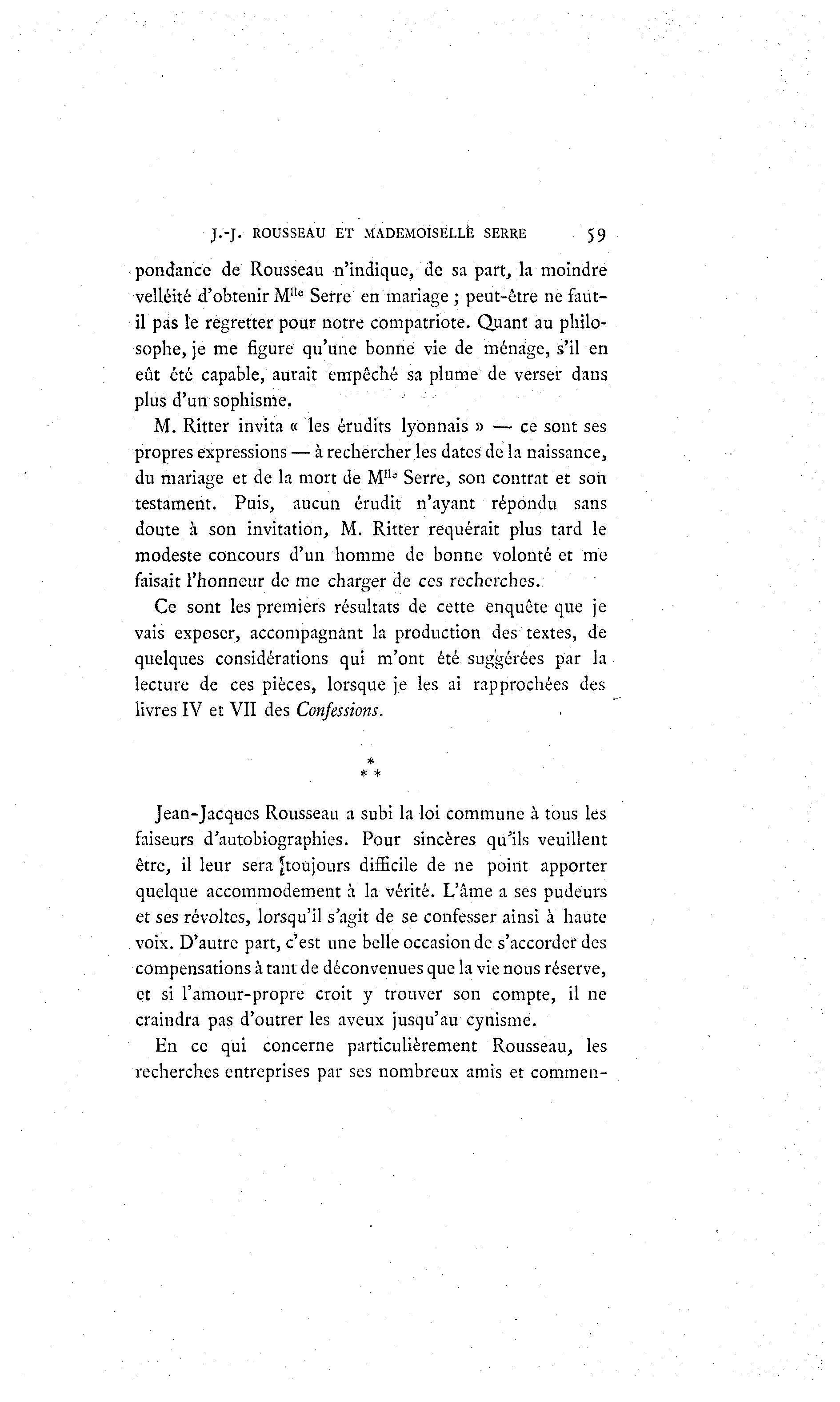 J.-J. ROUSSEAU ET MADEMOISELLE SERRE 59 pondance de Rousseau n'indique, de sa part, la moindre velléité d'obtenir Mlle Serre en mariage ; peut-être ne faut- il pas le regretter pour notre compatriote. Quant au philo- sophe, je me figure qu'une bonne vie de ménage, s'il en eût été capable, aurait empêché sa plume de verser dans plus d'un sophisme. M. Ritter invita « les érudits lyonnais » — ce sont ses propres expressions — à rechercher les dates de la naissance, du mariage et de la mort de MIU Serre, son contrat et son testament. Puis, aucun érudit n'ayant répondu sans doute à son invitation, M. Ritter requérait plus tard le modeste concours d'un homme de bonne volonté et me faisait l'honneur de me charger de ces recherches. Ce sont les premiers résultats de cette enquête que je vais exposer, accompagnant la production des textes, de quelques considérations qui m'ont été suggérées par la lecture de ces pièces, lorsque je les ai rapprochées des livres IV et VII des Confessions. * ** Jean-Jacques Rousseau a subi la loi commune à tous les faiseurs d'autobiographies. Pour sincères qu'ils veuillent être, il leur sera ftoujours difficile de ne point apporter quelque accommodement à la vérité. L'âme a ses pudeurs et ses révoltes, lorsqu'il s'agit de se confesser ainsi à haute voix. D'autre part, c'est une belle occasion de s'accorder des compensations à tant de déconvenues que la vie nous réserve, et si l'amour-propre croit y trouver son compte, il ne craindra pas d'outrer les aveux jusqu'au cynisme. En ce qui concerne particulièrement Rousseau, les recherches entreprises par ses nombreux amis et commen-