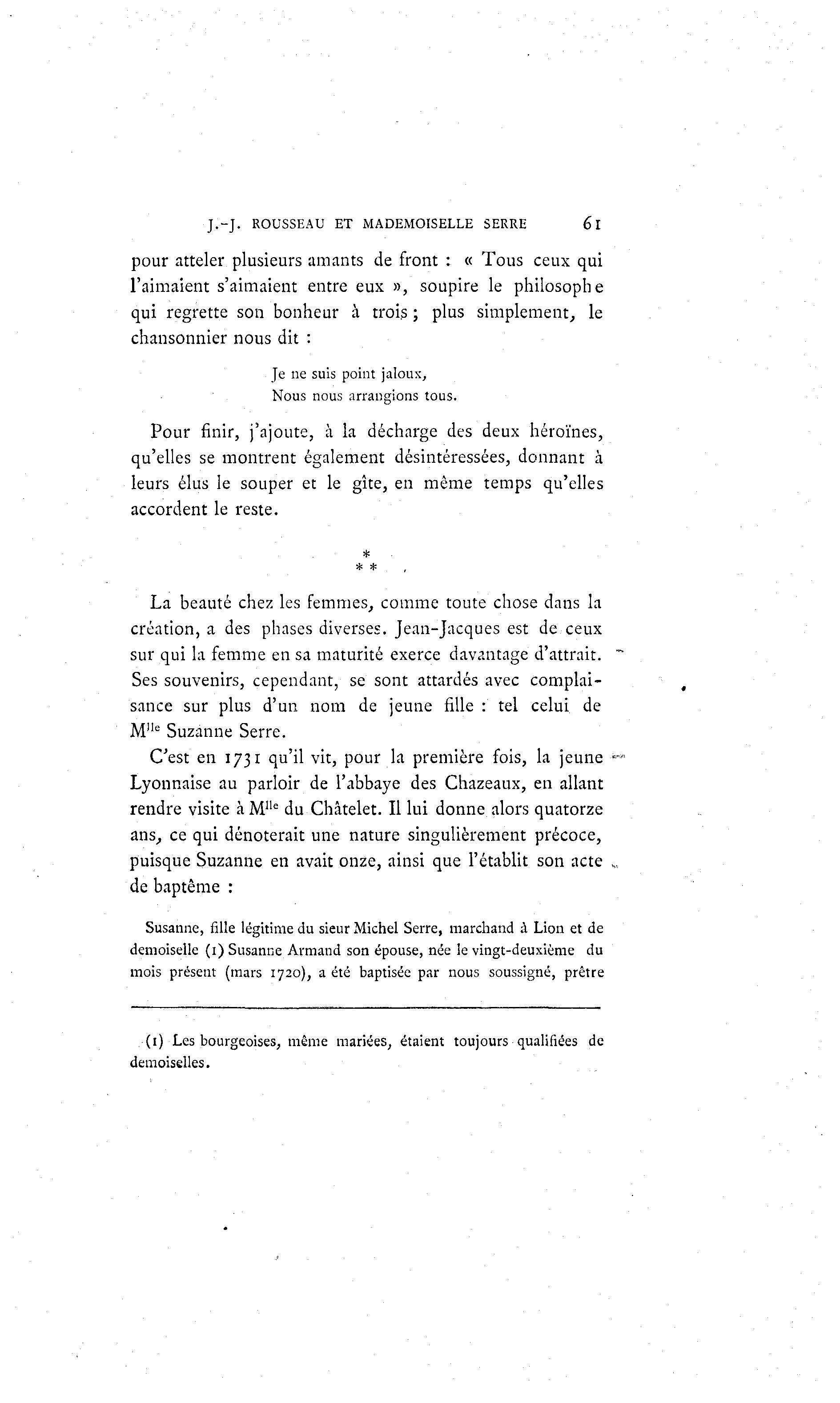 J.-J. ROUSSEAU ET MADEMOISELLE SERRE él pour atteler plusieurs amants de front : « Tous ceux qui l'aimaient s'aimaient entre eux », soupire le philosophe qui regrette son bonheur à trois ; plus simplement, le chansonnier nous dit : Je ne suis point jaloux, Nous nous arrangions tous. Pour finir, j'ajoute, à la décharge des deux héroïnes, qu'elles se montrent également désintéressées, donnant à leurs élus le souper et le gîte, en même temps qu'elles accordent le reste. * ** La beauté chez les femmes, comme toute chose dans la création, a des phases diverses. Jean-Jacques est de ceux sur qui la femme en sa maturité exerce davantage d'attrait. "" Ses souvenirs, cependant, se sont attardés avec complai- sance sur plus d'un nom de jeune fille : tel celui de Mile Suzanne Serre. C'est en 1731 qu'il vit, pour la première fois, la jeune *-" Lyonnaise au parloir de l'abbaye des Chazeaux, en allant rendre visite à MIle du Châtelet. Il lui donne alors quatorze ans, ce qui dénoterait une nature singulièrement précoce, puisque Suzanne en avait onze, ainsi que l'établit son acte „, de baptême : Susanne, fille légitime du sieur Michel Serre, marchand à Lion et de demoiselle (1) Susanne Armand son épouse, née le vingt-deuxième du mois présent (mars 1720), a été baptisée par nous soussigné, prêtre (1) Les bourgeoises, même mariées, étaient toujours qualifiées de demoiselles.