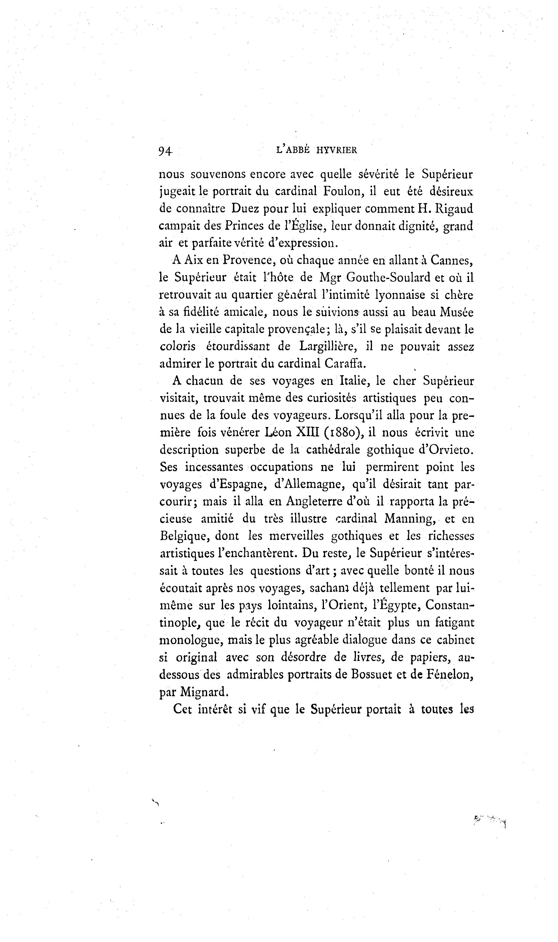 94 L'ABBÉ HYVRIER nous souvenons encore avec quelle sévérité le Supérieur jugeait le portrait du cardinal Foulon, il eut été désireux de connaître Duez pour lui expliquer comment H. Rigaud campait des Princes de l'Église, leur donnait dignité, grand air et parfaite vérité d'expression. A Aix en Provence, où chaque année en allant à Cannes, le Supérieur était l'hôte de Mgr Gouthe-Soulard et où il retrouvait au quartier général l'intimité lyonnaise si chère à sa fidélité amicale, nous le suivions aussi au beau Musée de la vieille capitale provençale; là , s'il se plaisait devant le coloris étourdissant de Largillière, il ne pouvait assez admirer le portrait du cardinal Caraffa. A chacun de ses voyages en Italie, le cher Supérieur visitait, trouvait même des curiosités artistiques peu con- nues de la foule des voyageurs. Lorsqu'il alla pour la pre- mière fois vénérer Léon XIII (1880), il nous écrivit une description superbe de la cathédrale gothique d'Orvieto. Ses incessantes occupations ne lui permirent point les voyages d'Espagne, d'Allemagne, qu'il désirait tant par- courir; mais il alla en Angleterre d'où il rapporta la pré- cieuse amitié du très illustre cardinal Manning, et en Belgique, dont les merveilles gothiques et les richesses artistiques l'enchantèrent. Du reste, le Supérieur s'intéres- sait à toutes les questions d'art ; avec quelle bonté il nous écoutait après nos voyages, sacham déjà tellement par lui- même sur les pays lointains, l'Orient, l'Egypte, Constan- tinople, que le récit du voyageur n'était plus un fatigant monologue, mais le plus agréable dialogue dans ce cabinet si original avec son désordre de livres, de papiers, au- dessous des admirables portraits de Bossuet et de Fénelon, par Mignard. Cet intérêt si vif que le Supérieur portait à toutes les