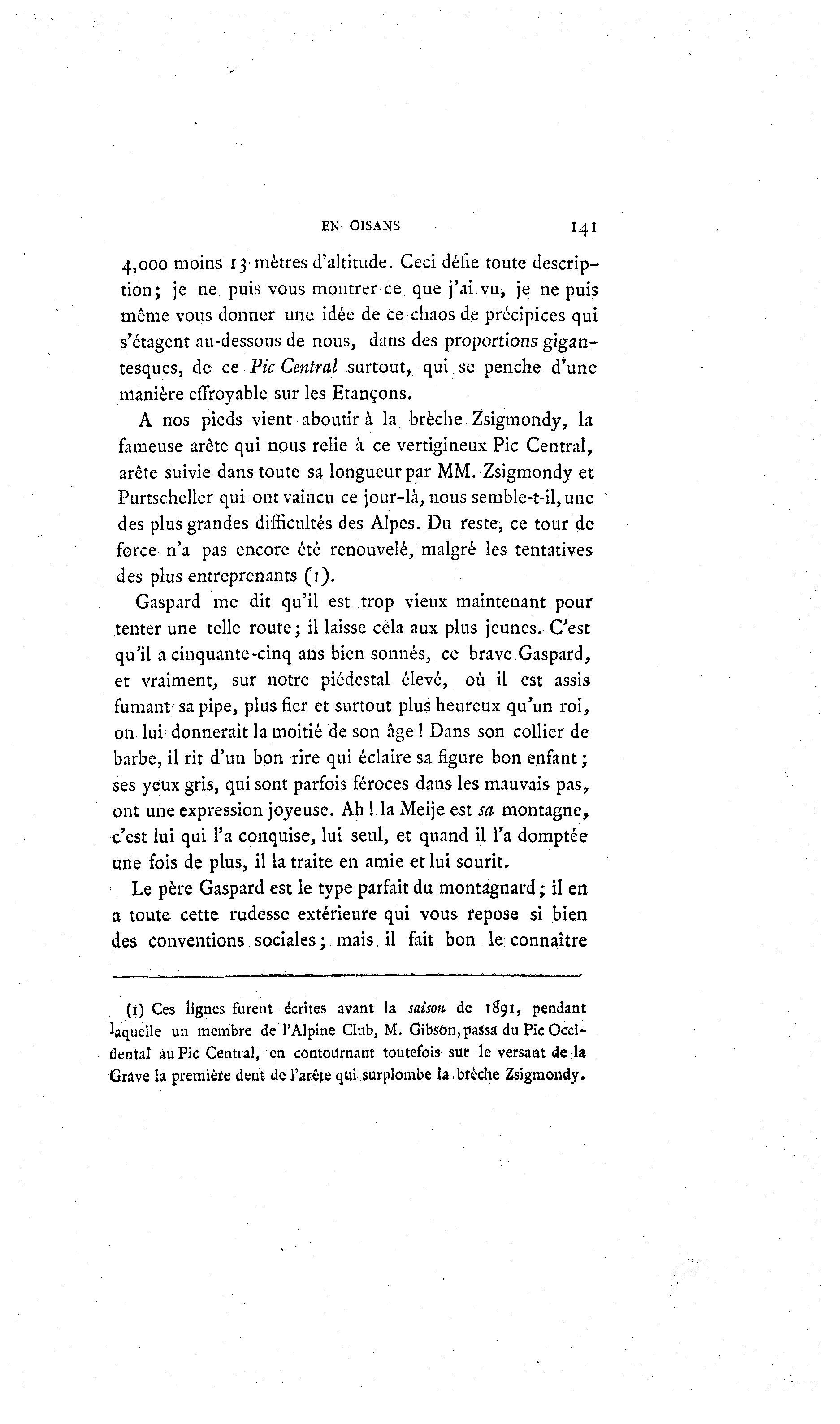 EN OIS ANS I^I 4,000 moins 13 mètres d'altitude. Ceci défie toute descrip- tion; je ne puis vous montrer ce que j'ai vu, je ne puis même vous donner une idée de ce chaos de précipices qui s'étagent au-dessous de nous, dans des proportions gigan- tesques, de ce Pic Central surtout, qui se penche d'une manière effroyable sur les Etançons. A nos pieds vient aboutir à la brèche Zsigmondy, la fameuse arête qui nous relie à ce vertigineux Pic Central, arête suivie dans toute sa longueur par MM. Zsigmondy et Purtscheller qui ont vaincu ce jour-là , nous semble-t-il, une des plus grandes difficultés des Alpes. Du reste, ce tour de force n'a pas encore été renouvelé, malgré les tentatives des plus entreprenants (1). Gaspard me dit qu'il est trop vieux maintenant pour tenter une telle route; il laisse cela aux plus jeunes. C'est qu'il a cinquante-cinq ans bien sonnés, ce brave Gaspard, et vraiment, sur notre piédestal élevé, où il est assis fumant sa pipe, plus fier et surtout plus heureux qu'un roi, on lui donnerait la moitié de son âge ! Dans son collier de barbe, il rit d'un bon rire qui éclaire sa figure bon enfant ; ses yeux gris, qui sont parfois féroces dans les mauvais pas, ont une expression joyeuse. Ah ! la Meije est sa montagne, c'est lui qui l'a conquise, lui seul, et quand il l'a domptée une fois de plus, il la traite en amie et lui sourit. Le père Gaspard est le type parfait du montagnard ; il en a toute cette rudesse extérieure qui vous repose si bien des conventions sociales;, mais, il fait bon le connaître (1) Ces lignes furent écrites avant la saison- de 1891, pendant laquelle un membre de l'Alpine Club, M. Gibsôn, passa du Pic Occi- dental au Pic Central, en contournant toutefois sur le versant de la Grave la première dent de l'arête qui surplombe la brèche Zsigmondy.