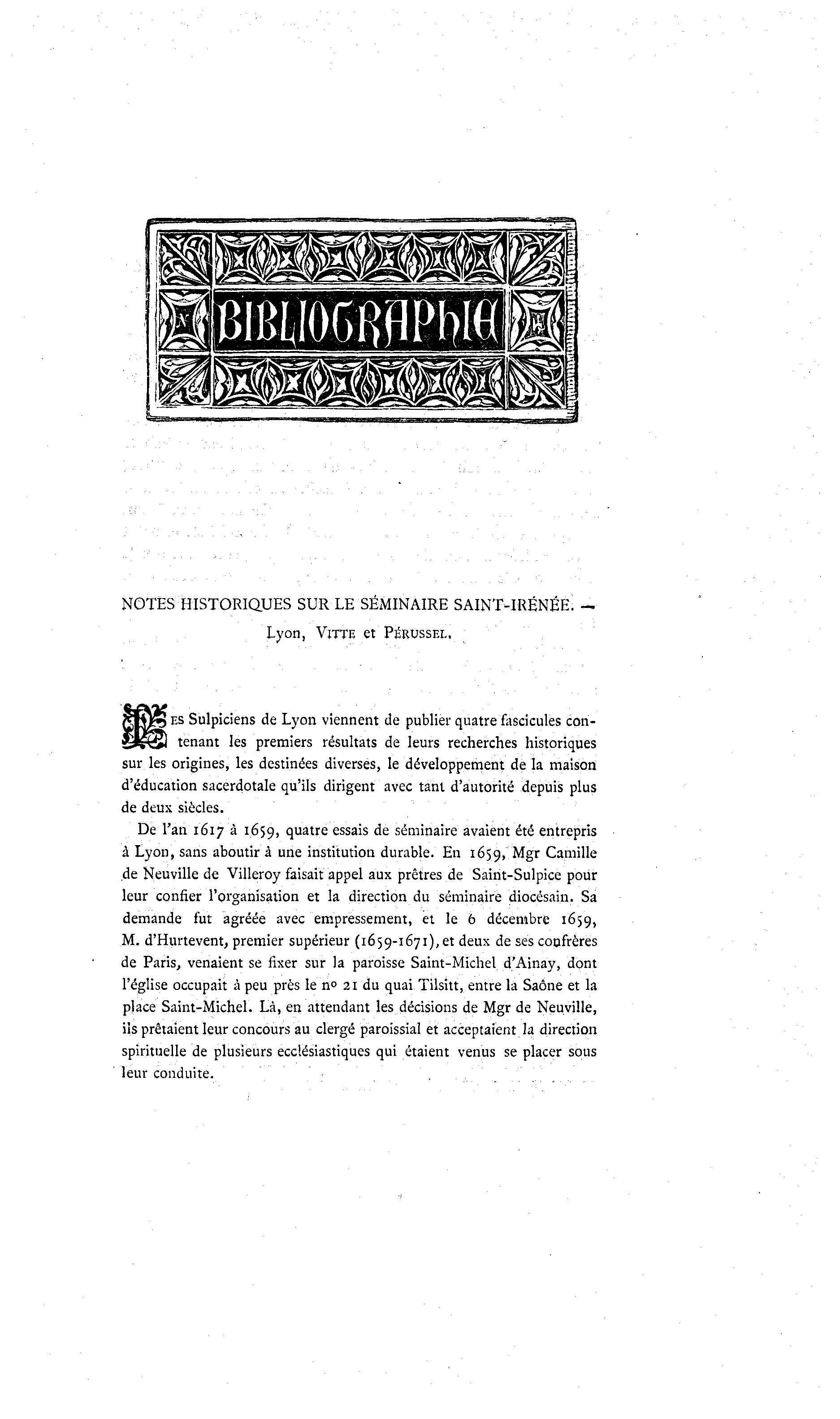 NOTES HISTORIQUES SUR LE SÉMINAIRE SAINT-IRÉNÉE. ~ Lyon, VITTE et PÉRUSSEL. g K W ES Sulpiciens de Lyon viennent de publier quatre fascicules con- ÊlfÇS) tenant les premiers résultats de leurs recherches historiques sur les origines, les destinées diverses, le développement de la maison d'éducation sacerdotale qu'ils dirigent avec tant d'autorité depuis plus de deux siècles. De l'an 1617 à 1.659, quatre essais de séminaire avaient été entrepris à Lyon, sans aboutir à une institution durable. En 1659, Mgr Camille de Neuville de Villeroy faisait appel aux prêtres de Saint-Sulpice pour leur confier l'organisation et la direction du séminaire diocésain. Sa demande fut agréée avec empressement, et le 6 décembre 1659, M. d'Hurtevent, premier supérieur (1659-1671), et deux de ses confrères de Paris, venaient se fixer sur la paroisse Saint-Michel d'Ainay, dont l'église occupait à peu près le n° 21 du quai Tilsitt, entre la Saône et la place Saint-Michel. Là , en attendant les décisions de Mgr de Neuville, ils prêtaient leur concours au clergé paroissial et acceptaient la direction spirituelle de plusieurs ecclésiastiques qui étaient venus se placer sous leur conduite.