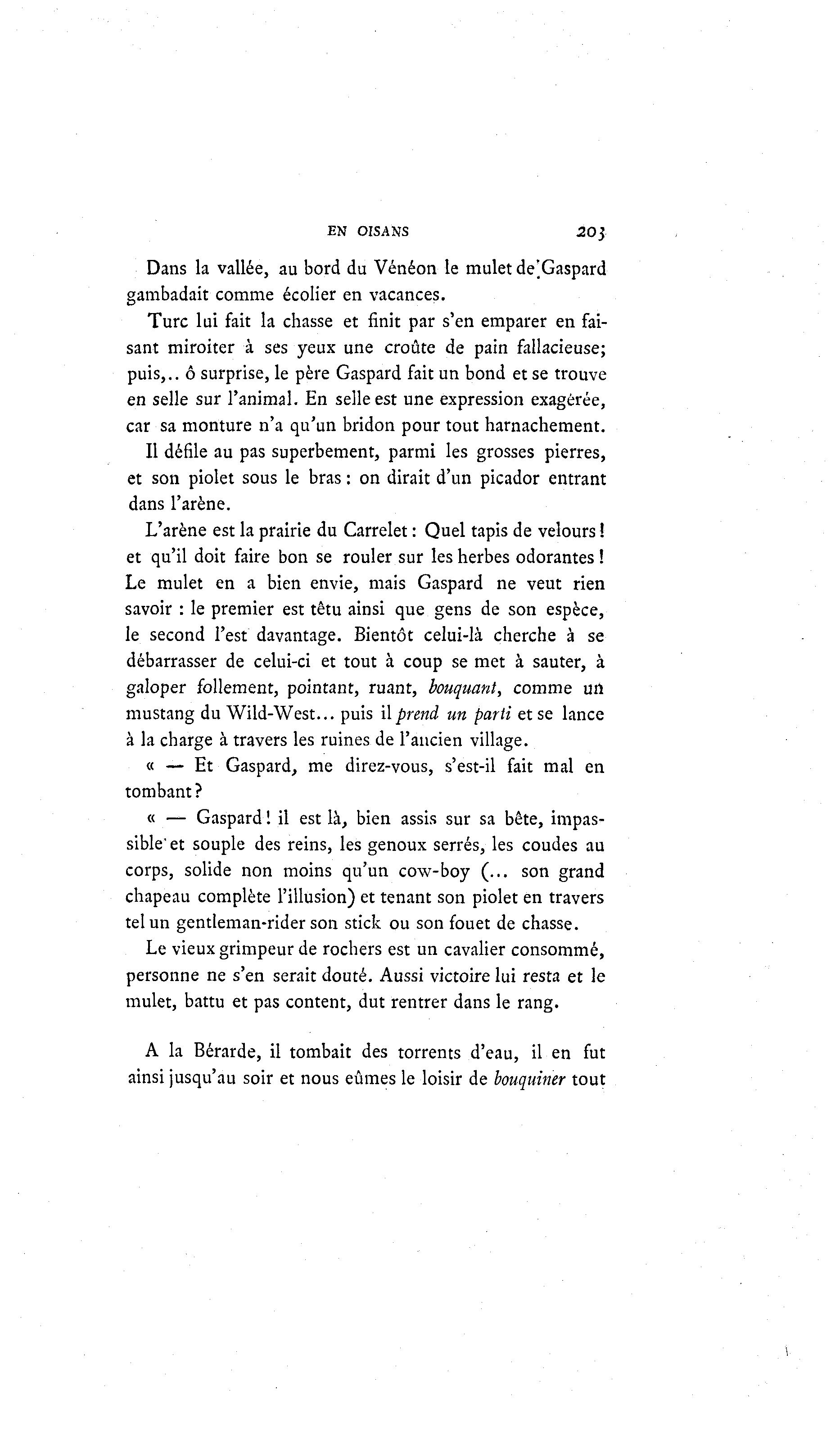 EN OISANS 20$ Dans la vallée, au bord du Vénéon le mulet de'.Gaspard gambadait comme écolier en vacances. Turc lui fait la chasse et finit par s'en emparer en fai- sant miroiter à ses yeux une croûte de pain fallacieuse; puis,., ô surprise, le père Gaspard fait un bond et se trouve en selle sur l'animal. En selle est une expression exagérée, car sa monture n'a qu'un bridon pour tout harnachement. Il défile au pas superbement, parmi les grosses pierres, et son piolet sous le bras : on dirait d'un picador entrant dans l'arène. L'arène est la prairie du Carrelet : Quel tapis de velours ! et qu'il doit faire bon se rouler sur les herbes odorantes ! Le mulet en a bien envie, mais Gaspard ne veut rien savoir : le premier est têtu ainsi que gens de son espèce, le second l'est davantage. Bientôt celui-là cherche à se débarrasser de celui-ci et tout à coup se met à sauter, à galoper follement, pointant, ruant, bouquant, comme un mustang du Wild-West... puis il prend un parti et se lance à la charge à travers les ruines de l'ancien village. « — Et Gaspard, me direz-vous, s'est-il fait mal en tombant? « — Gaspard ! il est là , bien assis sur sa bête, impas- sible' et souple des reins, les genoux serrés, les coudes au corps, solide non moins qu'un cow-boy (... son grand chapeau complète l'illusion) et tenant son piolet en travers tel un gentleman-rider son stick ou son fouet de chasse. Le vieux grimpeur de rochers est un cavalier consommé, personne ne s'en serait douté. Aussi victoire lui resta et le mulet, battu et pas content, dut rentrer dans le rang. A la Bérarde, il tombait des torrents d'eau, il en fut ainsi jusqu'au soir et nous eûmes le loisir de bouquiner tout