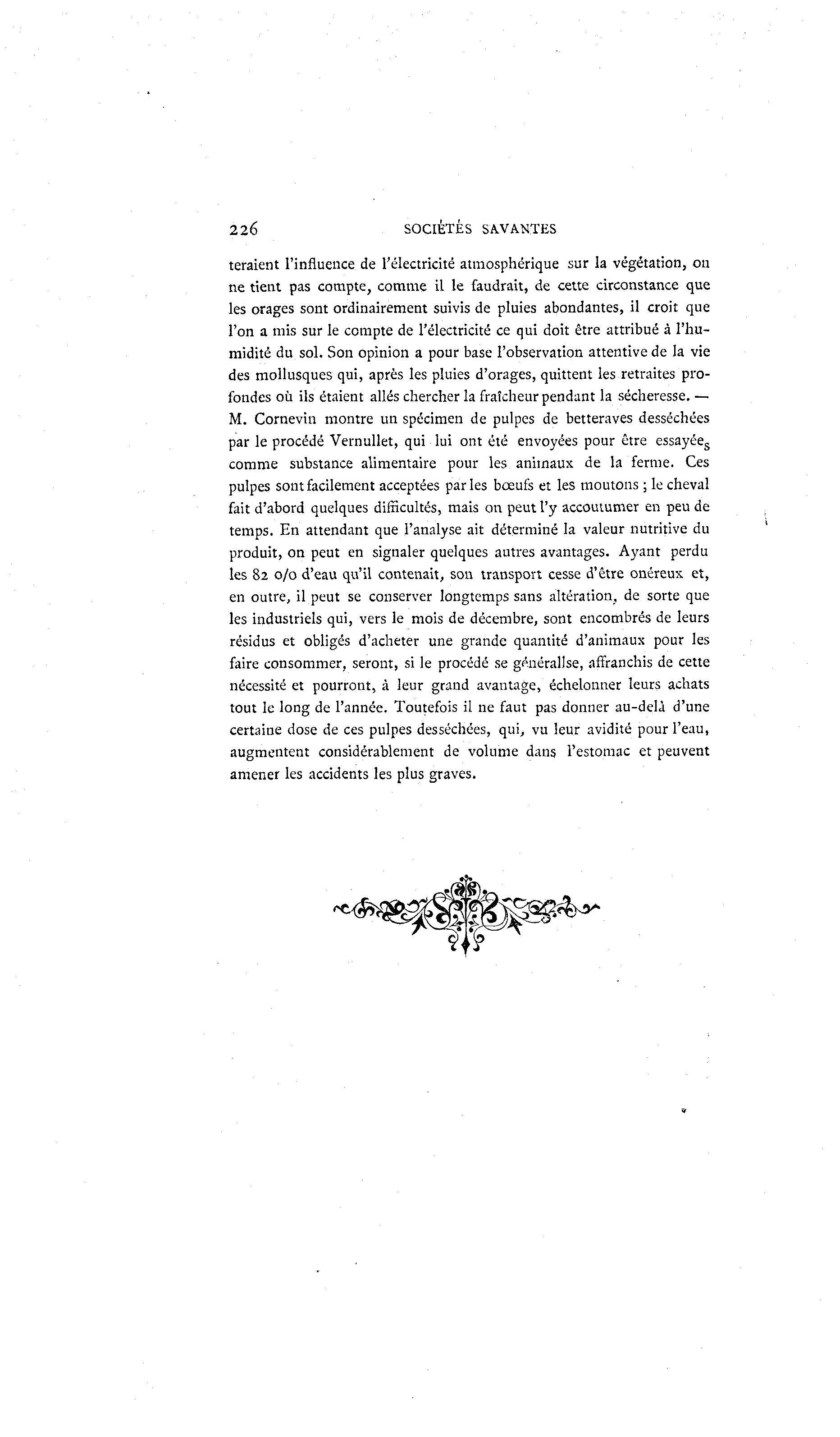 226 SOCIETES SAVANTES feraient l'influence de l'électricité atmosphérique sur la végétation, on ne tient pas compte, comme il le faudrait, de cette circonstance que les orages sont ordinairement suivis de pluies abondantes, il croit que l'on a mis sur le compte de l'électricité ce qui doit être attribué à l'hu- midité du sol. Son opinion a pour base l'observation attentive de la vie des mollusques qui, après les pluies d'orages, quittent les retraites pro- fondes où ils étaient allés chercher la fraîcheur pendant la sécheresse. — M. Cornevin montre un spécimen de pulpes de betteraves desséchées par le procédé Vernullet, qui lui ont été envoyées pour être essayées comme substance alimentaire pour les animaux de la ferme. Ces pulpes sont facilement acceptées par les bœufs et les moutons ; le cheval fait d'abord quelques difficultés, mais on peut l'y accoutumer en peu de temps. En attendant que l'analyse ait déterminé la valeur nutritive du produit, on peut en signaler quelques autres avantages. Ayant perdu les 82 0/0 d'eau qu'il contenait, son transport cesse d'être onéreux et, en outre, il peut se conserver longtemps sans altération, de sorte que les industriels qui, vers le mois de décembre, sont encombrés de leurs résidus et obligés d'acheter une grande quantité d'animaux pour les faire consommer, seront, si le procédé se généralise, affranchis de cette nécessité et pourront, à leur grand avantage, échelonner leurs achats tout le long de l'année. Toutefois il ne faut pas donner au-delà d'une certaine dose de ces pulpes desséchées, qui, vu leur avidité pour l'eau, augmentent considérablement de volume dans l'estomac et peuvent amener les accidents les plus graves.