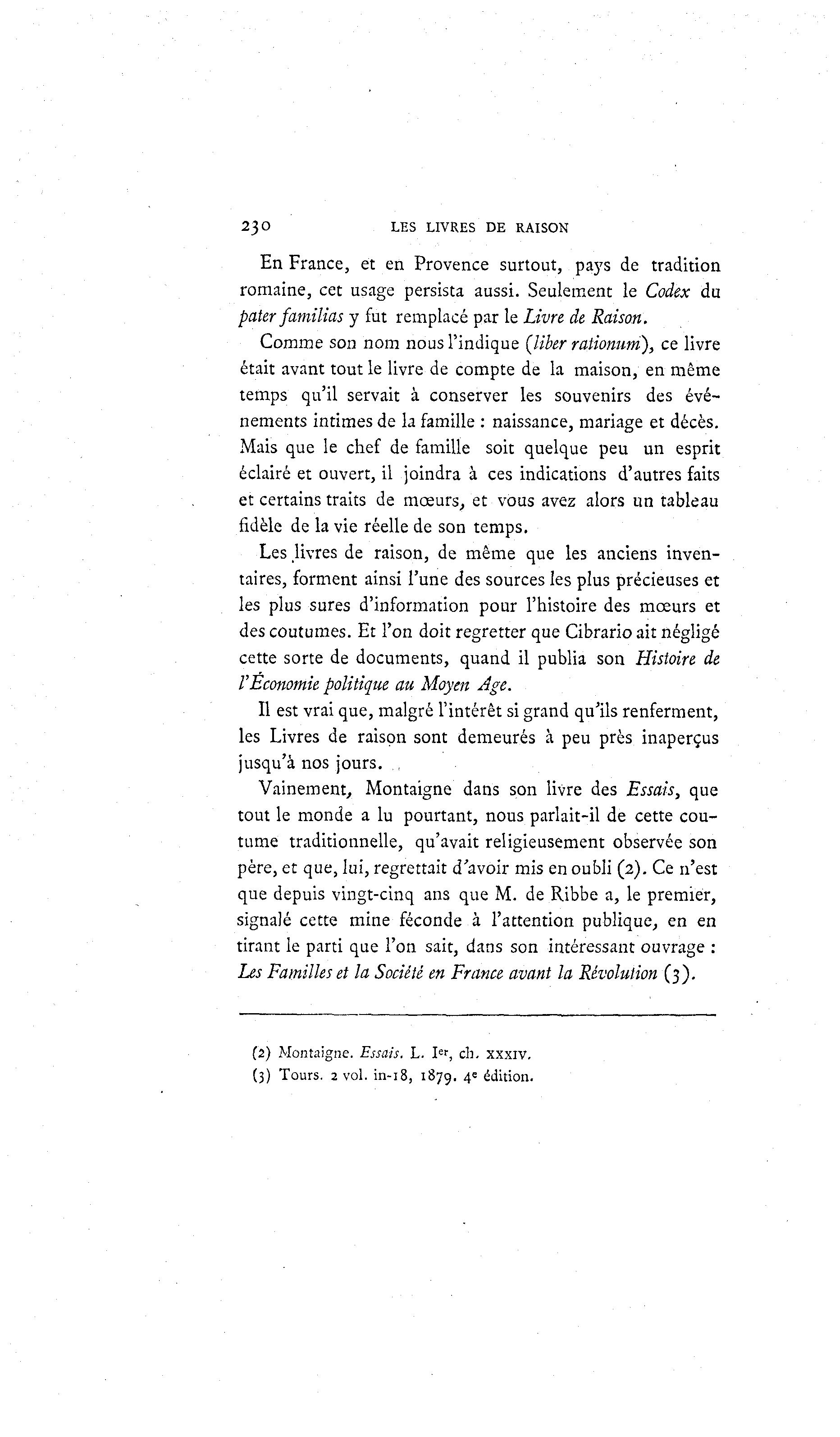 2j O LES LIVRES DE RAISON En France, et en Provence surtout, pays de tradition romaine, cet usage persista aussi. Seulement le Codex du pater familias y fut remplacé par le Livre de Raison. Comme son nom nous l'indique (liber rationum), ce livre était avant tout le livre de compte de la maison, en même temps qu'il servait à conserver les souvenirs des évé- nements intimes de la famille : naissance, mariage et décès. Mais que le chef de famille soit quelque peu un esprit éclairé et ouvert, il joindra à ces indications d'autres faits et certains traits de mœurs, et vous avez alors un tableau fidèle de la vie réelle de son temps. Les livres de raison, de même que les anciens inven- taires, forment ainsi l'une des sources les plus précieuses et les plus sures d'information pour l'histoire des mœurs et des coutumes. Et l'on doit regretter que Cibrario ait négligé cette sorte de documents, quand il publia son Histoire de l'Economie politique au Moyen Age. Il est vrai que, malgré l'intérêt si grand qu'ils renferment, les Livres de raison sont demeurés à peu près inaperçus jusqu'à nos jours. Vainement, Montaigne dans son livre des Essais, que tout le monde a lu pourtant, nous parlait-il de cette cou- tume traditionnelle, qu'avait religieusement observée son père, et que, lui, regrettait d'avoir mis en oubli (2). Ce n'est que depuis vingt-cinq ans que M. de Ribbe a, le premier, signalé cette mine féconde à l'attention publique, en en tirant le parti que l'on sait, dans son intéressant ouvrage : Les Familles et la Société en France avant la Révolution (3). (2) Montaigne. Essais. L. I " , ch. xxxiv. (3) Tours. 2 vol. in-i8, 1879. 4 e édition.