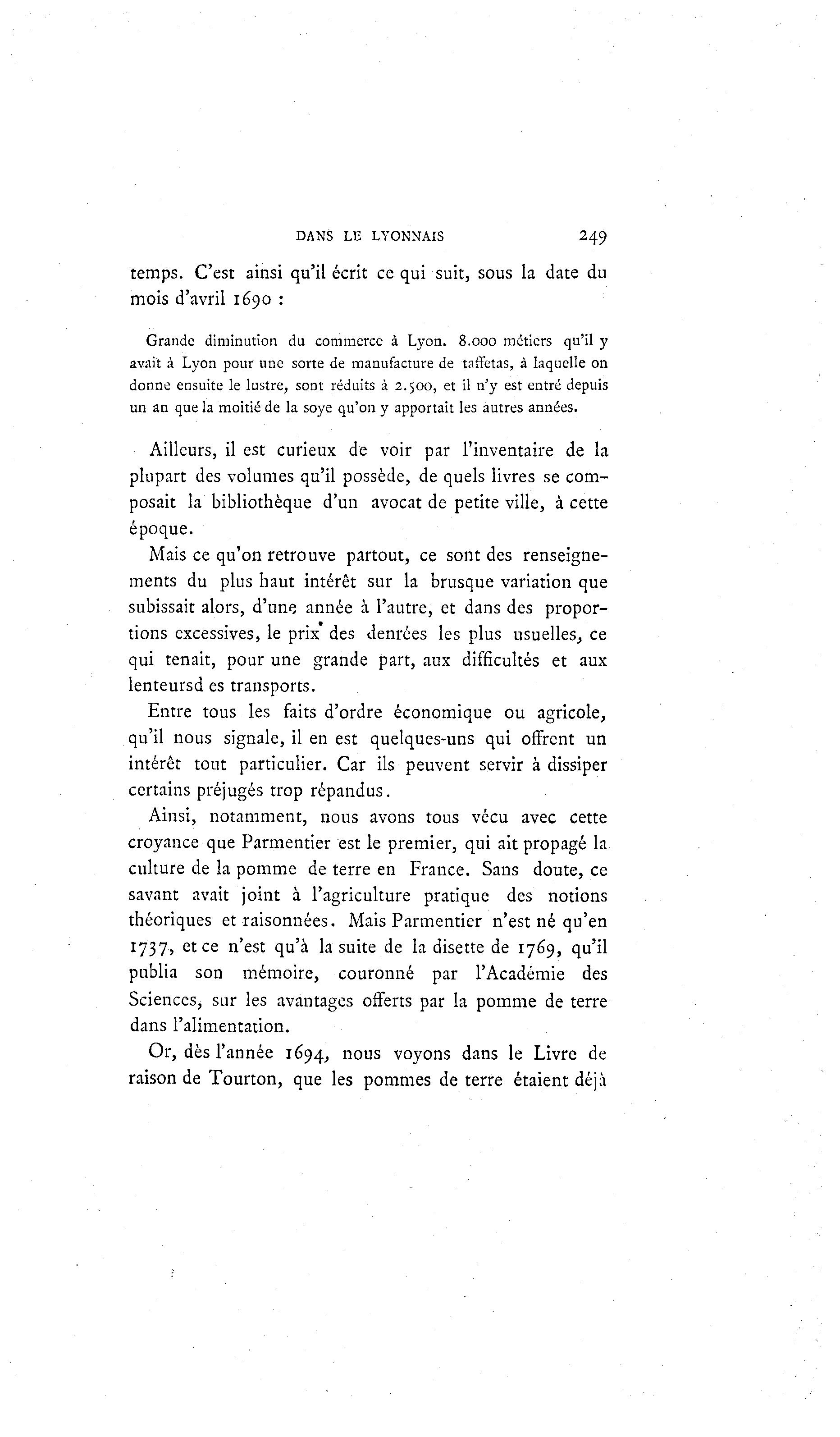 DANS LE LYONNAIS 249 temps. C'est ainsi qu'il écrit ce qui suit, sous la date du mois d'avril 1690 : Grande diminution du commerce à Lyon. 8.000 métiers qu'il y avait à Lyon pour une sorte de manufacture de taffetas, à laquelle on donne ensuite le lustre, sont réduits à 2.500, et il n'y est entré depuis un an que la moitié de la soye qu'on y apportait les autres années. Ailleurs, il est curieux de voir par l'inventaire de la plupart des volumes qu'il possède, de quels livres se com- posait la bibliothèque d'un avocat de petite ville, à cette époque. Mais ce qu'on retrouve partout, ce sont des renseigne- ments du plus haut intérêt sur la brusque variation que subissait alors, d'une année à l'autre, et dans des propor- tions excessives, le prix des denrées les plus usuelles, ce qui tenait, pour une grande part, aux difficultés et aux lenteursd es transports. Entre tous les faits d'ordre économique ou agricole, qu'il nous signale, il en est quelques-uns qui offrent un intérêt tout particulier. Car ils peuvent servir à dissiper certains préjugés trop répandus. Ainsi, notamment, nous avons tous vécu avec cette croyance que Parmentier est le premier, qui ait propagé la culture de la pomme de terre en France. Sans doute, ce savant avait joint à l'agriculture pratique des notions théoriques et raisonnées. Mais Parmentier n'est né qu'en 1737, et ce n'est qu'à la suite de la disette de 1769, qu'il publia son mémoire, couronné par l'Académie des Sciences, sur les avantages offerts par la pomme de terre dans l'alimentation. Or, dès l'année 1694, nous voyons dans le Livre de raison de Tourton, que les pommes de terre étaient déjÃ
