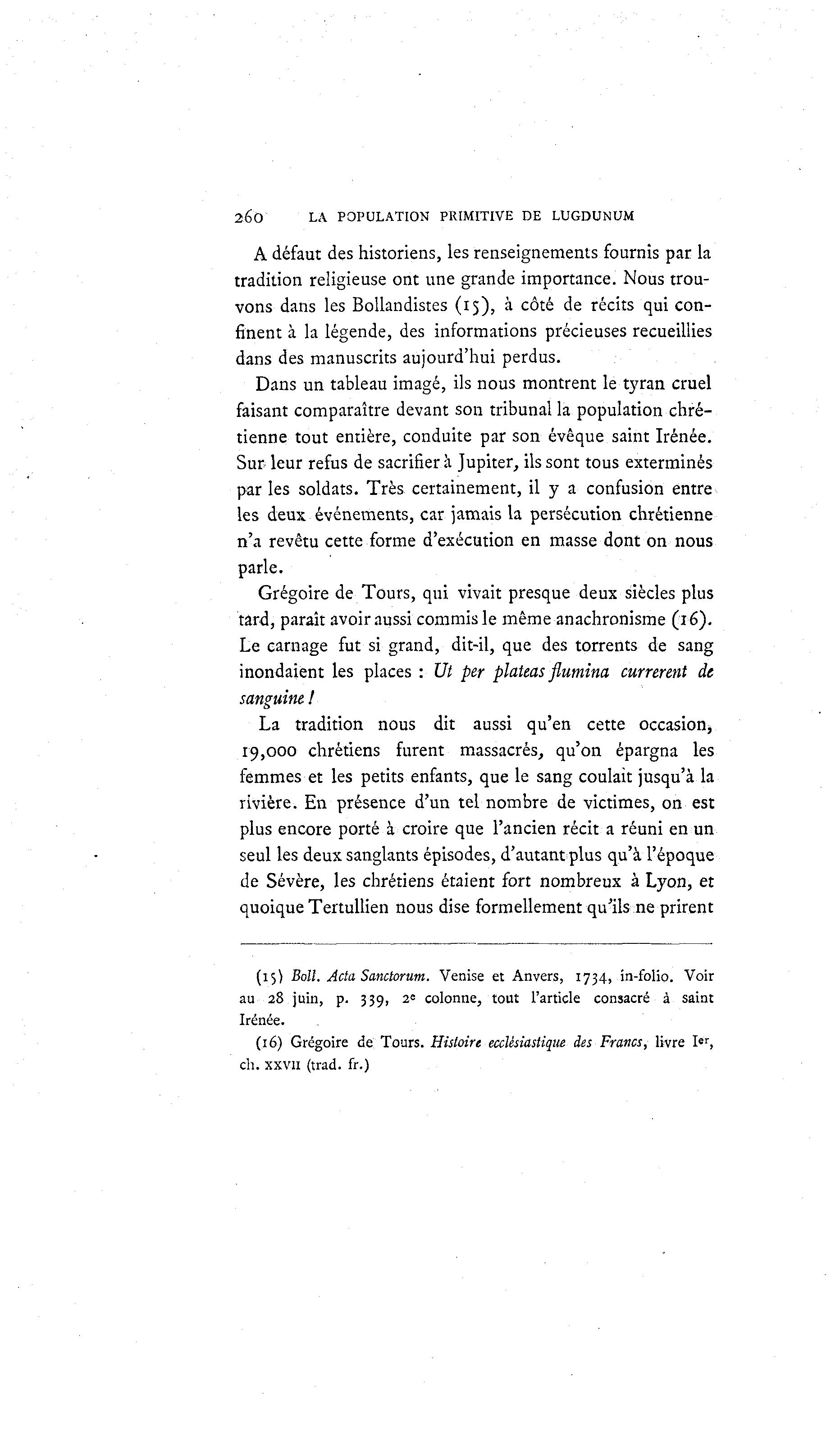 260 LA POPULATION PRIMITIVE DE LUGDUNUM A défaut des historiens, les renseignements fournis par la tradition religieuse ont une grande importance. Nous trou- vons dans les Bollandistes (15), à côté de récits qui con- finent à la légende, des informations précieuses recueillies dans des manuscrits aujourd'hui perdus. Dans un tableau imagé, ils nous montrent le tyran cruel faisant comparaître devant son tribunal la population chré- tienne tout entière, conduite par son évêque saint Irénée. Sur leur refus de sacrifier à Jupiter, ils sont tous exterminés par les soldats. Très certainement, il y a confusion entre les deux événements, car jamais la persécution chrétienne n'a revêtu cette forme d'exécution en masse dont on nous parle. Grégoire de Tours, qui vivait presque deux siècles plus tard, paraît avoir aussi commis le même anachronisme (16). Le carnage fut si grand, dit-il, que des torrents de sang inondaient les places : Ut per pîateasfluminacurrerent de sanguine ! La tradition nous dit aussi qu'en cette occasion* 19,000 chrétiens furent massacrés, qu'on épargna les femmes et les petits enfants, que le sang coulait jusqu'à la rivière. En présence d'un tel nombre de victimes, on est plus encore porté à croire que l'ancien récit a réuni en un seul les deux sanglants épisodes, d'autant plus qu'à l'époque de Sévère, les chrétiens étaient fort nombreux à Lyon, et quoique Tertullien nous dise formellement qu'ils ne prirent (15) Boll. Acta Sanctorum. Venise et Anvers, 1734, in-folio. Voir au 28 juin, p. 339, 2= colonne, tout l'article consacré à saint Irénée. (16) Grégoire de Tours. Histoire ecclésiastique des Francs, livre I« r , ch. XXVII (trad. fr.)
