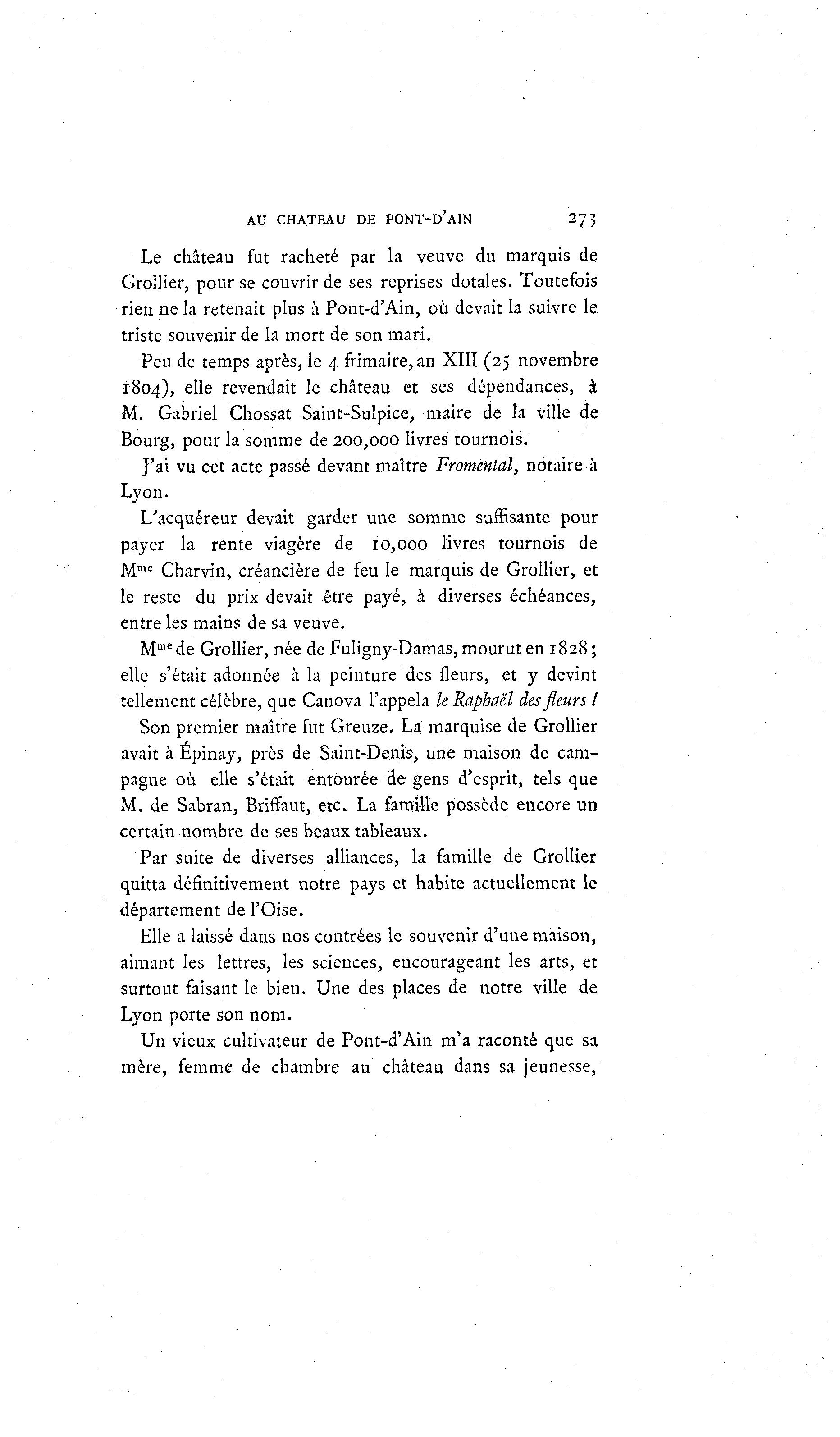 AU CHATEAU DE P O N T - D ' A I N 273 Le château fut racheté par la veuve du marquis de Grollier, pour se couvrir de ses reprises dotales. Toutefois rien ne la retenait plus à Pont-d'Ain, où devait la suivre le triste souvenir de la mort de son mari. Peu de temps après, le 4 frimaire, an XIII (25 novembre 1804), elle revendait le château et ses dépendances, à M. Gabriel Chossat Saint-Sulpice, maire de la ville de Bourg, pour la somme de 200,000 livres tournois. J'ai vu cet acte passé devant maître Fromental, notaire à Lyon. L'acquéreur devait garder une somme suffisante pour payer la rente viagère de 10,000 livres tournois de Mme Charvin, créancière de feu le marquis de Grollier, et le reste du prix devait être payé, à diverses échéances, entre les mains de sa veuve. M me de Grollier, née de Fuligny-Damas, mourut en 1828; elle s'était adonnée à la peinture des fleurs, et y devint tellement célèbre, que Canova l'appela le Raphaël desfleurs! Son premier maître fut Greuze. La marquise de Grollier avait à Épinay, près de Saint-Denis, une maison de cam- pagne où elle s'était entourée de gens d'esprit, tels que M. de Sabran, Briffaut, etc. La famille possède encore un certain nombre de ses beaux tableaux. Par suite de diverses alliances, la famille de Grollier quitta définitivement notre pays et habite actuellement le département de l'Oise. Elle a laissé dans nos contrées le souvenir d'une maison, aimant les lettres, les sciences, encourageant les arts, et surtout faisant le bien. Une des places de notre ville de Lyon porte son nom. Un vieux cultivateur de Pont-d'Ain m'a raconté que sa mère, femme de chambre au château dans sa jeunesse,