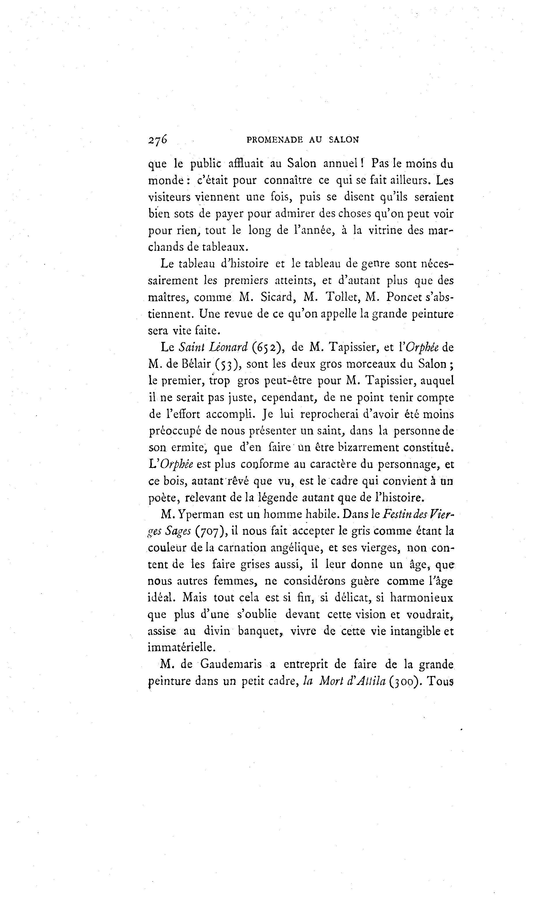 276 PROMENADE AU SALON que le public affluait au Salon annuel ! Pas le moins du monde : c'était pour connaître ce qui se fait ailleurs. Les visiteurs viennent une fois, puis se disent qu'ils seraient bien sots de payer pour admirer des choses qu'on peut voir pour rien, tout le long de l'année, à la vitrine des mar- chands de tableaux. Le tableau d'histoire et le tableau de genre sont néces- sairement les premiers atteints, et d'autant plus que des maîtres, comme M. Sicard, M. Tollet, M. Poncet s'abs- tiennent. Une revue de ce qu'on appelle la grande peinture sera vite faite. Le Saint Léonard (652), de M. Tapissier, et ['Orphée de M. de Bélair (53), sont les deux gros morceaux du Salon ; le premier, trop gros peut-être pour M. Tapissier, auquel il ne serait pas juste, cependant, de ne point tenir compte de l'effort accompli. Je lui reprocherai d'avoir été moins préoccupé de nous présenter un saint, dans la personne de son ermite, que d'en faire un être bizarrement constitué. L'Orphée est plus conforme au caractère du personnage, et ce bois, autant rêvé que vu, est le cadre qui convient à un poète, relevant de la légende autant que de l'histoire. M. Yperman est un homme habile. Dans le Festindes Vier- ges Sages (707), il nous fait accepter le gris comme étant la couleur de la carnation angélique, et ses vierges, non con- tent de les faire grises aussi, il leur donne un âge, que nous autres femmes, ne considérons guère comme l'âge idéal. Mais tout cela est si fin, si délicat, si harmonieux que plus d'une s'oublie devant cette vision et voudrait, assise au divin banquet, vivre de cette vie intangible et immatérielle. M. de Gaudemaris a entreprit de faire de la grande peinture dans un petit cadre, la Mort d'Attila (300). Tous