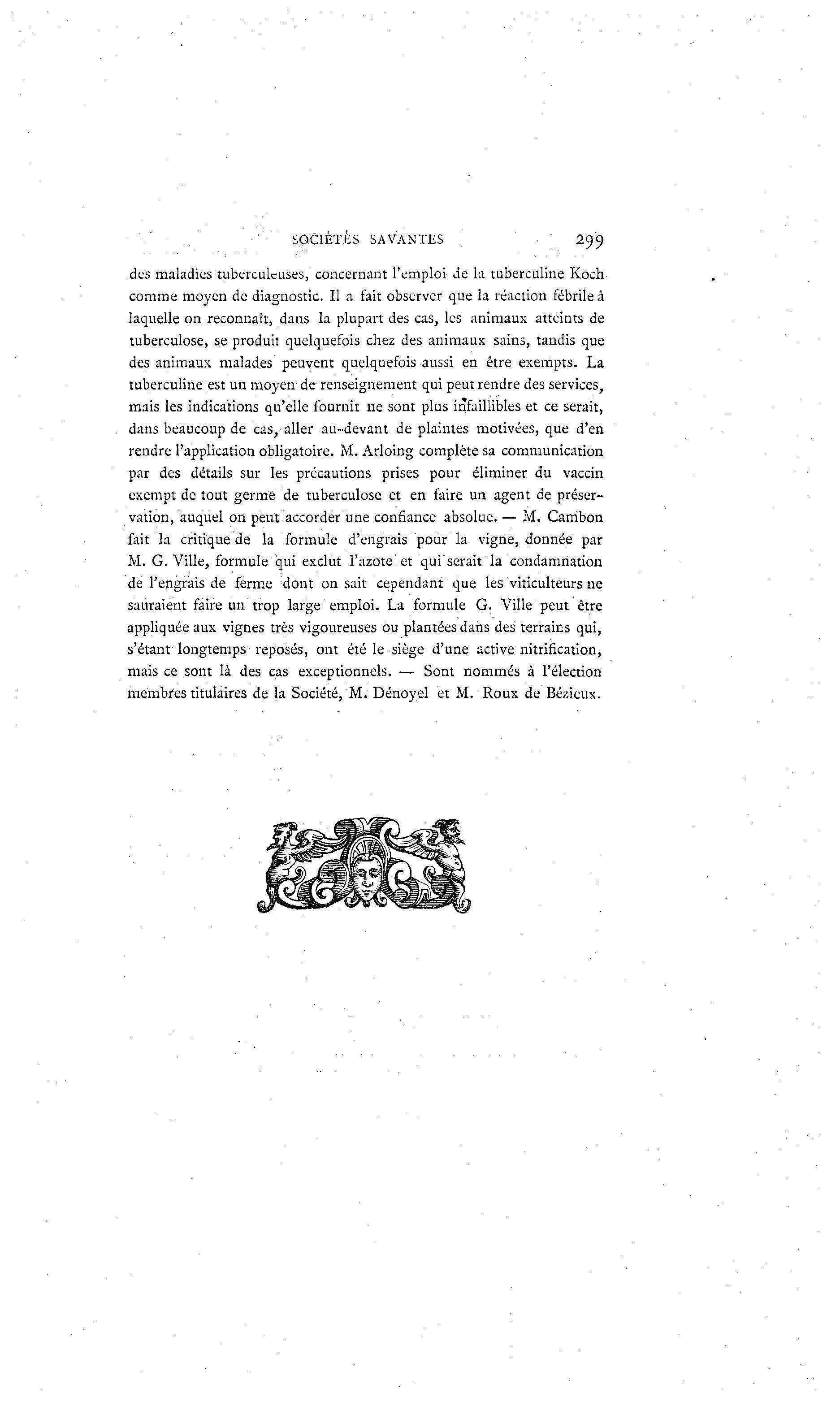 SOCIÉTÉS SAVANTES 299 des maladies tuberculeuses, concernant l'emploi de la tuberculine Koch comme moyen de diagnostic. Il a fait observer que la réaction fébrile à laquelle on reconnaît, dans la plupart des cas, les animaux atteints de tuberculose, se produit quelquefois chez des animaux sains, tandis que des animaux malades peuvent quelquefois aussi en être exempts. La tuberculine est un moyen de renseignement qui peut rendre des services, mais les indications qu'elle fournit ne sont plus infaillibles et ce serait, dans beaucoup de cas, aller au-devant de plaintes motivées, que d'en rendre l'application obligatoire. M. Arloing complète sa communication par des détails sur les précautions prises pour éliminer du vaccin exempt de tout germe de tuberculose et en faire un agent de préser- vation, auquel on peut accorder une confiance absolue. — M. Cambon fait la critique de la formule d'engrais pour la vigne, donnée par M. G. Ville, formule qui exclut l'azote et qui serait la condamnation de l'engrais de ferme dont on sait cependant que les viticulteurs ne sauraient faire un trop large emploi. La formule G. Ville peut être appliquée aux vignes très vigoureuses ou plantées dans des terrains qui, s'étant longtemps reposés, ont été le siège d'une active nitrification, mais ce sont là des cas exceptionnels. — Sont nommés à l'élection membres titulaires de la Société, M. Dénoyel et M. Roux de Bézieux.