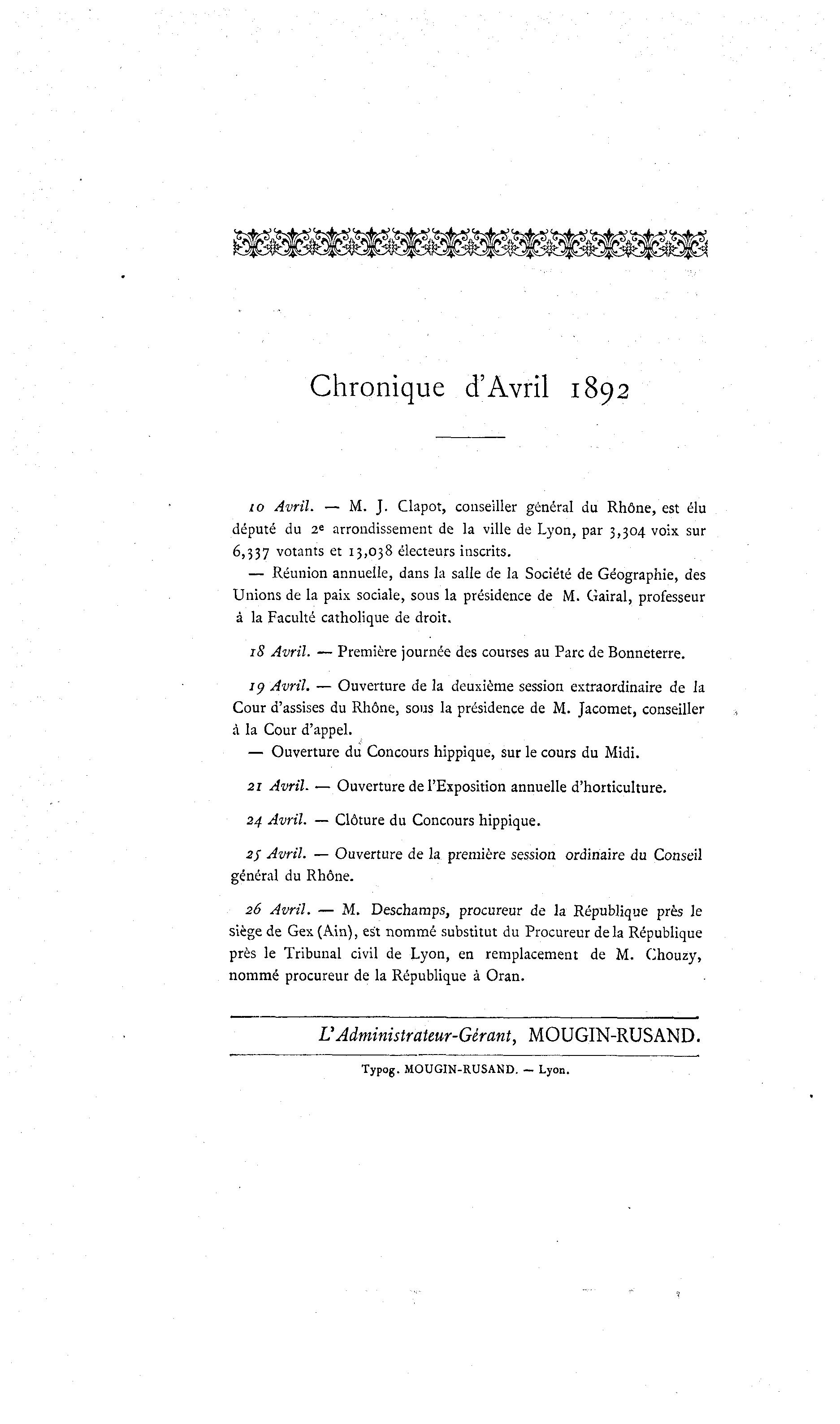 10 Avril. — M. J. Clapot, conseiller général du Rhône, est élu