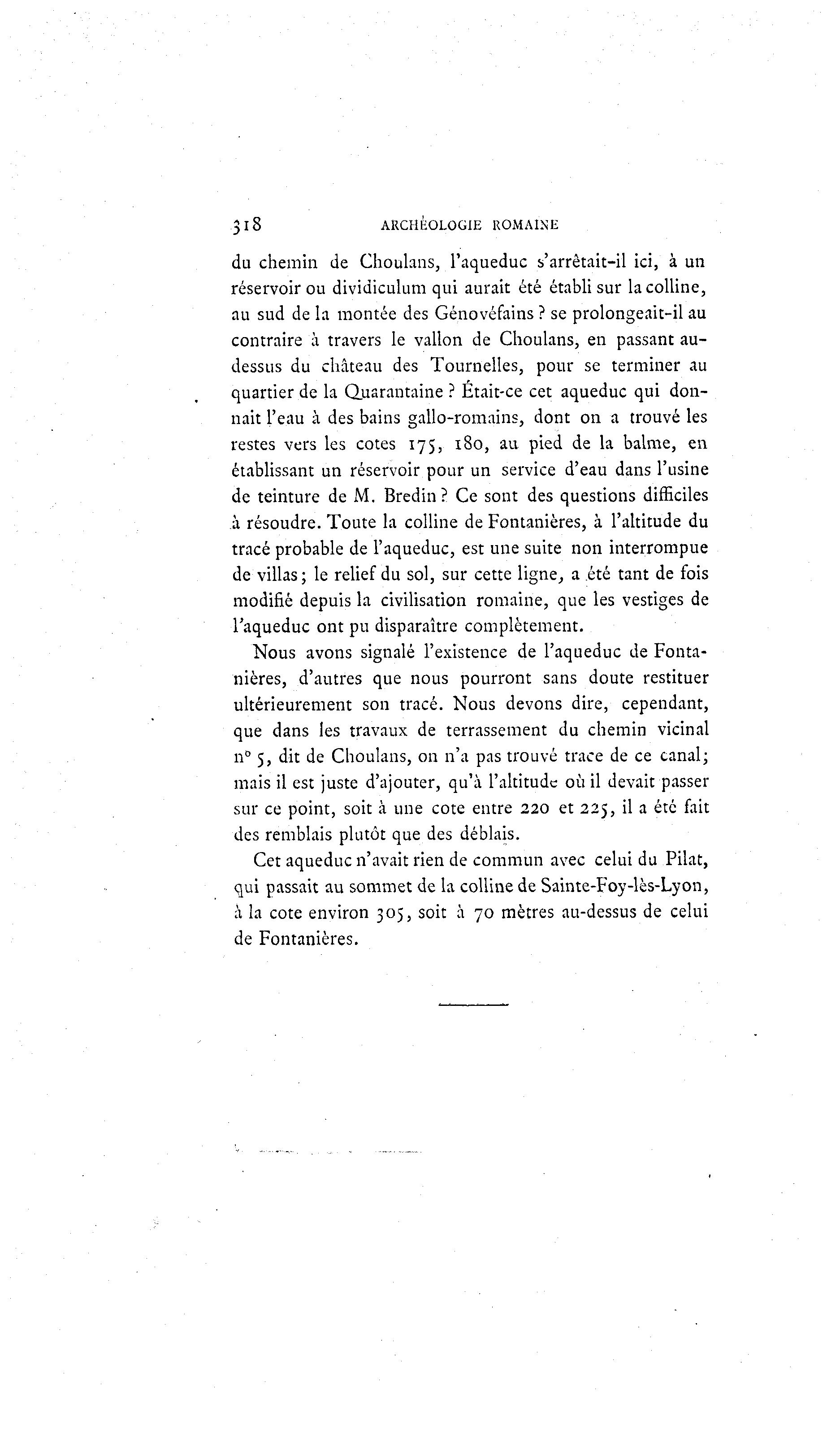 3 l8 ARCHÉOLOGIE ROMAINE du chemin de Choulans, l'aqueduc s'arrêtait-il ici, à un réservoir ou dividiculum qui aurait été établi sur la colline, au sud de la montée des Génovéfains ? se prolongeait-il au contraire à travers le vallon de Choulans, en passant au- dessus du château des Tournelles, pour se terminer au quartier de la Quarantaine ? Était-ce cet aqueduc qui don- nait l'eau à des bains gallo-romains, dont on a trouvé les restes vers les cotes 175, 180, au pied de la balme, en établissant un réservoir pour un service d'eau dans l'usine de teinture de M. Bredin? Ce sont des questions difficiles à résoudre. Toute la colline de Fontanières, à l'altitude du tracé probable de l'aqueduc, est une suite non interrompue de villas; le relief du sol, sur cette ligne, a été tant de fois modifié depuis la civilisation romaine, que les vestiges de l'aqueduc ont pu disparaître complètement. Nous avons signalé l'existence de l'aqueduc de Fonta- nières, d'autres que nous pourront sans doute restituer ultérieurement son tracé. Nous devons dire, cependant, que dans les travaux de terrassement du chemin vicinal n° 5, dit de Choulans, on n'a pas trouvé trace de ce canal; mais il est juste d'ajouter, qu'à l'altitude où il devait passer sur ce point, soit à une cote entre 220 et 225, il a été fait des remblais plutôt que des déblais. Cet aqueduc n'avait rien de commun avec celui du Pilât, qui passait au sommet de la colline de Sainte-Foy-lès-Lyon, à la cote environ 305, soit à 70 mètres au-dessus de celui de Fontanières.