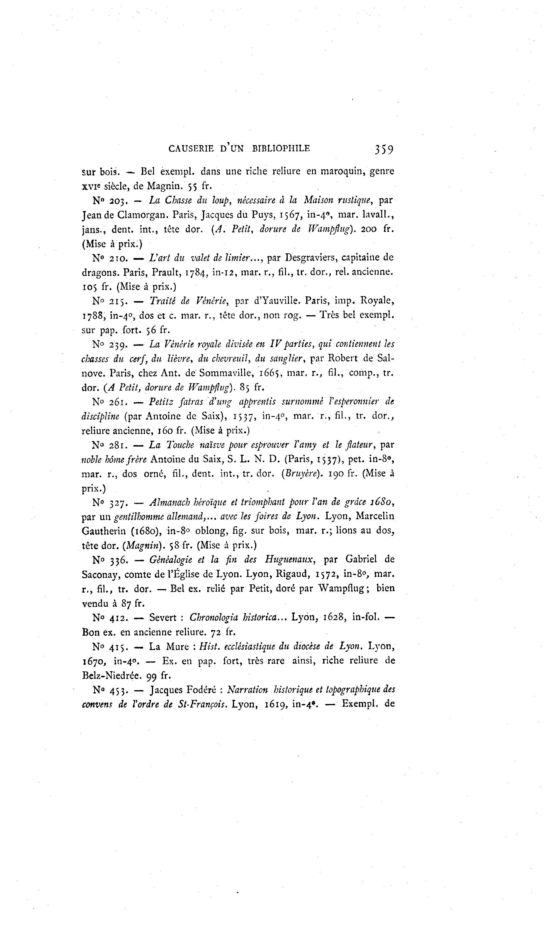 CAUSERIE D'UN BIBLIOPHILE 359 sur bois. — Bel exempl. dans une riche reliure en maroquin, genre xvi« siècle, de Magnin. 55 fr. N" 203. — La Chasse du loup, nécessaire à la Maison rustique, par Jean de Clamorgan. Paris, Jacques du Puys, 1567, in-4 0 , mar. lavall., jans., dent, int., tête dor. (A. Petit, dorure de Wampflug). 200 fr. (Mise à prix.) N° 210. — L'art du valet de limier..., par Desgraviers, capitaine de dragons. Paris, Prault, 1784, in-12, mar. r., fil., tr. dor., rel. ancienne. 105 fr. (Mise à prix.) N° 215. — Traité de Vénerie, par d'Yauville. Paris, imp. Royale, 1788, in-4 0 , dos et c. mar. r., tête dor., non rog. — Très bel exempl. sur pap. fort. 56 fr. N° 239. — La Vénerie royale divisée en IVparties, qui contiennent les chasses du cerf, du lièvre, du chevreuil, du sanglier, par Robert de Sal- nove. Paris, chez Ant. de Sommaville, 1665, mar. r., fil., comp., tr. dor. (A Petit, dorure de Wampflug). 85 fr. N° 261. — Petitz fatras d'ung apprentis surnommé Vesperonnier de discipline (par Antoine de Saix), 1537, in-4 0 , mar. T . , fil., tr. dor., reliure ancienne, 160 fr. (Mise à prix.) N° 281. — La Touche naïsve pour esprouver Tamy et le flateur, par noble home frère Antoine du Saix, S. L. N. D. (Paris, 1537), pet. in-8°, mar. r., dos orné, fil., dent, int., tr. dor. (Bruyère). 190 fr. (Mise à prix.) N° 327. — Almanach héroïque et triomphant pour l'an de grâce 1680, par un gentilhomme allemand,... avec les foires de Lyon. Lyon, Marcelin Gautherin (1680), in-8° oblong, fig. sur bois, mar. r.; lions au dos, tête dor. (Magnin). 58 fr. (Mise à prix.) N° 336. — Généalogie et la fin des Huguenaux, par Gabriel de Saconay, comte de l'Église de Lyon. Lyon, Rigaud, 1572, in-8°, mar. r., fil., tr. dor. — Bel ex. relié par Petit, doré par Wampflug; bien vendu à 87 fr. N° 412. — Severt : Chronologia historica... Lyon, 1628, in-fol. — Bon ex. en ancienne reliure. 72 fr. N° 415. — La Mure : Hist. ecclésiastique du diocèse de Lyon. Lyon, 1670, in-4". — Ex. en pap. fort, très rare ainsi, riche reliure de Belz-Niedrée. 99 fr. N» 453. — Jacques Fodéré : Narration historique et topographique des convens de l'ordre de St-François. Lyon, 1619, in-4». — Exempl. de