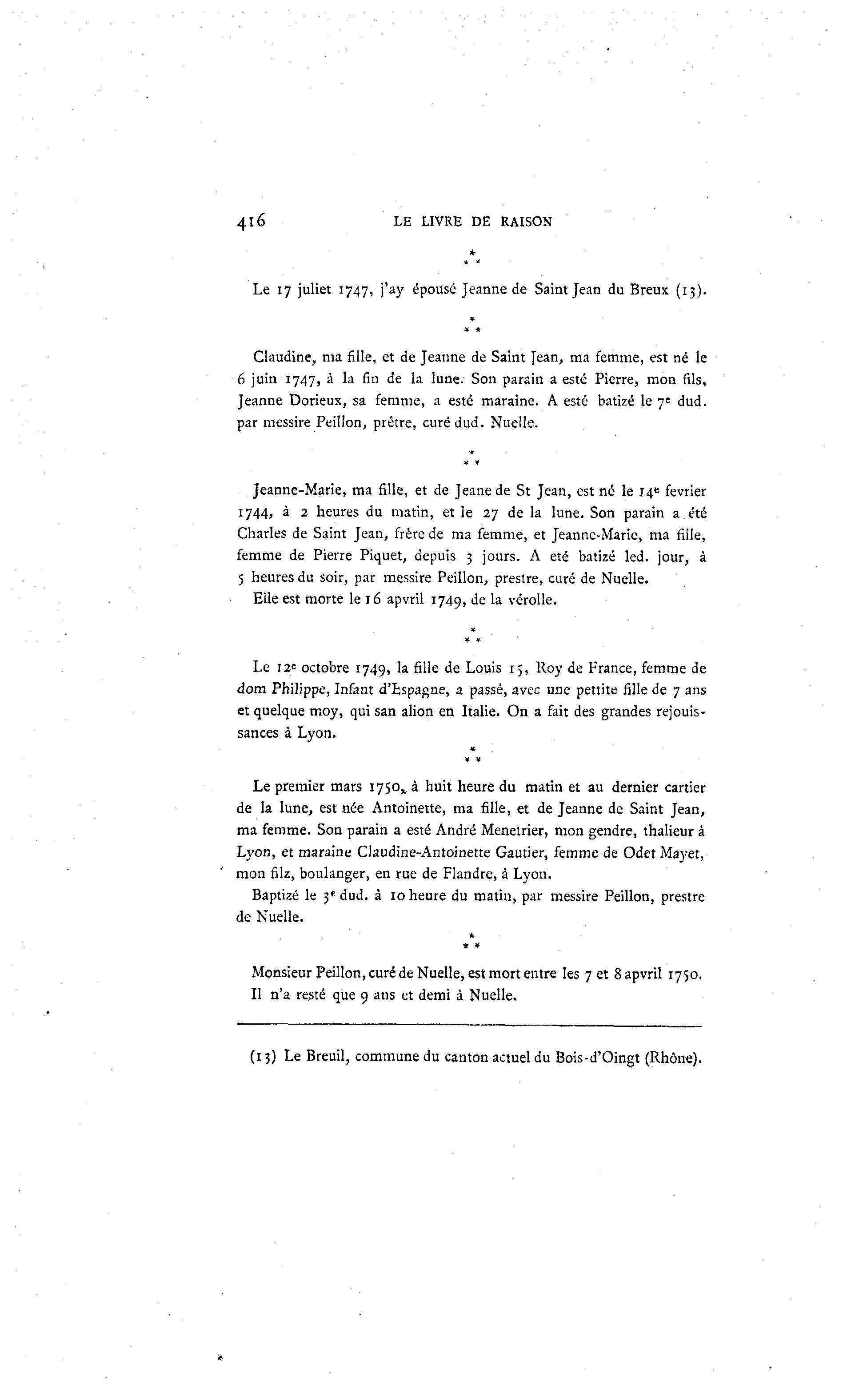 4lé LE LIVRE DE RAISON Le 17 juliet 1747, j'ay épousé Jeanne de Saint Jean du Breux (13). Claudine, ma fille, et de Jeanne de Saint Jean, ma femme, est né le 6 juin 1747, à la fin de la lune. Son parain a esté Pierre, mon fils, Jeanne Dorieux, sa femme, a esté maraine. A esté batizé le 7= dud. par messire Peillon, prêtre, curé dud. Nuelle. * Jeanne-Marie, ma fille, et de Jeane de St Jean, est né le 14e février 1744, à 2 heures du matin, et le 27 de la lune. Son parain a été Charles de Saint Jean, frère de ma femme, et Jeanne-Marie, ma fille, femme de Pierre Piquet, depuis 3 jours. A été batizé led. jour, à 5 heures du soir, par messire Peillon, prestre, curé de Nuelle. Elle est morte le 16 apvril 1749, de la vérolle. Le 12= octobre 1749, la fille de Louis 15, Roy de France, femme de dom Philippe, Infant d'Lspagne, a passé, avec une pettite fille de 7 ans et quelque moy, qui san alion en Italie. On a fait des grandes rejouis- sances à Lyon. » Le premier mars I750 v à huit heure du matin et au dernier cartier de la lune, est née Antoinette, ma fille, et de Jeanne de Saint Jean, ma femme. Son parain a esté André Ménétrier, mon gendre, thalieur à Lyon, et maraine Claudine-Antoinette Gautier, femme de Odet Mayet, mon filz, boulanger, en rue de Flandre, à Lyon. Baptizé le 3e dud. à 10 heure du matin, par messire Peillon, prestre de Nuelle. Monsieur Peillon, curé de Nuelle, est mort entre les 7 et 8 apvril 1750, Il n'a resté que 9 ans et demi à Nuelle. (13) Le Breuil, commune du canton actuel du Bois-d'Oingt (Rhône).
