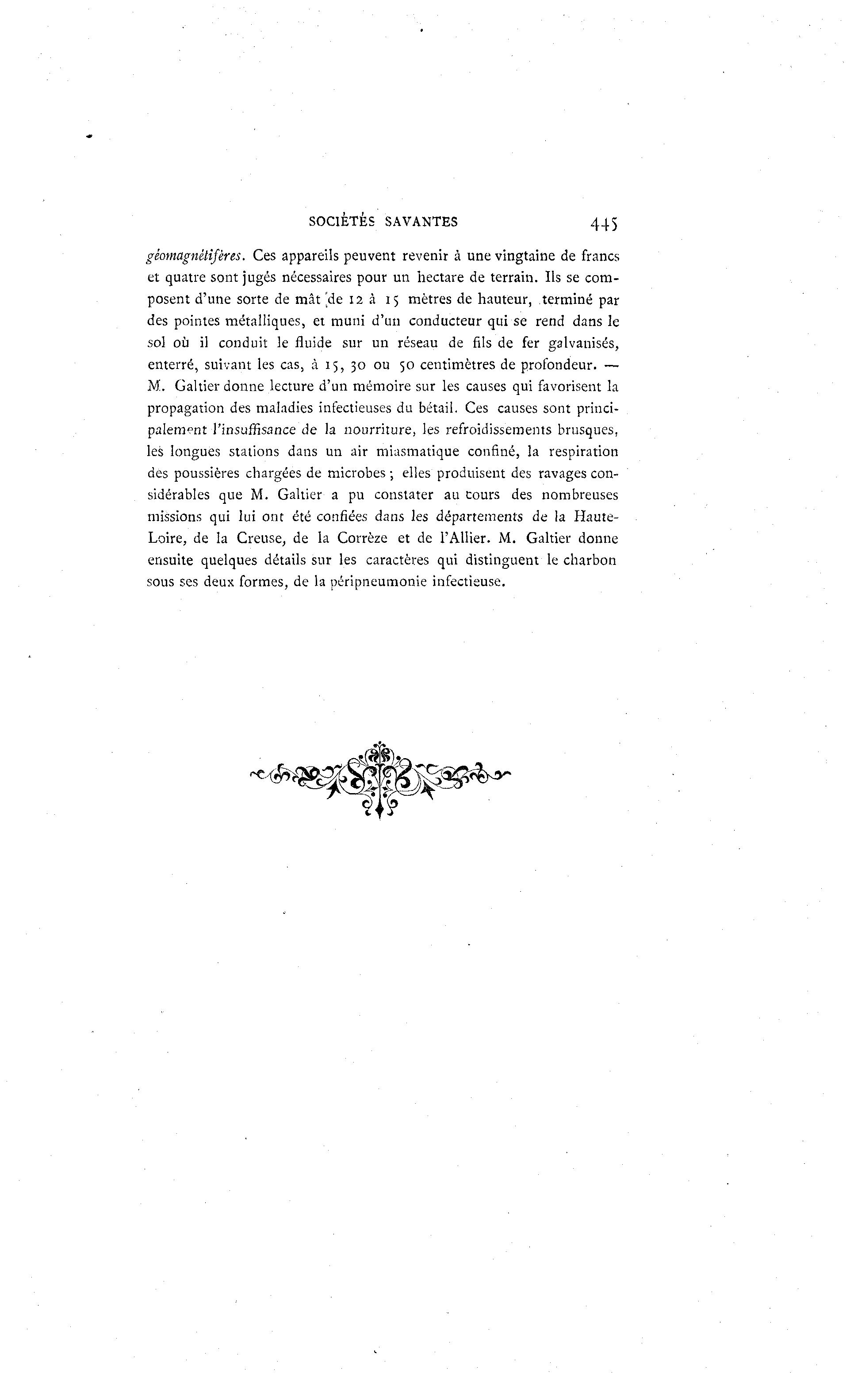 SOCIETES SAVANTES 445 géomagnêtifères. Ces appareils peuvent revenir à une vingtaine de francs et quatre sont jugés nécessaires pour un hectare de terrain. Ils se com- posent d'une sorte de mât [de 12 à 15 mètres de hauteur, terminé par des pointes métalliques, et muni d'un conducteur qui se rend dans le sol où il conduit le fluide sur un réseau de fils de fer galvanisés, enterré, suivant les cas, à 15, 30 ou 50 centimètres de profondeur. — M. Galtier donne lecture d'un mémoire sur les causes qui favorisent la propagation des maladies infectieuses du bétail. Ces causes sont princi- palement l'insuffisance de la nourriture, les refroidissements brusques, les longues stations dans un air miasmatique confiné, la respiration des poussières chargées de microbes ; elles produisent des ravages con- sidérables que M. Galtier a pu constater au cours des nombreuses missions qui lui ont été confiées dans les départements de la Haute- Loire, de la Creuse, de la Corrèze et de l'Allier. M. Galtier donne ensuite quelques détails sur les caractères qui distinguent le charbon sous ses deux formes, de la péripneumonie infectieuse.