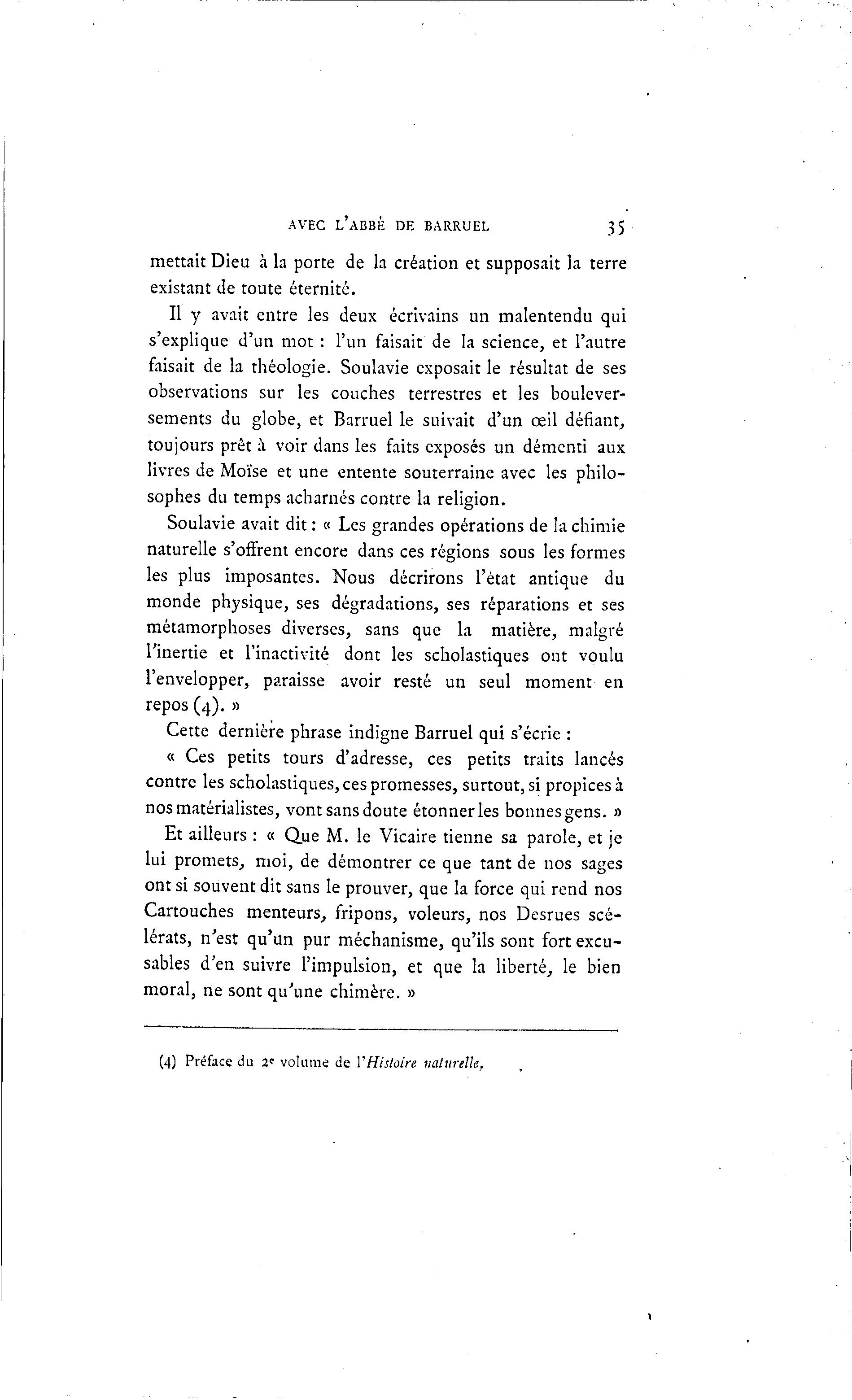 AVEC L'ABBÉ DE BARRUEL 35 mettait Dieu à la porte de la création et supposait la terre existant de toute éternité. Il y avait entre les deux écrivains un malentendu qui s'explique d'un mot : l'un faisait de la science, et l'autre faisait de la théologie. Soulavie exposait le résultat de ses observations sur les couches terrestres et les boulever- sements du globe, et Barruel le suivait d'un œil défiant, toujours prêt à voir dans les faits exposés un démenti aux livres de Moïse et une entente souterraine avec les philo- sophes du temps acharnés contre la religion. Soulavie avait dit : « Les grandes opérations de la chimie naturelle s'offrent encore dans ces régions sous les formes les plus imposantes. Nous décrirons l'état antique du monde physique, ses dégradations, ses réparations et ses métamorphoses diverses, sans que la matière, malgré l'inertie et l'inactivité dont les scholastiques ont voulu l'envelopper, paraisse avoir resté un seul moment en repos (4). » Cette dernière phrase indigne Barruel qui s'écrie : « Ces petits tours d'adresse, ces petits traits lancés contre les scholastiques, ces promesses, surtout, si propices à nos matérialistes, vont sans doute étonner les bonnes gens. » Et ailleurs : « Que M. le Vicaire tienne sa parole, et je lui promets, moi, de démontrer ce que tant de nos sages ont si souvent dit sans le prouver, que la force qui rend nos Cartouches menteurs, fripons, voleurs, nos Desrues scé- lérats, n'est qu'un pur méchanisme, qu'ils sont fort excu- sables d'en suivre l'impulsion, et que la liberté, le bien moral, ne sont qu'une chimère. » (4) Préface du 2' volume de l'Histoire naturelle,