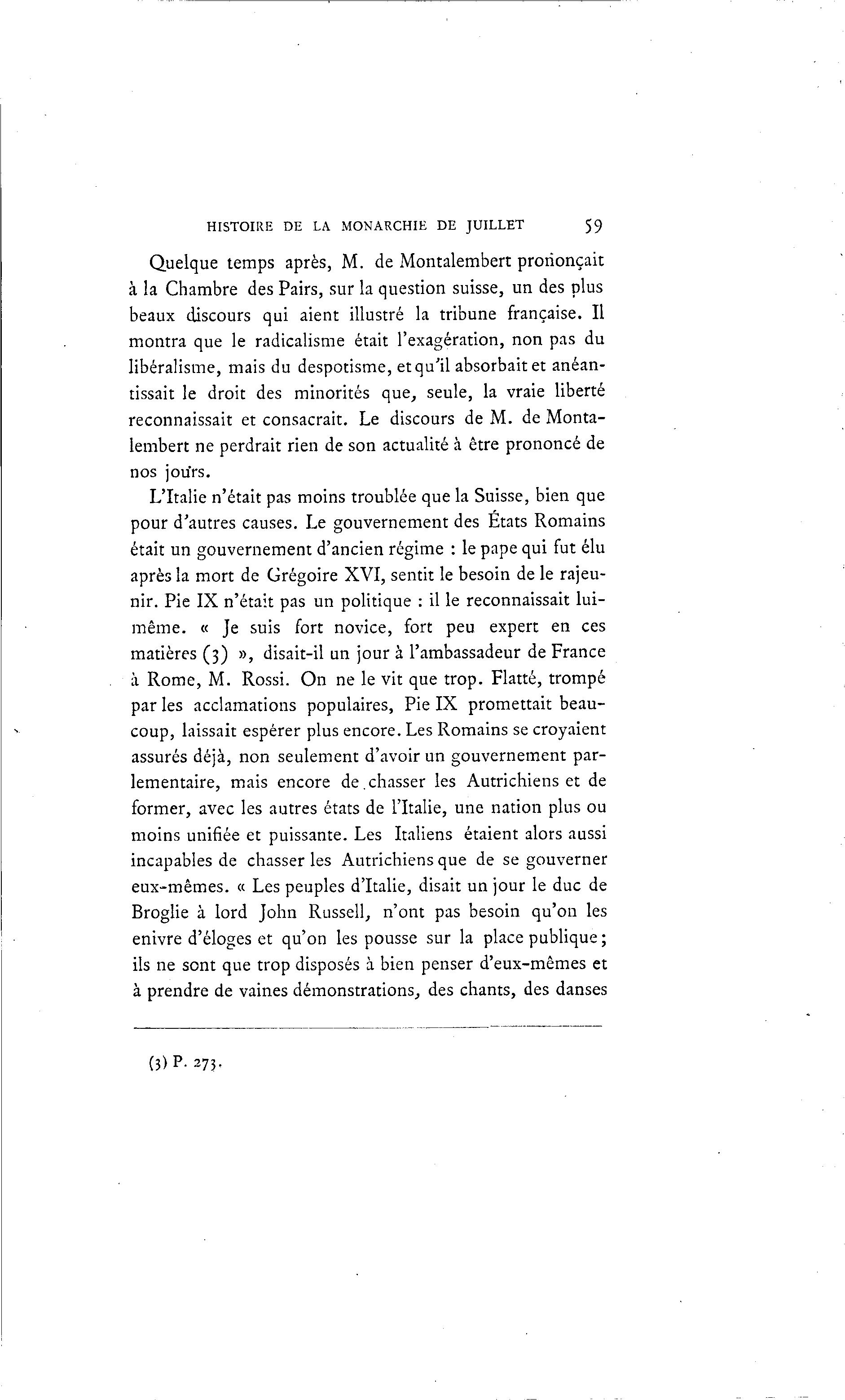 HISTOIRE DE LA MONARCHIE DE JUILLET 59 Quelque temps après, M. de Montalembert prononçait à la Chambre des Pairs, sur la question suisse, un des plus beaux discours qui aient illustré la tribune française. Il montra que le radicalisme était l'exagération, non pas du libéralisme, mais du despotisme, et qu'il absorbait et anéan- tissait le droit des minorités que, seule, la vraie liberté reconnaissait et consacrait. Le discours de M. de Monta- lembert ne perdrait rien de son actualité à être prononcé de nos jou'rs. L'Italie n'était pas moins troublée que la Suisse, bien que pour d'autres causes. Le gouvernement des États Romains était un gouvernement d'ancien régime : le pape qui fut élu après la mort de Grégoire XVI, sentit le besoin de le rajeu- nir. Pie IX n'était pas un politique : il le reconnaissait lui- même. « Je suis fort novice, fort peu expert en ces matières (3) », disait-il un jour à l'ambassadeur de France à Rome, M. Rossi. On ne le vit que trop. Flatté, trompé par les acclamations populaires, Pie IX promettait beau- coup, laissait espérer plus encore. Les Romains se croyaient assurés déjà , non seulement d'avoir un gouvernement par- lementaire, mais encore de.chasser les Autrichiens et de former, avec les autres états de l'Italie, une nation plus ou moins unifiée et puissante. Les Italiens étaient alors aussi incapables de chasser les Autrichiens que de se gouverner eux-mêmes. « Les peuples d'Italie, disait un jour le duc de Broglie à lord John Russell, n'ont pas besoin qu'on les enivre d'éloges et qu'on les pousse sur la place publique; ils ne sont que trop disposés à bien penser d'eux-mêmes et à prendre de vaines démonstrations, des chants, des danses (3) P . 273.
