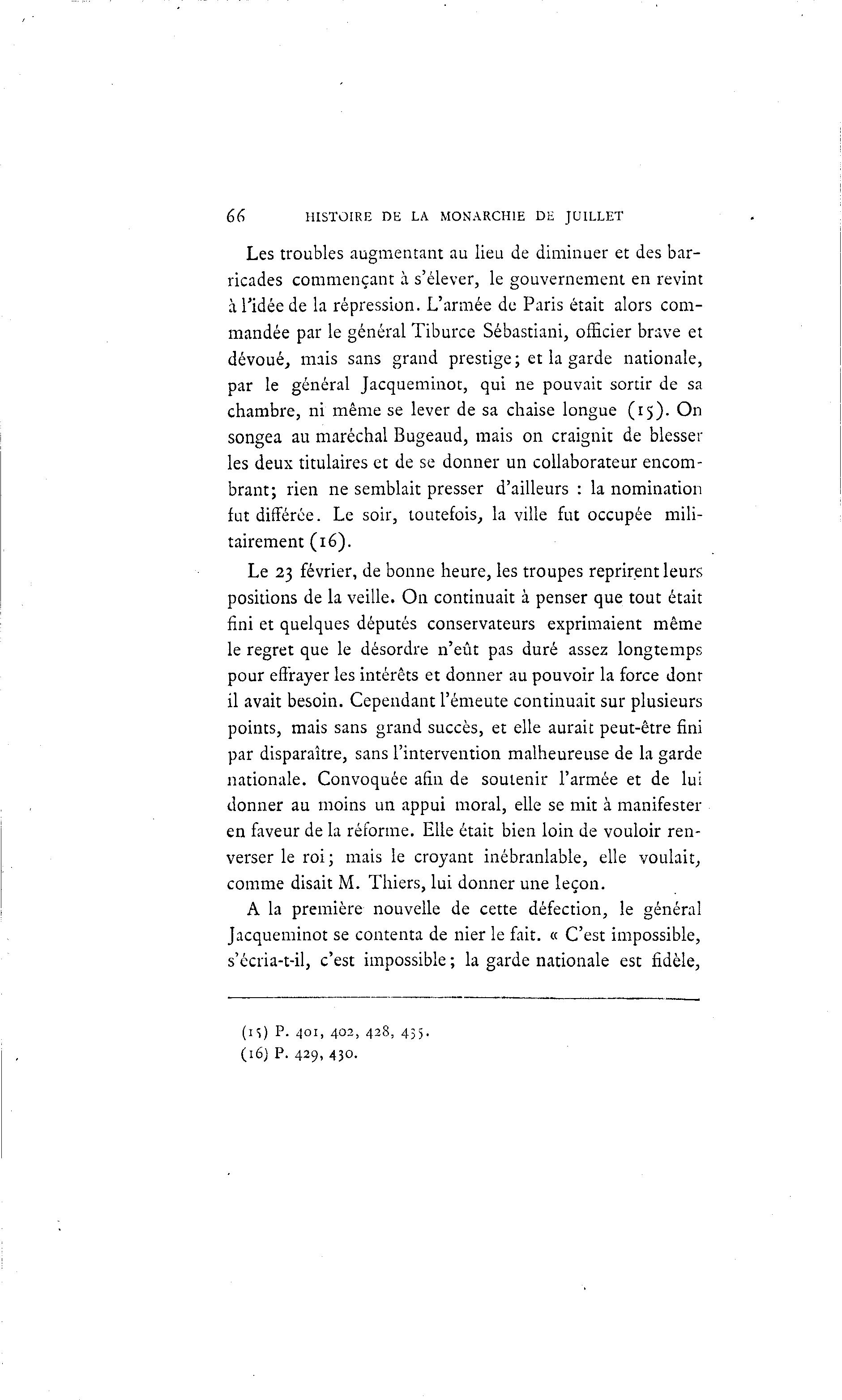 66 HISTOIRE DE LA MONARCHIE DE JUILLET Les troubles augmentant au lieu de diminuer et des bar- ricades commençant à s'élever, le gouvernement en revint à l'idée de la répression. L'armée de Paris était alors com- mandée par le général Tiburce Sébastiani, officier brave et dévoué, mais sans grand prestige; et la garde nationale, par le général Jacqueminot, qui ne pouvait sortir de sa chambre, ni même se lever de sa chaise longue (15). On songea au maréchal Bugeaud, mais on craignit de blesser les deux titulaires et de se donner un collaborateur encom- brant; rien ne semblait presser d'ailleurs : la nomination fut différée. Le soir, toutefois, la ville fut occupée mili- tairement (16). Le 23 février, de bonne heure, les troupes reprirent leurs positions de la veille. On continuait à penser que tout était fini et quelques députés conservateurs exprimaient même le regret que le désordre n'eût pas duré assez longtemps pour effrayer les intérêts et donner au pouvoir la force donr il avait besoin. Cependant l'émeute continuait sur plusieurs points, mais sans grand succès, et elle aurait peut-être fini par disparaître, sans l'intervention malheureuse de la garde nationale. Convoquée afin de soutenir l'armée et de lui donner au moins un appui moral, elle se mit à manifester en faveur de la réforme. Elle était bien loin de vouloir ren- verser le roi; mais le croyant inébranlable, elle voulait, comme disait M. Thiers, lui donner une leçon. A la première nouvelle de cette défection, le général Jacqueminot se contenta de nier le fait. « C'est impossible, s'écria-t-il, c'est impossible ; la garde nationale est fidèle, (11) P. 401, 402, 428, 435. (16) P. 429- 43°-