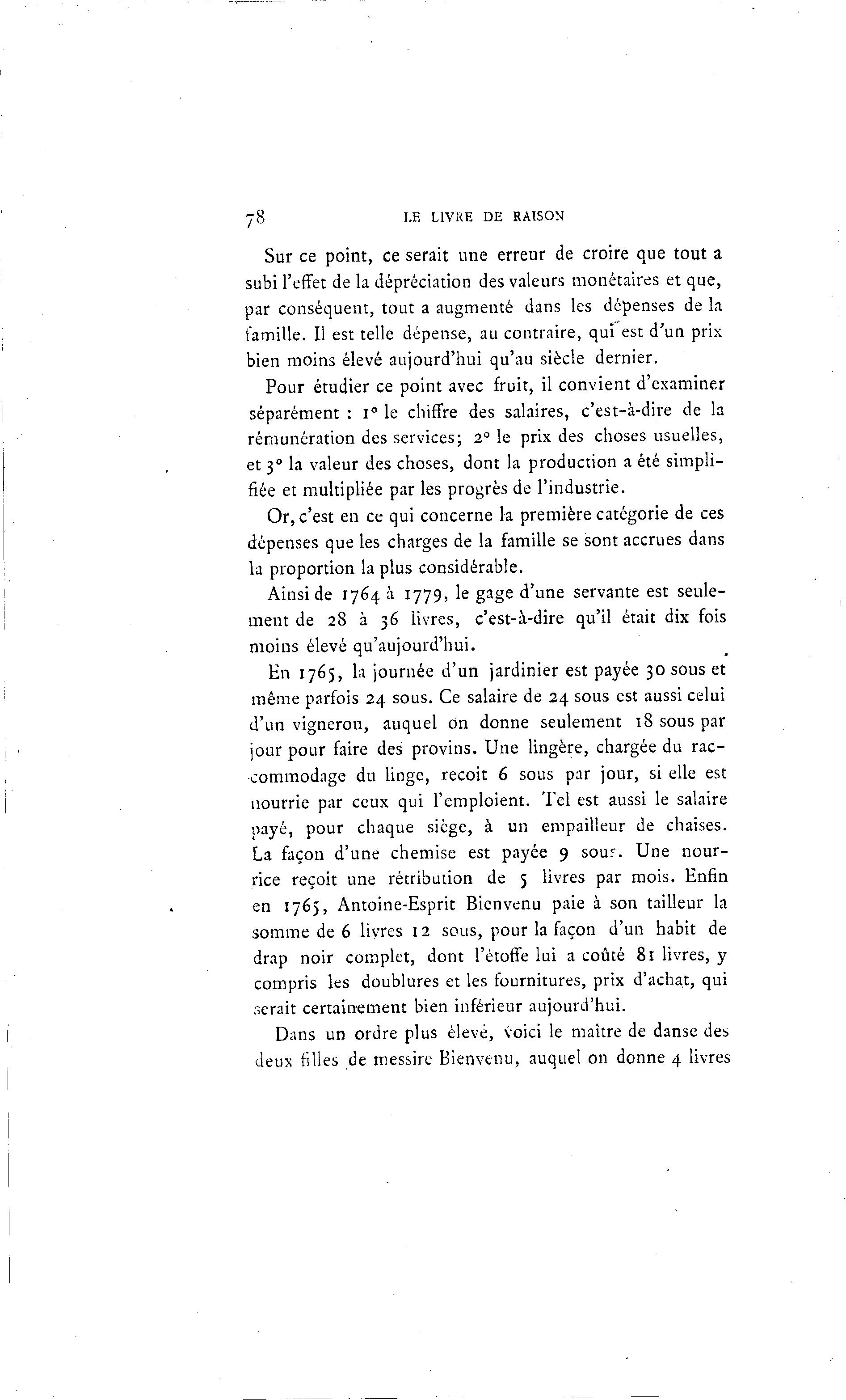 78 LE LIVRE DE RAISON Sur ce point, ce serait une erreur de croire que tout a subi l'effet de la dépréciation des valeurs monétaires et que, par conséquent, tout a augmenté dans les dépenses de la famille. Il est telle dépense, au contraire, qui est d'un prix bien moins élevé aujourd'hui qu'au siècle dernier. Pour étudier ce point avec fruit, il convient d'examiner séparément : i° le chiffre des salaires, c'est-à -dire de la rémunération des services; 2° le prix des choses usuelles, et 3 0 la valeur des choses, dont la production a été simpli- fiée et multipliée par les progrès de l'industrie. Or, c'est en ce qui concerne la première catégorie de ces dépenses que les charges de la famille se sont accrues dans la proportion la plus considérable. Ainsi de 1764 à 1779, le gage d'une servante est seule- ment de 28 à 36 livres, c'est-à -dire qu'il était dix fois moins élevé qu'aujourd'hui. En 1765, la journée d'un jardinier est payée 30 sous et même parfois 24 sous. Ce salaire de 24 sous est aussi celui d'un vigneron, auquel on donne seulement 18 sous par jour pour faire des provins. Une lingère, chargée du rac- commodage du linge, reçoit 6 sous par jour, si elle est nourrie par ceux qui l'emploient. Tel est aussi le salaire payé, pour chaque siège, à un empailleur de chaises. La façon d'une chemise est payée 9 sour. Une nour- rice reçoit une rétribution de 5 livres par mois. Enfin en 1765, Antoine-Esprit Bienvenu paie à son tailleur la somme de 6 livres 12 sous, pour la façon d'un habit de drap noir complet, dont l'étoffe lui a coûté 81 livres, y compris les doublures et les fournitures, prix d'achat, qui serait certainement bien inférieur aujourd'hui. Dans un ordre plus élevé, voici le maître de danse des deux filles de messire Bienvenu, auquel on donne 4 livres