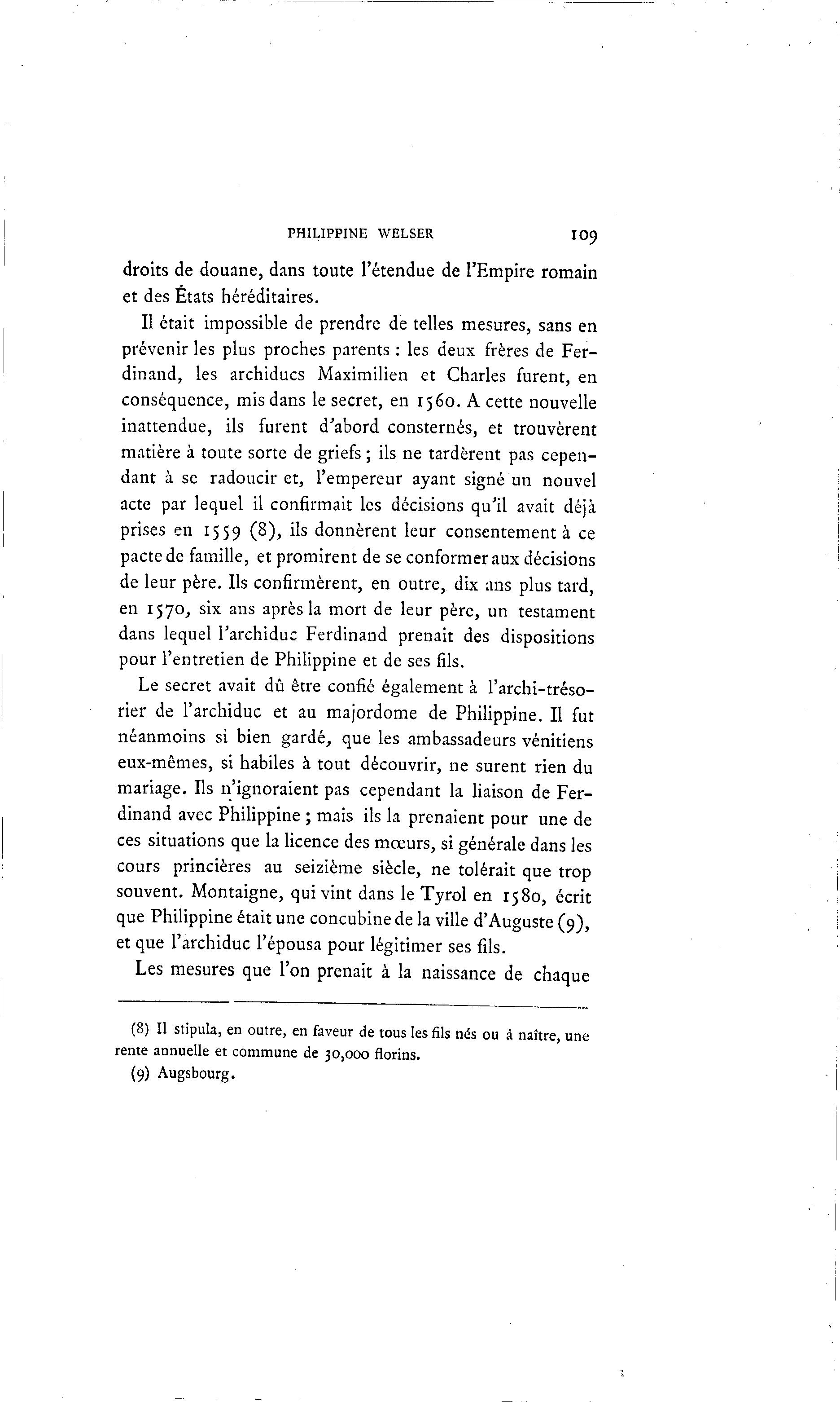 PHILIPPINE WELSER IO9 droits de douane, dans toute l'étendue de l'Empire romain et des États héréditaires. Il était impossible de prendre de telles mesures, sans en prévenir les plus proches parents : les deux frères de Fer- dinand, les archiducs Maximilien et Charles furent, en conséquence, mis dans le secret, en 1560. A cette nouvelle inattendue, ils furent d'abord consternés, et trouvèrent matière à toute sorte de griefs ; ils ne tardèrent pas cepen- dant à se radoucir et, l'empereur ayant signé un nouvel acte par lequel il confirmait les décisions qu'il avait déjà prises en 1559 (8), ils donnèrent leur consentement à ce pacte de famille, et promirent de se conformer aux décisions de leur père. Ils confirmèrent, en outre, dix ans plus tard, en 1570, six ans après la mort de leur père, un testament dans lequel l'archiduc Ferdinand prenait des dispositions pour l'entretien de Philippine et de ses fils. Le secret avait dû être confié également à l'archi-tréso- rier de l'archiduc et au majordome de Philippine. Il fut néanmoins si bien gardé, que les ambassadeurs vénitiens eux-mêmes, si habiles à tout découvrir, ne surent rien du mariage. Ils n'ignoraient pas cependant la liaison de Fer- dinand avec Philippine ; mais ils la prenaient pour une de ces situations que la licence des mœurs, si générale dans les cours princières au seizième siècle, ne tolérait que trop souvent. Montaigne, qui vint dans le Tyrol en 1580, écrit que Philippine était une concubine de la ville d'Auguste (9), et que l'archiduc l'épousa pour légitimer ses fils. Les mesures que l'on prenait à la naissance de chaque (8) Il stipula, en outre, en faveur de tous les fils nés ou à naître, une rente annuelle et commune de 30,000 florins. (9) Augsbourg.