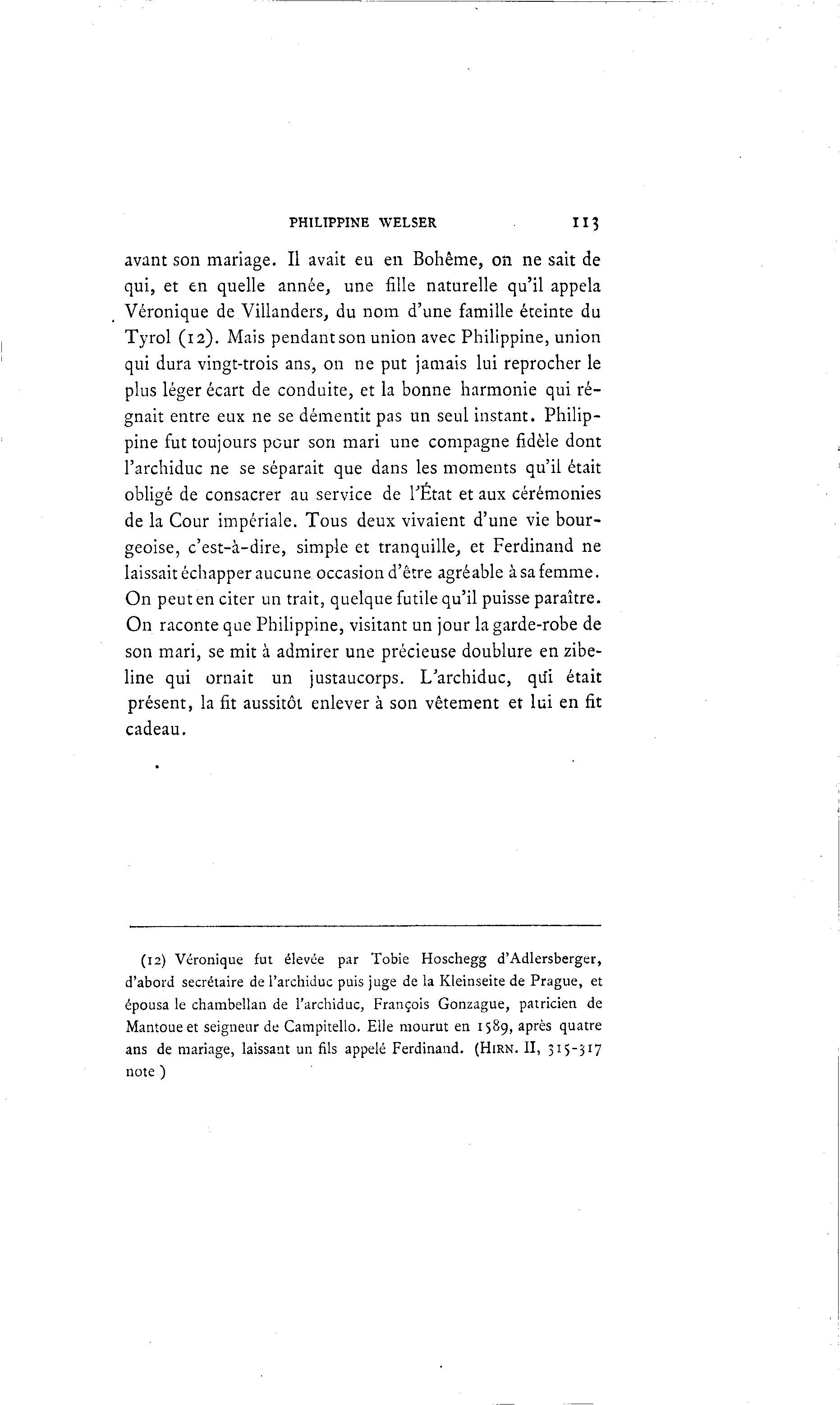 PHILIPPINE WELSER 113 avant son mariage. Il avait eu en Bohême, on ne sait de qui, et en quelle année, une fille naturelle qu'il appela Véronique de Villanders, du nom d'une famille éteinte du Tyrol (12). Mais pendant son union avec Philippine, union qui dura vingt-trois ans, on ne put jamais lui reprocher le plus léger écart de conduite, et la bonne harmonie qui ré- gnait entre eux ne se démentit pas un seul instant. Philip- pine fut toujours pour son mari une compagne fidèle dont l'archiduc ne se séparait que dans les moments qu'il était obligé de consacrer au service de l'Etat et aux cérémonies de la Cour impériale. Tous deux vivaient d'une vie bour- geoise, c'est-à -dire, simple et tranquille, et Ferdinand ne laissait échapper aucune occasion d'être agréable à sa femme. On peut en citer un trait, quelque futile qu'il puisse paraître. On raconte que Philippine, visitant un jour la garde-robe de son mari, se mit à admirer une précieuse doublure en zibe- line qui ornait un justaucorps. L'archiduc, qui était présent, la fit aussitôt enlever à son vêtement et lui en fit cadeau. (12) Véronique fut élevée par Tobie Hoschegg d'Adlersberger, d'abord secrétaire de l'archiduc puis juge de la Kleinseite de Prague, et épousa le chambellan de l'archiduc, François Gonzague, patricien de Mantoueet seigneur de Campitello. Elle mourut en 158g, après quatre ans de mariage, laissant un fils appelé Ferdinand. (HIRN. II, 315-317 note )