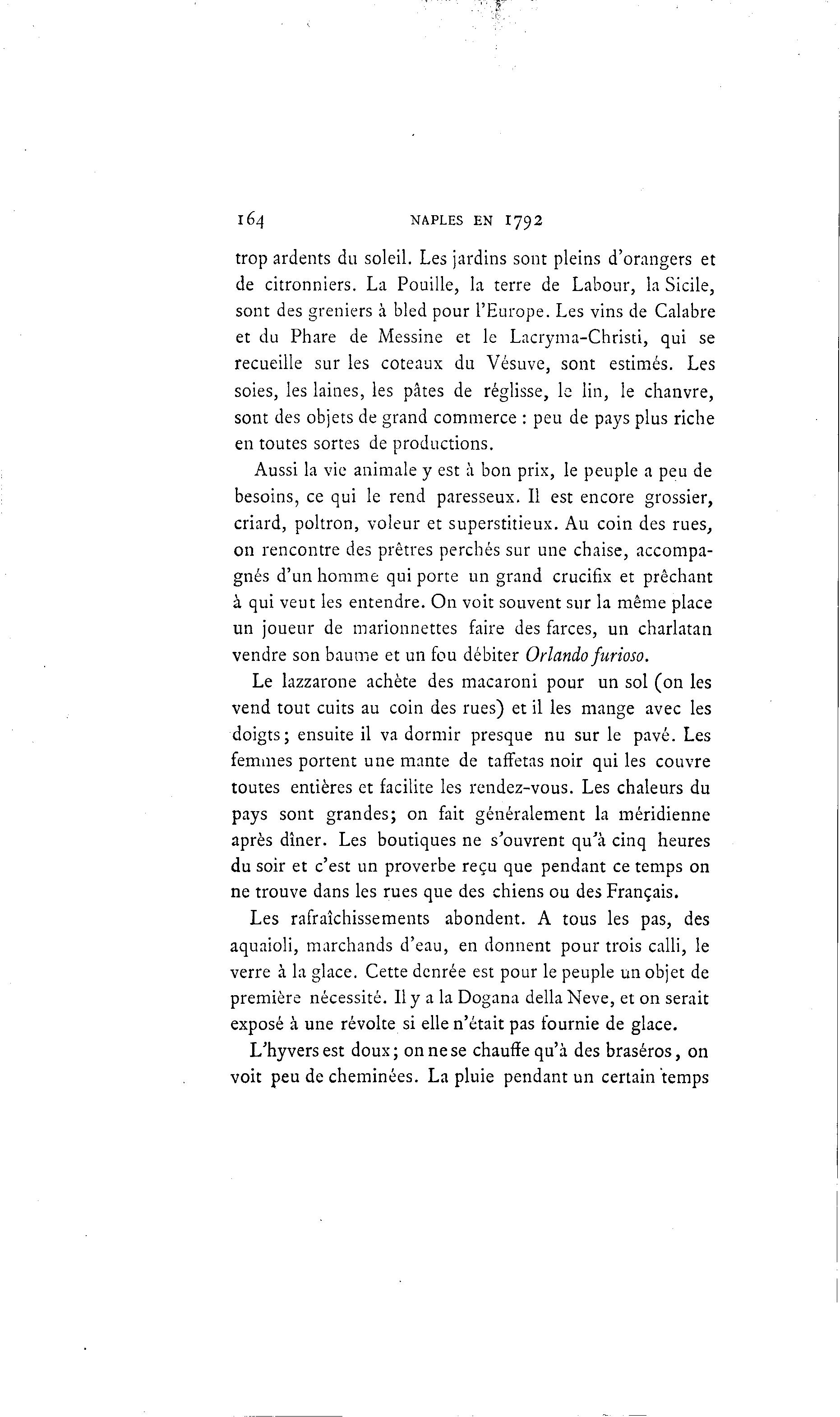 164 NAPLES EN 1792 trop ardents du soleil. Les jardins sont pleins d'orangers et de citronniers. La Pouille, la terre de Labour, la Sicile, sont des greniers à bled pour l'Europe. Les vins de Calabre et du Phare de Messine et le Lacryma-Christi, qui se recueille sur les coteaux du Vésuve, sont estimés. Les soies, les laines, les pâtes de réglisse, le lin, le chanvre, sont des objets de grand commerce : peu de pays plus riche en toutes sortes de productions. Aussi la vie animale y est à bon prix, le peuple a peu de besoins, ce qui le rend paresseux. Il est encore grossier, criard, poltron, voleur et superstitieux. Au coin des rues, on rencontre des prêtres perchés sur une chaise, accompa- gnés d'un homme qui porte un grand crucifix et prêchant à qui veut les entendre. On voit souvent sur la même place un joueur de marionnettes faire des farces, un charlatan vendre son baume et un fou débiter Orlando furioso. Le lazzarone achète des macaroni pour un sol (on les vend tout cuits au coin des rues) et il les mange avec les doigts; ensuite il va dormir presque nu sur le pavé. Les femmes portent une mante de taffetas noir qui les couvre toutes entières et facilite les rendez-vous. Les chaleurs du pays sont grandes; on fait généralement la méridienne après dîner. Les boutiques ne s'ouvrent qu'à cinq heures du soir et c'est un proverbe reçu que pendant ce temps on ne trouve dans les rues que des chiens ou des Français. Les rafraîchissements abondent. A tous les pas, des aquaioli, marchands d'eau, en donnent pour trois calli, le verre à la glace. Cette denrée est pour le peuple un objet de première nécessité. Il y a la Dogana délia Neve, et on serait exposé à une révolte si elle n'était pas fournie de glace. L'hyversest doux; on ne se chauffe qu'à des braseros, on voit peu de cheminées. La pluie pendant un certain temps