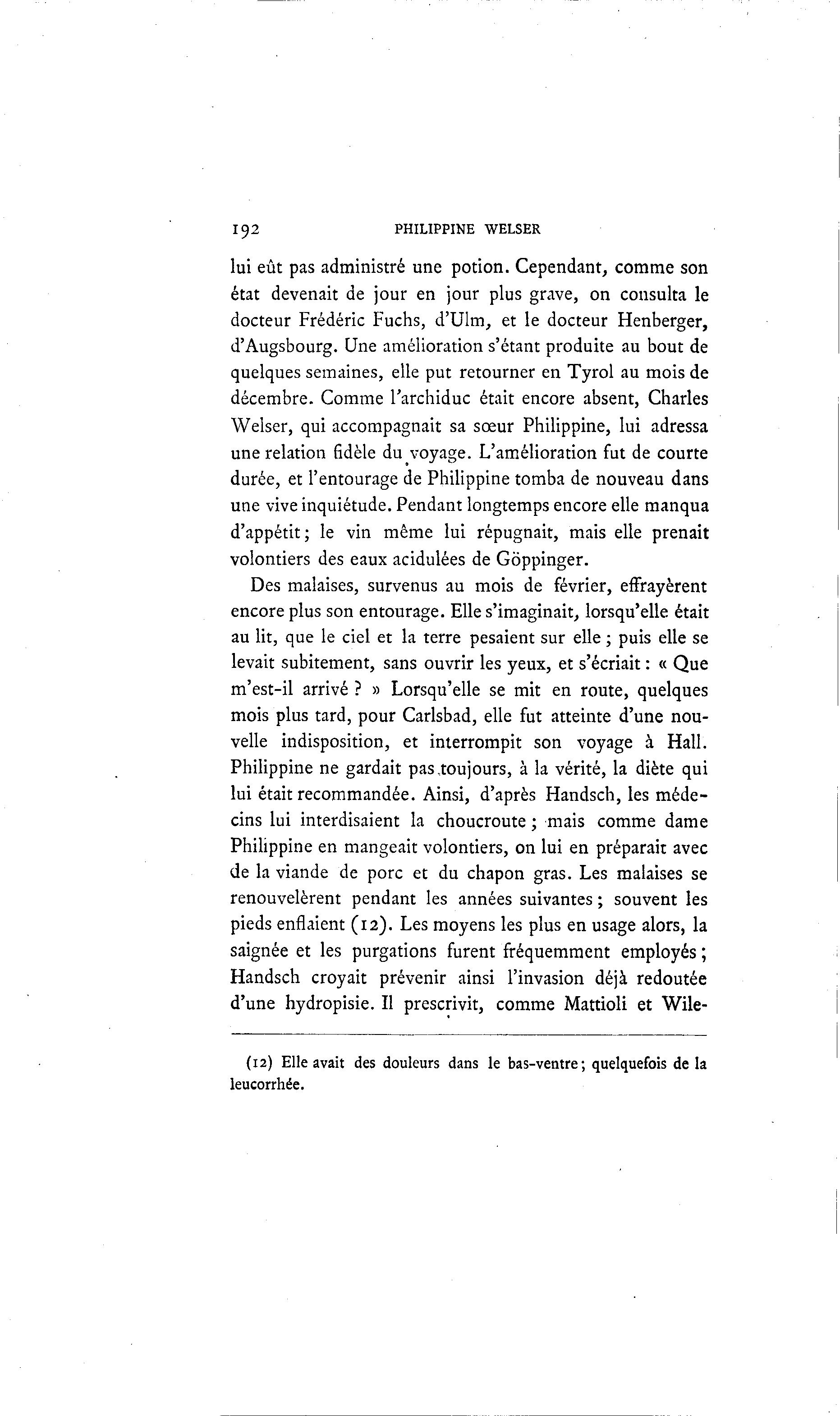 192 PHILIPPINE WELSER lui eût pas administré une potion. Cependant, comme son état devenait de jour en jour plus grave, on consulta le docteur Frédéric Fuchs, d'Ulm, et le docteur Henberger, d'Augsbourg. Une amélioration s'étant produite au bout de quelques semaines, elle put retourner en Tyrol au mois de décembre. Comme l'archiduc était encore absent, Charles Welser, qui accompagnait sa soeur Philippine, lui adressa une relation fidèle du voyage. L'amélioration fut de courte durée, et l'entourage de Philippine tomba de nouveau dans une vive inquiétude. Pendant longtemps encore elle manqua d'appétit; le vin même lui répugnait, mais elle prenait volontiers des eaux acidulées de Gôppinger. Des malaises, survenus au mois de février, effrayèrent encore plus son entourage. Elle s'imaginait, lorsqu'elle était au lit, que le ciel et la terre pesaient sur elle ; puis elle se levait subitement, sans ouvrir les yeux, et s'écriait : « Que m'est-il arrivé ? » Lorsqu'elle se mit en route, quelques mois plus tard, pour Carlsbad, elle fut atteinte d'une nou- velle indisposition, et interrompit son voyage à Hall. Philippine ne gardait pas,toujours, à la vérité, la diète qui lui était recommandée. Ainsi, d'après Handsch, les méde- cins lui interdisaient la choucroute ; mais comme dame Philippine en mangeait volontiers, on lui en préparait avec de la viande de porc et du chapon gras. Les malaises se renouvelèrent pendant les années suivantes ; souvent les pieds enflaient (12). Les moyens les plus en usage alors, la saignée et les purgations furent fréquemment employés ; Handsch croyait prévenir ainsi l'invasion déjà redoutée d'une hydropisie. Il prescrivit, comme Mattioli et Wile- (12) Elle avait des douleurs dans le bas-ventre; quelquefois de la leucorrhée.