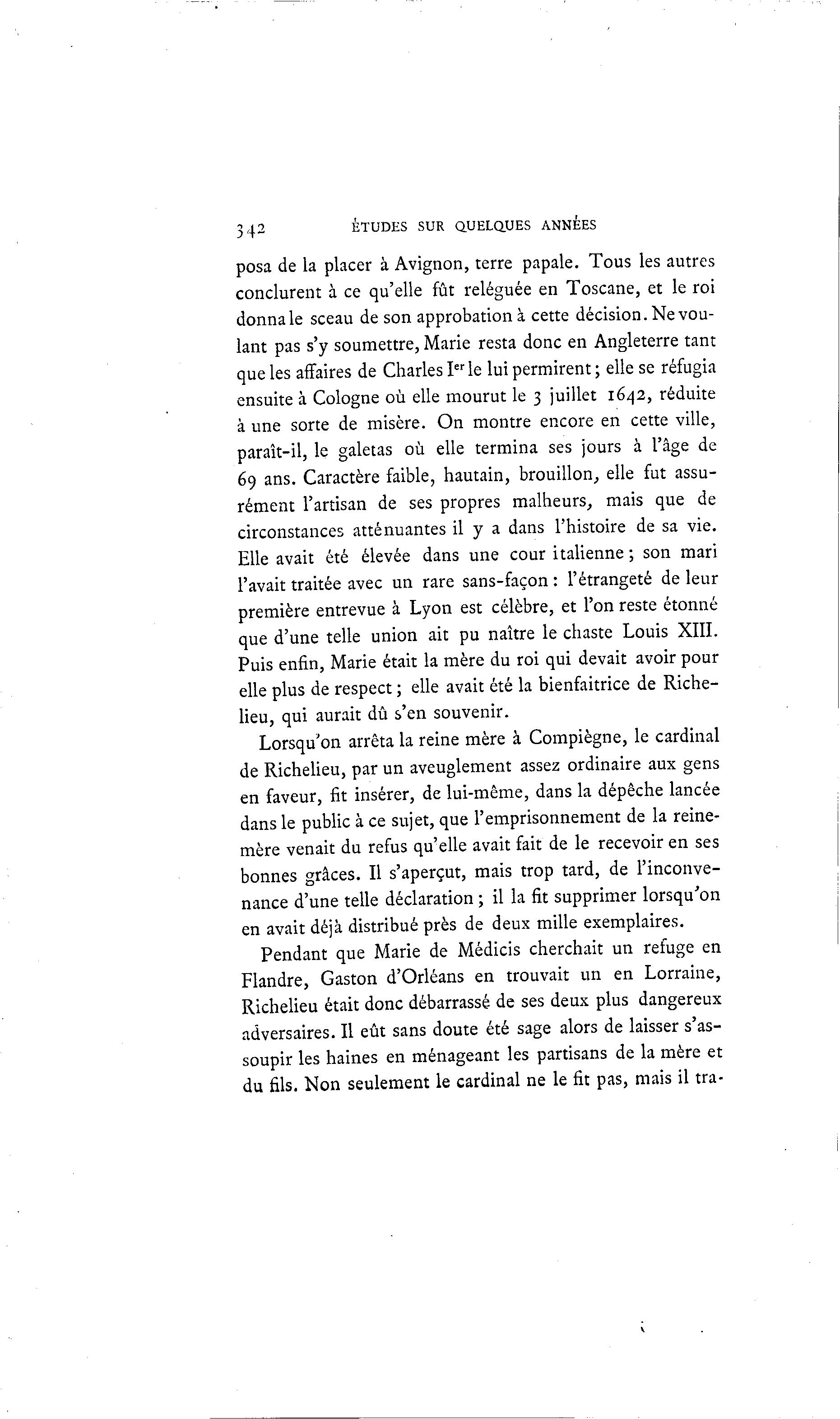 342 ÉTUDES SUR QUELQUES ANNEES posa de la placer à Avignon, terre papale. Tous les autres conclurent à ce qu'elle fût reléguée en Toscane, et le roi donna le sceau de son approbation à cette décision. Ne vou- lant pas s'y soumettre, Marie resta donc en Angleterre tant que les affaires de Charles I er le lui permirent ; elle se réfugia ensuite à Cologne où elle mourut le 3 juillet 1642, réduite à une sorte de misère. On montre encore en cette ville, paraît-il, le galetas où elle termina ses jours à l'âge de 69 ans. Caractère faible, hautain, brouillon, elle fut assu- rément l'artisan de ses propres malheurs, mais que de circonstances atténuantes il y a dans l'histoire de sa vie. Elle avait été élevée dans une cour italienne ; son mari l'avait traitée avec un rare sans-façon : l'étrangeté de leur première entrevue à Lyon est célèbre, et l'on reste étonné que d'une telle union ait pu naître le chaste Louis XIII. Puis enfin, Marie était la mère du roi qui devait avoir pour elle plus de respect ; elle avait été la bienfaitrice de Riche- lieu, qui aurait dû s'en souvenir. Lorsqu'on arrêta la reine mère à Compiègne, le cardinal de Richelieu, par un aveuglement assez ordinaire aux gens en faveur, fit insérer, de lui-même, dans la dépêche lancée dans le public à ce sujet, que l'emprisonnement de la reine- mère venait du refus qu'elle avait fait de le recevoir en ses bonnes grâces. Il s'aperçut, mais trop tard, de l'inconve- nance d'une telle déclaration ; il la fit supprimer lorsqu'on en avait déjà distribué près de deux mille exemplaires. Pendant que Marie de Médicis cherchait un refuge en Flandre, Gaston d'Orléans en trouvait un en Lorraine, Richelieu était donc débarrassé de ses deux plus dangereux adversaires. Il eût sans doute été sage alors de laisser s'as- soupir les haines en ménageant les partisans de la mère et du fils. Non seulement le cardinal ne le fit pas, mais il tra-