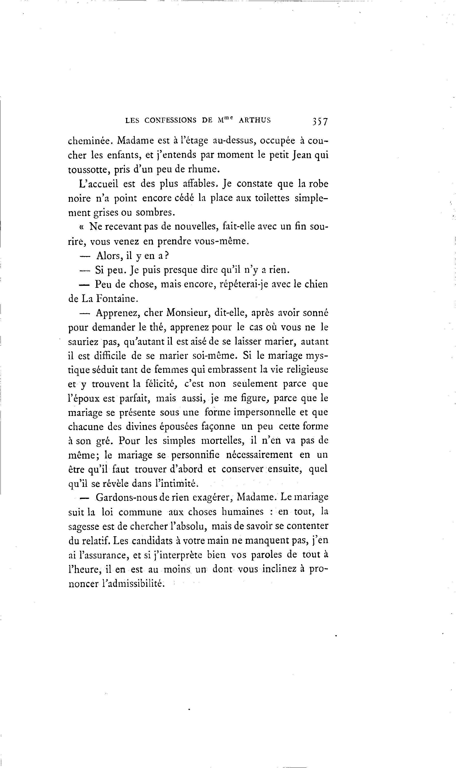 LES CONFESSIONS DE M mc ARTHUS 357 cheminée. Madame est à l'étage au-dessus, occupée à cou- cher les enfants, et j'entends par moment le petit Jean qui toussotte, pris d'un peu de rhume. L'accueil est des plus affables, Je constate que la robe noire n'a point encore cédé la place aux toilettes simple- ment grises ou sombres. « Ne recevant pas de nouvelles, fait-elle avec un fin sou- rire, vous venez en prendre vous-même. — Alors, il y en a? — Si peu. Je puis presque dire qu'il n'y a rien. — Peu de chose, mais encore, répéterai-je avec le chien de La Fontaine. — Apprenez, cher Monsieur, dit-elle, après avoir sonné pour demander le thé, apprenez pour le cas où vous ne le sauriez pas, qu'autant il est aisé de se laisser marier, autant il est difficile de se marier soi-même. Si le mariage mys- tique séduit tant de femmes qui embrassent la vie religieuse et y trouvent la félicité, c'est non seulement parce que l'époux est parfait, mais aussi, je me figure, parce que le mariage se présente sous une forme impersonnelle et que chacune des divines épousées façonne un peu cette forme à son gré. Pour les simples mortelles, il n'en va pas de même; le mariage se personnifie nécessairement en un être qu'il faut trouver d'abord et conserver ensuite, quel qu'il se révèle dans l'intimité. — Gardons-nous de rien exagérer, Madame. Le mariage suit la loi commune aux choses humaines : en tout, la sagesse est de chercher l'absolu, mais de savoir se contenter du relatif. Les candidats à votre main ne manquent pas, j'en ai l'assurance, et si j'interprète bien vos paroles de tout à l'heure, il en est au moins un dont vous inclinez à pro- noncer l'admissibilité.