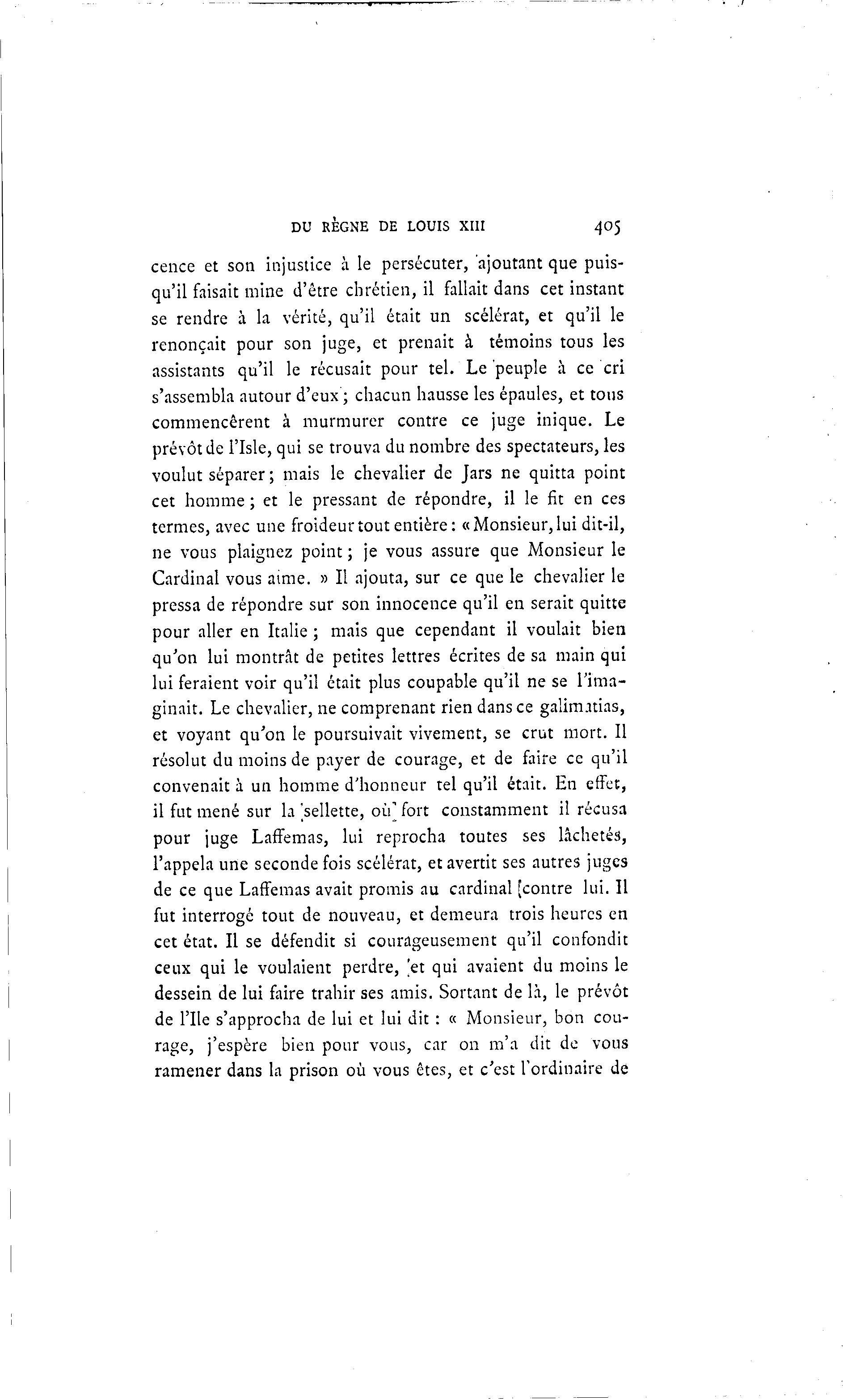 DU RÈGNE DE LOUIS XIII 405 cence et son injustice à le persécuter, ajoutant que puis- qu'il faisait mine d'être chrétien, il fallait dans cet instant se rendre à la vérité, qu'il était un scélérat, et qu'il le renonçait pour son juge, et prenait à témoins tous les assistants qu'il le récusait pour tel. Le peuple à ce cri s'assembla autour d'eux ; chacun hausse les épaules, et tous commencèrent à murmurer contre ce juge inique. Le prévôt de l'Isle, qui se trouva du nombre des spectateurs, les voulut séparer ; mais le chevalier de Jars ne quitta point cet homme ; et le pressant de répondre, il le fit en ces termes, avec une froideur tout entière: «Monsieur, lui dit-il, ne vous plaignez point ; je vous assure que Monsieur le Cardinal vous aime. » Il ajouta, sur ce que le chevalier le pressa de répondre sur son innocence qu'il en serait quitte pour aller en Italie ; mais que cependant il voulait bien qu'on lui montrât de petites lettres écrites de sa main qui lui feraient voir qu'il était plus coupable qu'il ne se l'ima- ginait. Le chevalier, ne comprenant rien dans ce galimatias, et voyant qu'on le poursuivait vivement, se crut mort. Il résolut du moins de payer de courage, et de faire ce qu'il convenait à un homme d'honneur tel qu'il était. En effet, il fut mené sur la 'sellette, où" fort constamment il récusa pour juge Laffemas, lui reprocha toutes ses lâchetés, l'appela une seconde fois scélérat, et avertit ses autres juges de ce que Laffemas avait promis au cardinal [contre lui. Il fut interrogé tout de nouveau, et demeura trois heures en cet état. Il se défendit si courageusement qu'il confondit ceux qui le voulaient perdre, 'et qui avaient du moins le dessein de lui faire trahir ses amis. Sortant de là , le prévôt de l'Ile s'approcha de lui et lui dit : « Monsieur, bon cou- rage, j'espère bien pour vous, car on m'a dit de vous ramener dans la prison où vous êtes, et c'est l'ordinaire de
