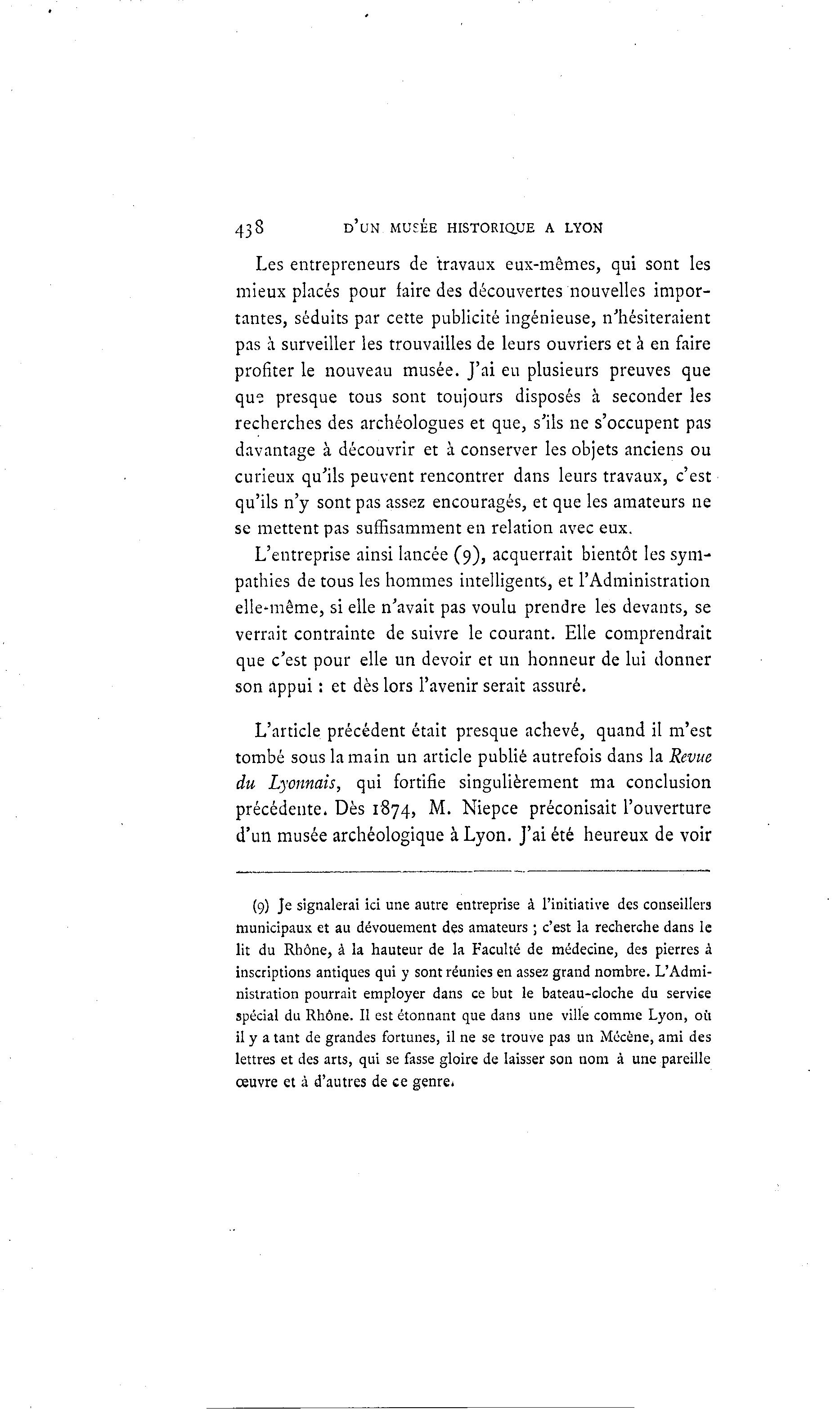 438 D'UN MUSÉE HISTORIQUE A LYON Les entrepreneurs de travaux eux-mêmes, qui sont les mieux placés pour taire des découvertes nouvelles impor- tantes, séduits par cette publicité ingénieuse, n'hésiteraient pas à surveiller les trouvailles de leurs ouvriers et à en faire profiter le nouveau musée. J'ai eu plusieurs preuves que que presque tous sont toujours disposés à seconder les recherches des archéologues et que, s'ils ne s'occupent pas davantage à découvrir et à conserver les objets anciens ou curieux qu'ils peuvent rencontrer dans leurs travaux, c'est qu'ils n'y sont pas assez encouragés, et que les amateurs ne se mettent pas suffisamment en relation avec eux. L'entreprise ainsi lancée (9), acquerrait bientôt les sym- pathies de tous les hommes intelligents, et l'Administration elle-même, si elle n'avait pas voulu prendre les devants, se verrait contrainte de suivre le courant. Elle comprendrait que c'est pour elle un devoir et un honneur de lui donner son appui : et dès lors l'avenir serait assuré. L'article précédent était presque achevé, quand il m'est tombé sous la main un article publié autrefois dans la Revue du Lyonnais, qui fortifie singulièrement ma conclusion précédente. Dès 1874, M. Niepce préconisait l'ouverture d'un musée archéologique à Lyon. J'ai été heureux de voir (9) Je signalerai ici une autre entreprise à l'initiative des conseillers municipaux et au dévouement des amateurs ; c'est la recherche dans le lit du Rhône, à la hauteur de la Faculté de médecine, des pierres à inscriptions antiques qui y sont réunies en assez grand nombre. L'Admi- nistration pourrait employer dans ce but le bateau-cloche du service spécial du Rhône. Il est étonnant que dans une ville comme Lyon, oii il y a tant de grandes fortunes, il ne se trouve pas un Mécène, ami des lettres et des arts, qui se fasse gloire de laisser son nom à une pareille œuvre et à d'autres de ce genre.
