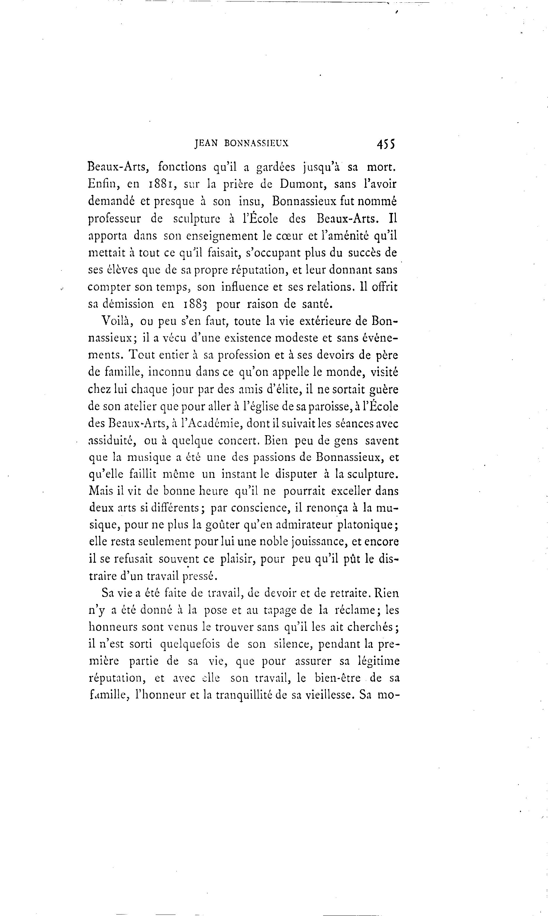 JEAN BONNASSIEUX 45 S Beaux-Arts, fonctions qu'il a gardées jusqu'à sa mort. Enfin, en 1881, sur la prière de Dumont, sans l'avoir demandé et presque à son insu, Bonnassieux fut nommé professeur de sculpture à l'Ecole des Beaux-Arts. Il apporta dans son enseignement le cœur et l'aménité qu'il mettait à tout ce qu'il faisait, s'occupant plus du succès de ses élèves que de sa propre réputation, et leur donnant sans compter son temps, son influence et ses relations. 11 offrit sa démission en 1883 pour raison de santé. Voilà , ou peu s'en faut, toute la vie extérieure de Bon- nassieux; il a vécu d'une existence modeste et sans événe- ments. Tout entier à sa profession et à ses devoirs de père de famille, inconnu dans ce qu'on appelle le monde, visité chez lui chaque jour par des amis d'élite, il ne sortait guère de son atelier que pour aller à l'église de sa paroisse, à l'Ecole des Beaux-Arts, à l'Académie, dont il suivait les séances avec assiduité, ou à quelque concert. Bien peu de gens savent que la musique a été une des passions de Bonnassieux, et qu'elle faillit même un instant le disputer à la sculpture. Mais il vit de bonne heure qu'il ne pourrait exceller dans deux arts si différents ; par conscience, il renonça à la mu- sique, pour ne plus la goûter qu'en admirateur platonique; elle resta seulement pour lui une noble jouissance, et encore il se refusait souvent ce plaisir, pour peu qu'il pût le dis- traire d'un travail pressé. Sa vie a été faite de travail, de devoir et de retraite. Rien n'y a été donné à la pose et au tapage de la réclame; les honneurs sont venus le trouver sans qu'il les ait cherchés ; il n'est sorti quelquefois de son silence, pendant la pre- mière partie de sa vie, que pour assurer sa légitime réputation, et avec elle son travail, le bien-être de sa famille, l'honneur et la tranquillité de sa vieillesse. Sa mo-
