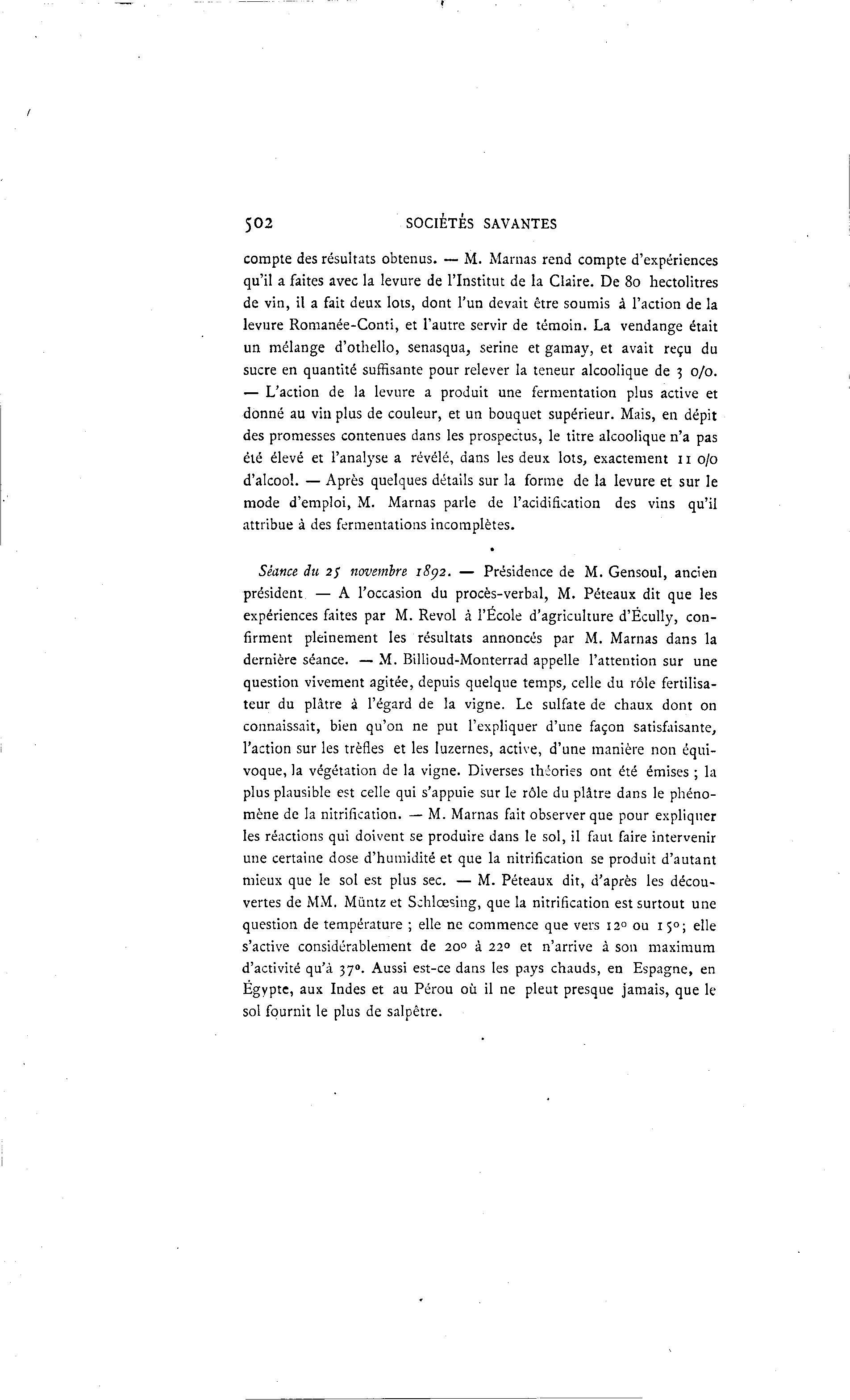 502 SOCIÉTÉS SAVANTES compte des résultats obtenus. — M. Marnas rend compte d'expériences qu'il a faites avec la levure de l'Institut de la Claire. De 80 hectolitres de vin, il a fait deux lots, dont l'un devait être soumis à l'action de la levure Romanée-Conti, et l'autre servir de témoin. La vendange était un mélange d'othello, senasqua, serine et gamay, et avait reçu du sucre en quantité suffisante pour relever la teneur alcoolique de 3 0/0. — L'action de la levure a produit une fermentation plus active et donné au vin plus de couleur, et un bouquet supérieur. Mais, en dépit des promesses contenues dans les prospectus, le titre alcoolique n'a pas été élevé et l'analyse a révélé, dans les deux lots, exactement 11 0/0 d'alcool. — Après quelques détails sur la forme de la levure et sur le mode d'emploi, M. Marnas parle de l'acidification des vins qu'il attribue à des fermentations incomplètes. Séance au 2 / novembre 1892. — Présidence de M. Gensoul, ancien président — A l'occasion du procès-verbal, M. Péteaux dit que les expériences faites par M. Revol à l'École d'agriculture d'Écully, con- firment pleinement les résultats annoncés par M. Marnas dans la dernière séance. — M. Billioud-Monterrad appelle l'attention sur une question vivement agitée, depuis quelque temps, celle du rôle fertilisa- teur du plâtre à l'égard de la vigne. Le sulfate de chaux dont on connaissait, bien qu'on ne put l'expliquer d'une façon satisfaisante, l'action sur les trèfles et les luzernes, active, d'une manière non équi- voque, la végétation de la vigne. Diverses théories ont été émises ; la plus plausible est celle qui s'appuie sur le rôle du plâtre dans le phéno- mène de la nitrification. — M. Marnas fait observer que pour expliquer les réactions qui doivent se produire dans le sol, il faut faire intervenir une certaine dose d'humidité et que la nitrification se produit d'autant mieux que le sol est plus sec. — M. Péteaux dit, d'après les décou- vertes de MM. Mùntzet Schlœsing, que la nitrification est surtout une question de température ; elle ne commence que vers 120 ou 15°; elle s'active considérablement de 20 0 à 22 0 et n'arrive à son maximum d'activité qu'à 37 0 . Aussi est-ce dans les pays chauds, en Espagne, en Egypte, aux Indes et au Pérou où il ne pleut presque jamais, que le sol fournit le plus de salpêtre.