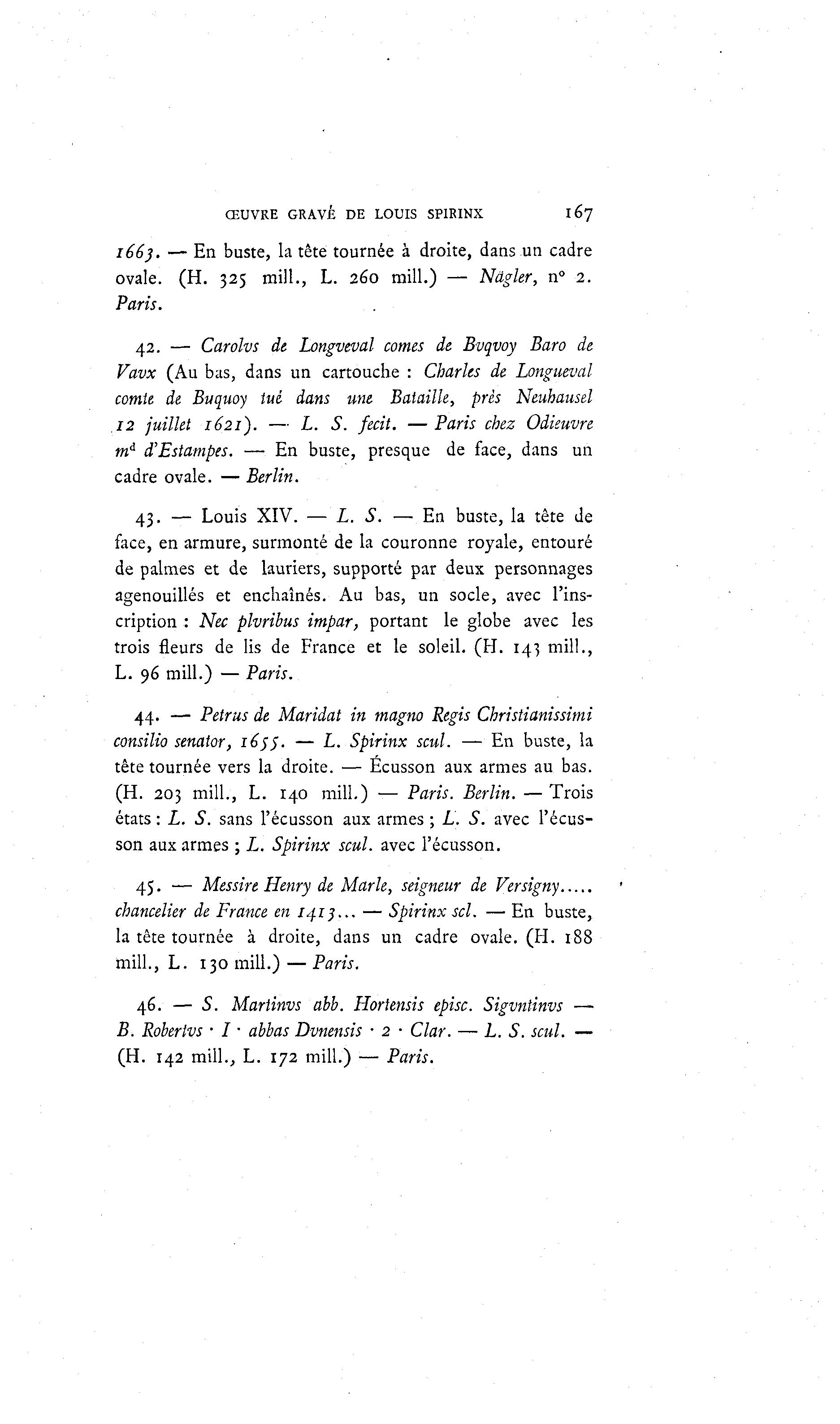 ŒUVRE GRAVÉ DE LOUIS SP1RINX 167 1663. — En buste, la tête tournée à droite, dans un cadre ovale. (H. 325 mill., L. 260 mill.) — Nagler, n° 2. Paris. 42. — Carolvs de Longveval cornes de Bvqvoy Baro de Vavx (Au bas, dans un cartouche : Charles de Longueval comie de Buquoy tué dans une Bataille, près Neuhausel 12 juillet 1621). — L. S. fecit. —Paris chez Odieuvre tni d'Estampes. — En buste, presque de face, dans un cadre ovale. — Berlin. 43. — Louis XIV. — L. S. — En buste, la tête de face, en armure, surmonté de la couronne royale, entouré de palmes et de lauriers, supporté par deux personnages agenouillés et enchaînés. Au bas, un socle, avec l'ins- cription : Nec plvribus impar, portant le globe avec les trois fleurs de lis de France et le soleil. (H. 143 mill., L. 96 mill.) — Paris. 44. — Petrus de Maridat in magno Régis Christianissimi consilio senator, i(>SS- — L. Spirinx seul. — En buste, la tête tournée vers la droite. — Écusson aux armes au bas. (H. 203 mill., L. 140 mill.) — Paris. Berlin. — Trois états : L. S. sans l'écusson aux armes ; L. S. avec l'écus- son aux armes ; L. Spirinx seul, avec l'écusson. 45. — Messire Henry de Marie, seigneur de Versigny chancelier de France en 1413... — Spirinx sel. — En buste, la tête tournée à droite, dans un cadre ovale. (H. 188 mill., L. 130 mill.) — Paris. 46. — S. Mariinvs abb. Hortensis episc. Sigvntinvs — B. Robertvs • I • abbas Dvnensis • 2 • Clar. — L. S. seul. — (H. 142 mill., L. 172 mill.) — Paris.