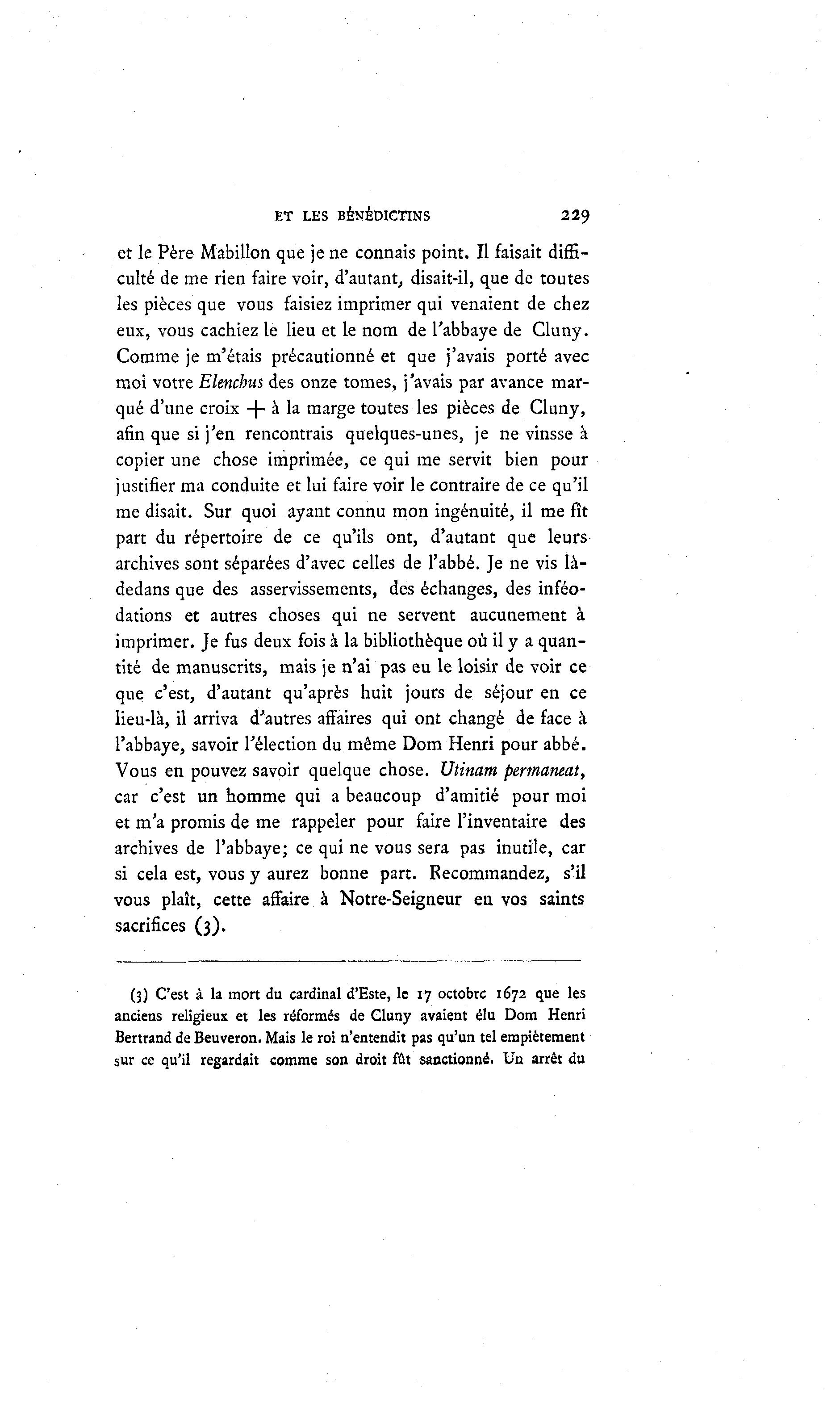 ET LES BÉNÉDICTINS 229 et le Père Mabillon que je ne connais point. Il faisait diffi- culté de me rien faire voir, d'autant, disait-il, que de toutes les pièces que vous faisiez imprimer qui venaient de chez eux, vous cachiez le lieu et le nom de l'abbaye de Cluny. Comme je m'étais précautionné et que j'avais porté avec moi votre Elenchus des onze tomes, j'avais par avance mar- qué d'une croix -(- à la marge toutes les pièces de Cluny, afin que si j'en rencontrais quelques-unes, je ne vinsse à copier une chose imprimée, ce qui me servit bien pour justifier ma conduite et lui faire voir le contraire de ce qu'il me disait. Sur quoi ayant connu mon ingénuité, il me fît part du répertoire de ce qu'ils ont, d'autant que leurs archives sont séparées d'avec celles de l'abbé. Je ne vis là - dedans que des asservissements, des échanges, des inféo- dations et autres choses qui ne servent aucunement à imprimer. Je fus deux fois à la bibliothèque où il y a quan- tité de manuscrits, mais je n'ai pas eu le loisir de voir ce que c'est, d'autant qu'après huit jours de séjour en ce lieu-là , il arriva d'autres affaires qui ont changé de face à l'abbaye, savoir l'élection du même Dom Henri pour abbé. Vous en pouvez savoir quelque chose. Utinam permaneat, car c'est un homme qui a beaucoup d'amitié pour moi et m'a promis de me rappeler pour faire l'inventaire des archives de l'abbaye; ce qui ne vous sera pas inutile, car si cela est, vous y aurez bonne part. Recommandez, s'il vous plaît, cette affaire à Notre-Seigneur en vos saints sacrifices (3). (3) C'est à la mort du cardinal d'Esté, le 17 octobre 1672 que les anciens religieux et les réformés de Gluny avaient élu Dom Henri Bertrand de Beuveron. Mais le roi n'entendit pas qu'un tel empiétement sur ce qu'il regardait comme son droit fût sanctionné. Un arrêt du