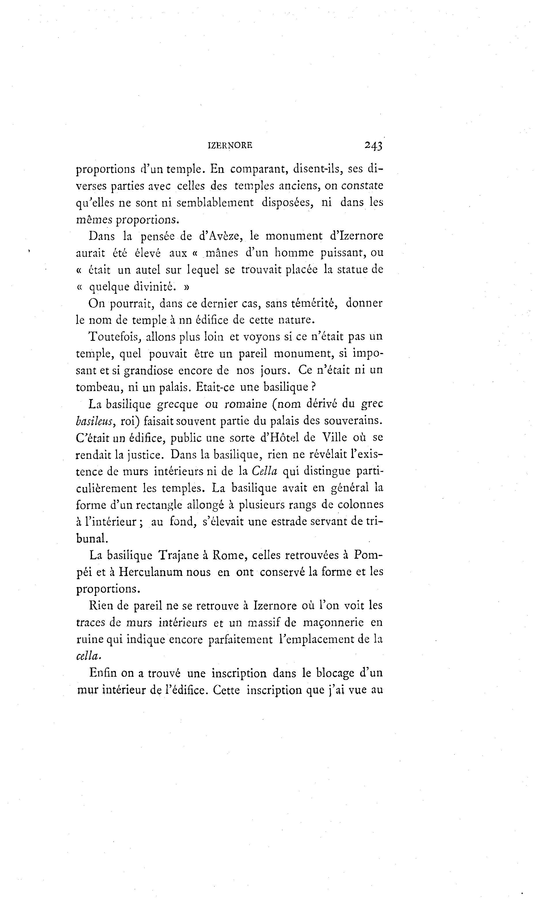 IZERNORF. 243 proportions d'un temple. En comparant, disent-ils, ses di- verses parties avec celles des temples anciens, on constate qu'elles ne sont ni semblablement disposées, ni dans les mêmes proportions. Dans la pensée de d'Avèze, le monument d'Izernore aurait été élevé aux « mânes d'un homme puissant, ou « était un autel sur lequel se trouvait placée la statue de « quelque divinité. » On pourrait, dans ce dernier cas, sans témérité, donner le nom de temple à nn édifice de cette nature. Toutefois, allons plus loin et voyons si ce n'était pas un temple, quel pouvait être un pareil monument, si impo- sant et si grandiose encore de nos jours. Ce n'était ni un tombeau, ni un palais. Etait-ce une basilique ? La basilique grecque ou romaine (nom dérivé du grec basilcus, roi) faisait souvent partie du palais des souverains. C'était un édifice, public une sorte d'Hôtel de Ville où se rendait la justice. Dans la basilique, rien ne révélait l'exis- tence de murs intérieurs ni de la Cella qui distingue parti- culièrement les temples. La basilique avait en général la forme d'un rectangle allongé à plusieurs rangs de colonnes à l'intérieur ; au fond, s'élevait une estrade servant de tri- bunal. La basilique Trajane à Rome, celles retrouvées à Pom- péi et à Herculanum nous en ont conservé la forme et les proportions. Rien de pareil ne se retrouve à Izernore où l'on voit les traces de murs intérieurs et un massif de maçonnerie en ruine qui indique encore parfaitement l'emplacement de la cella. Enfin on a trouvé une inscription dans le blocage d'un mur intérieur de l'édifice. Cette inscription que j'ai vue au