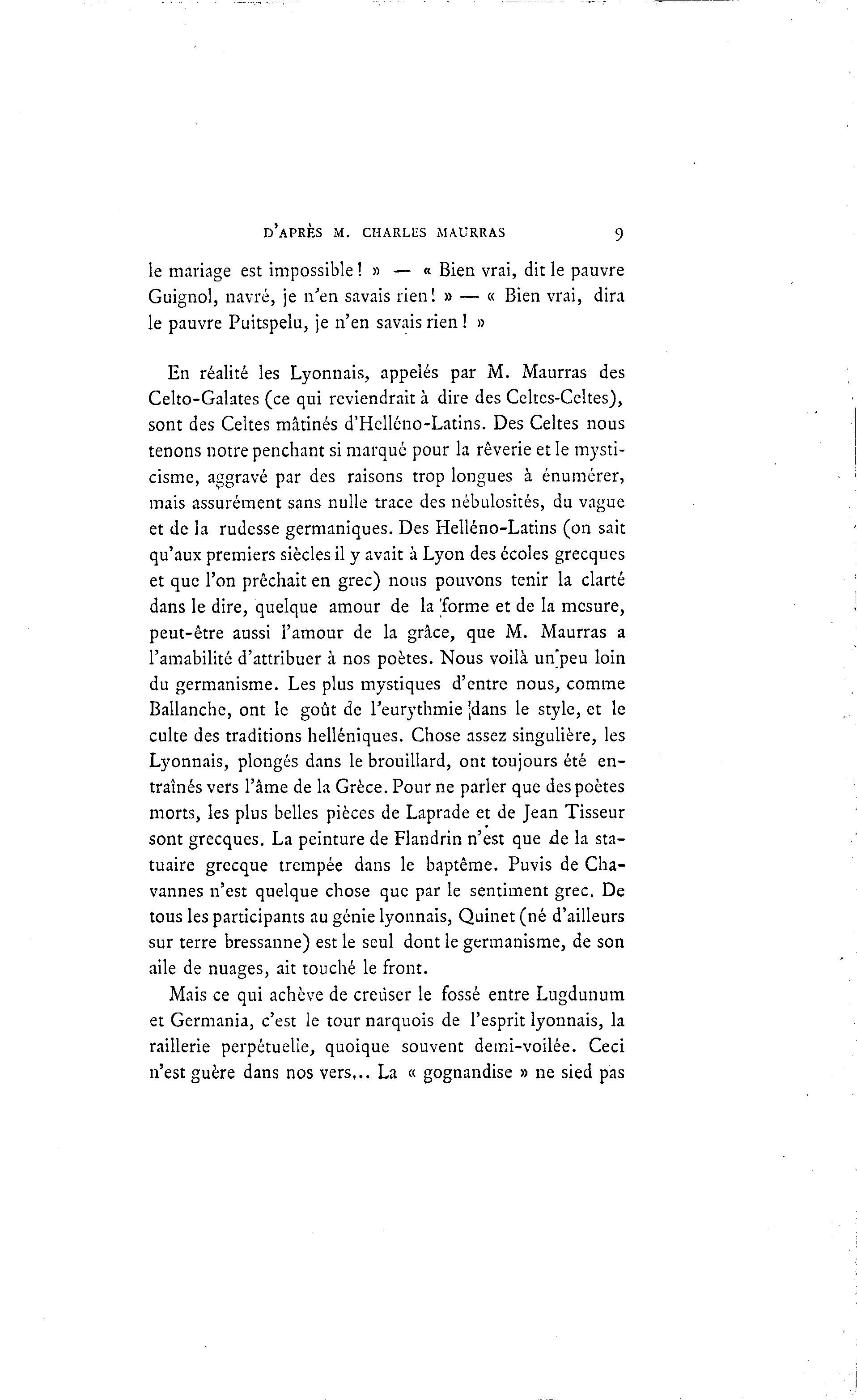 D'APRÈS M. CHARLES MAURRAS 9 le mariage est impossible ! » — « Bien vrai, dit le pauvre Guignol, navré, je n'en savais rien ! » — « Bien vrai, dira le pauvre Puitspelu, je n'en savais rien ! » En réalité les Lyonnais, appelés par M. Maurras des Celto-Galates (ce qui reviendrait à dire des Celtes-Celtes), sont des Celtes mâtinés d'Helléno-Latins. Des Celtes nous tenons notre penchant si marqué pour la rêverie et le mysti- cisme, aggravé par des raisons trop longues à énumérer, mais assurément sans nulle trace des nébulosités, du vague et de la rudesse germaniques. Des Helléno-Latins (on sait qu'aux premiers siècles il y avait à Lyon des écoles grecques et que l'on prêchait en grec) nous pouvons tenir la clarté dans le dire, quelque amour de la forme et de la mesure, peut-être aussi l'amour de la grâce, que M. Maurras a l'amabilité d'attribuer à nos poètes. Nous voilà un'peu loin du germanisme. Les plus mystiques d'entre nous, comme Ballanche, ont le goût de l'eurythmie Jdans le style, et le culte des traditions helléniques. Chose assez singulière, les Lyonnais, plongés dans le brouillard, ont toujours été en- traînés vers l'âme de la Grèce. Pour ne parler que des poètes morts, les plus belles pièces de Laprade et de Jean Tisseur sont grecques. La peinture de Flandrin n'est que de la sta- tuaire grecque trempée dans le baptême. Puvis de Cha- vannes n'est quelque chose que par le sentiment grec. De tous les participants au génie lyonnais, Quinet (né d'ailleurs sur terre bressanne) est le seul dont le germanisme, de son aile de nuages, ait touché le front. Mais ce qui achève de creuser le fossé entre Lugdunum et Germania, c'est le tour narquois de l'esprit lyonnais, la raillerie perpétuelle, quoique souvent demi-voilée. Ceci n'est guère dans nos vers,., La « gognandise » ne sied pas