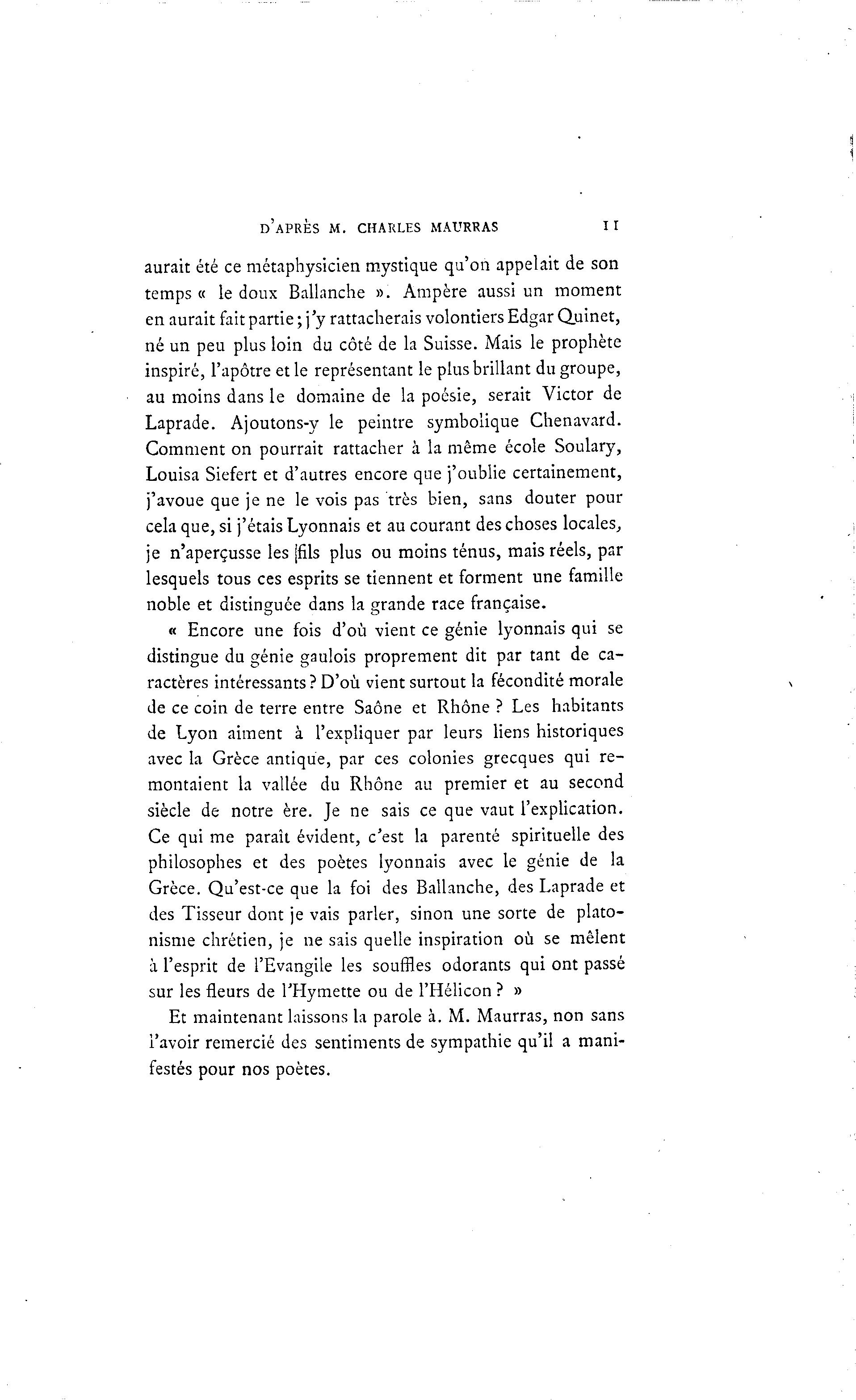 D'APRÈS M. CHARLES MAURRAS II aurait été ce métaphysicien mystique qu'on appelait de son temps « le doux Ballanche ». Ampère aussi un moment en aurait fait partie ; j'y rattacherais volontiers Edgar Quinet, né un peu plus loin du côté de la Suisse. Mais le prophète inspiré, l'apôtre et le représentant le plus brillant du groupe, au moins dans le domaine de la poésie, serait Victor de Laprade. Ajoutons-y le peintre symbolique Chenavard. Comment on pourrait rattacher à la même école Soulary, Louisa Siefert et d'autres encore que j'oublie certainement, j'avoue que je ne le vois pas très bien, sans douter pour cela que, si j'étais Lyonnais et au courant des choses locales, je n'aperçusse les [fils plus ou moins ténus, mais réels, par lesquels tous ces esprits se tiennent et forment une famille noble et distinguée dans la grande race française. « Encore une fois d'où vient ce génie lyonnais qui se distingue du génie gaulois proprement dit par tant de ca- ractères intéressants? D'où vient surtout la fécondité morale de ce coin de terre entre Saône et Rhône ? Les habitants de Lyon aiment à l'expliquer par leurs liens historiques avec la Grèce antique, par ces colonies grecques qui re- montaient la vallée du Rhône au premier et au second siècle de notre ère. Je ne sais ce que vaut l'explication. Ce qui me paraît évident, c'est la parenté spirituelle des philosophes et des poètes lyonnais avec le génie de la Grèce. Qu'est-ce que la foi des Ballanche, des Laprade et des Tisseur dont je vais parler, sinon une sorte de plato- nisme chrétien, je ne sais quelle inspiration où se mêlent à l'esprit de l'Evangile les souffles odorants qui ont passé sur les fleurs de THymette ou de l'Hélicon ? » Et maintenant laissons la parole à . M. Maurras, non sans l'avoir remercié des sentiments de sympathie qu'il a mani- festés pour nos poètes.