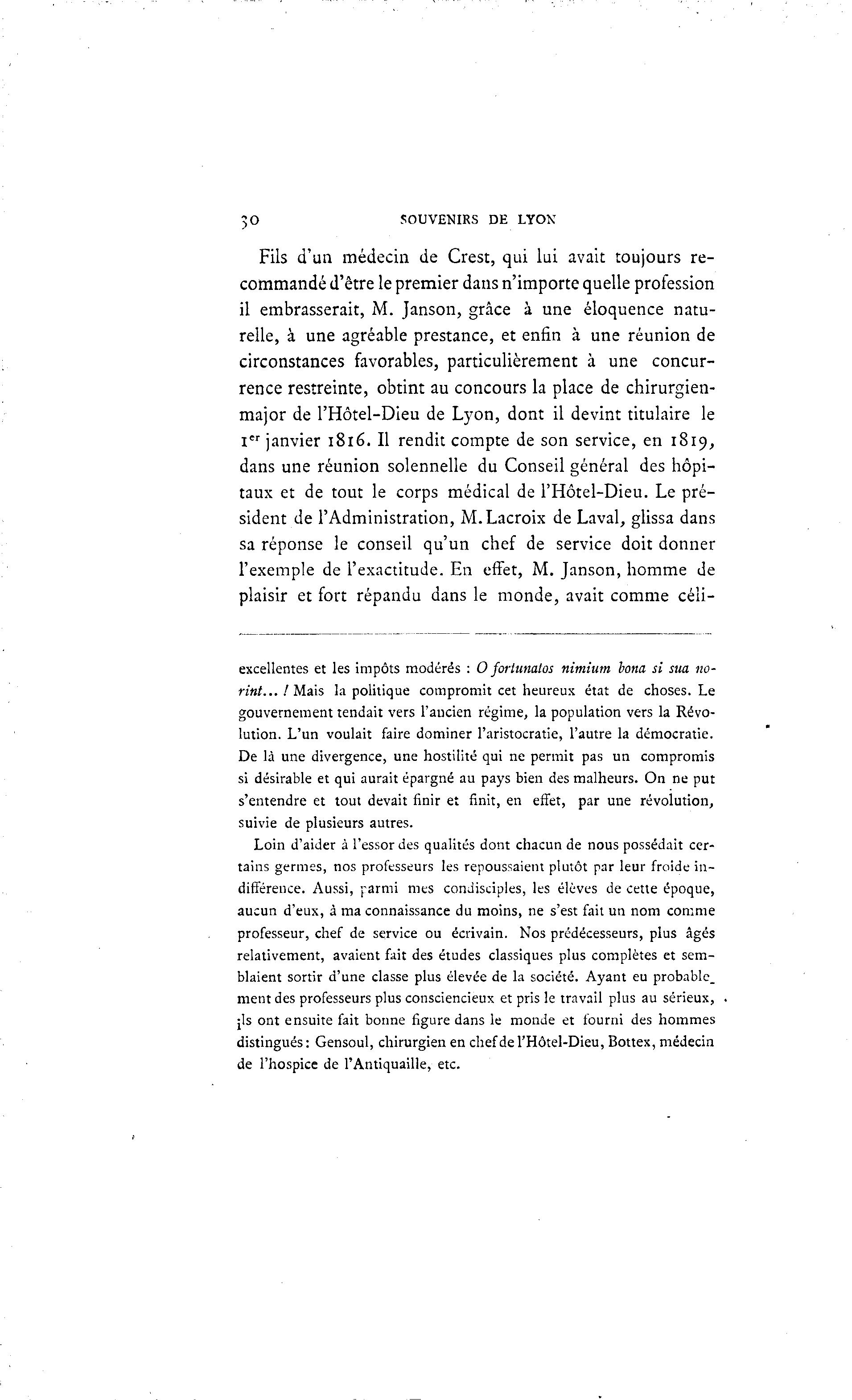 30 SOUVENIRS DE LYOX Fils d'un médecin de Crest, qui lui avait toujours re- commandé d'être le premier dans n'importe quelle profession il embrasserait, M. Janson, grâce à une éloquence natu- relle, à une agréable prestance, et enfin à une réunion de circonstances favorables, particulièrement à une concur- rence restreinte, obtint au concours la place de chirurgien- major de l'Hôtel-Dieu de Lyon, dont il devint titulaire le i " janvier 1816. Il rendit compte de son service, en 1819, dans une réunion solennelle du Conseil général des hôpi- taux et de tout le corps médical de l'Hôtel-Dieu. Le pré- sident de l'Administration, M.Lacroix de Laval, glissa dans sa réponse le conseil qu'un chef de service doit donner l'exemple de l'exactitude. En effet, M. Janson, homme de plaisir et fort répandu dans le monde, avait comme céli- excellentes et les impôts modérés : O fortunatos nimium botta si sua 110- rint... ! Mais la politique compromit cet heureux état de choses. Le gouvernement tendait vers l'ancien régime, la population vers la Révo- lution. L'un voulait faire dominer l'aristocratie, l'autre la démocratie. De là une divergence, une hostilité qui ne permit pas un compromis si désirable et qui aurait épargné au pays bien des malheurs. On ne put s'entendre et tout devait finir et finit, en effet, par une révolution, suivie de plusieurs autres. Loin d'aider à l'essor des qualités dont chacun de nous possédait cer- tains germes, nos professeurs les repoussaient plutôt par leur froide in- différence. Aussi, parmi mes condisciples, les élèves de cette époque, aucun d'eux, à ma connaissance du moins, ne s'est fait un nom comme professeur, chef de service ou écrivain. Nos prédécesseurs, plus âgés relativement, avaient fait des études classiques plus complètes et sem- blaient sortir d'une classe plus élevée de la société. Ayant eu probable^ ment des professeurs plus consciencieux et pris le travail plus au sérieux, ;ls ont ensuite fait bonne figure dans le monde et fourni des hommes distingués: Gensoul, chirurgien en chefdel'Hôtel-Dieu, Bottex, médecin de l'hospice de l'Antiquaille, etc.