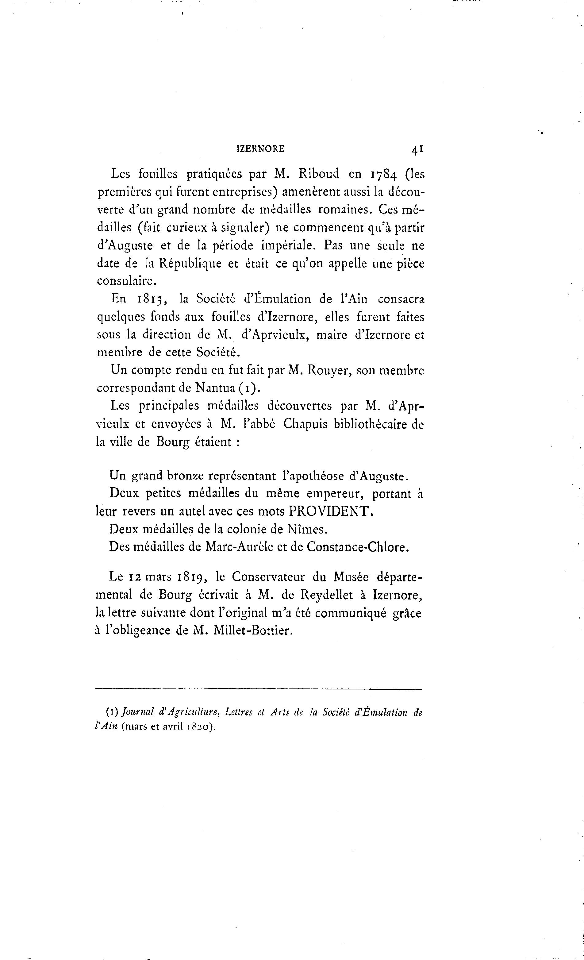 IZERNORE 41 Les fouilles pratiquées par M. Riboud en 1784 (les premières qui furent entreprises) amenèrent aussi la décou- verte d'un grand nombre de médailles romaines. Ces mé- dailles (fait curieux à signaler) ne commencent qu'à partir d'Auguste et de la période impériale. Pas une seule ne date de la République et était ce qu'on appelle une pièce consulaire. En 1813, la Société d'Émulation de l'Ain consacra quelques fonds aux fouilles d'Izernore, elles furent faites sous la direction de M. d'Aprvieulx, maire d'Izernore et membre de cette Société. Un compte rendu en fut fait par M. Rouyer, son membre correspondant de Nantua (1). Les principales médailles découvertes par M. d'Apr- vieulx et envoyées à M. l'abbé Chapuis bibliothécaire de la ville de Bourg étaient : Un grand bronze représentant l'apothéose d'Auguste. Deux petites médailles du même empereur, portant à leur revers un autel avec ces mots PROVIDENT. Deux médailles de la colonie de Nîmes. Des médailles de Marc-Aurèle et de Constance-Chlore. Le 12 mars 1819, le Conservateur du Musée départe- mental de Bourg écrivait à M. de Reydellet à Izernore, la lettre suivante dont l'original m'a été communiqué grâce à l'obligeance de M. Millet-Bottier. (1) Journal d'Agriculture, Lettres et Arts de la Société d'Emulation de l'Ain (mars et avril 1820).
